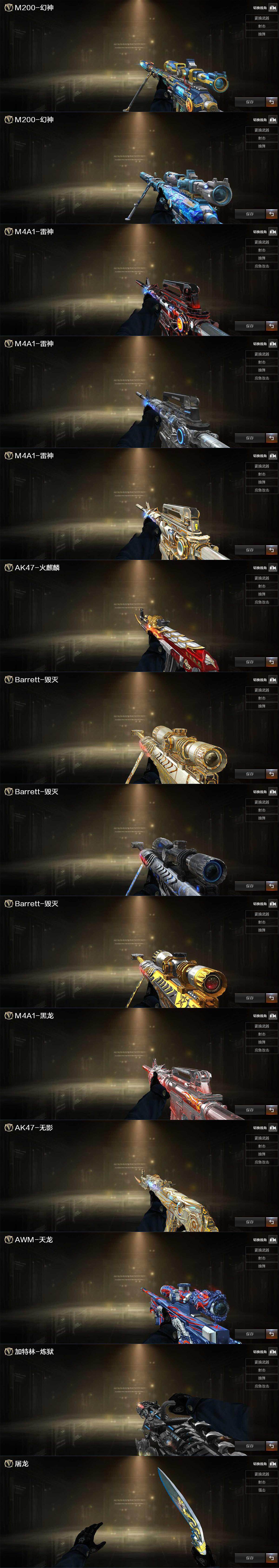 【音效卡】:AK47-火麒麟音效卡,M4A1-雷神音效卡,M4A1-黑骑士音效卡,Barrett-毁灭音效卡
