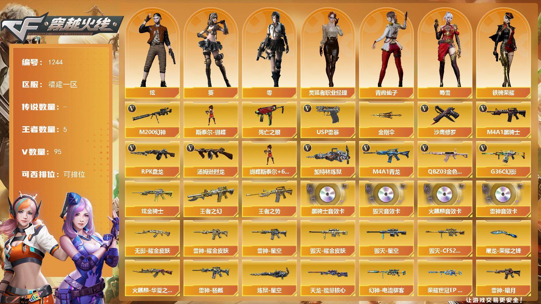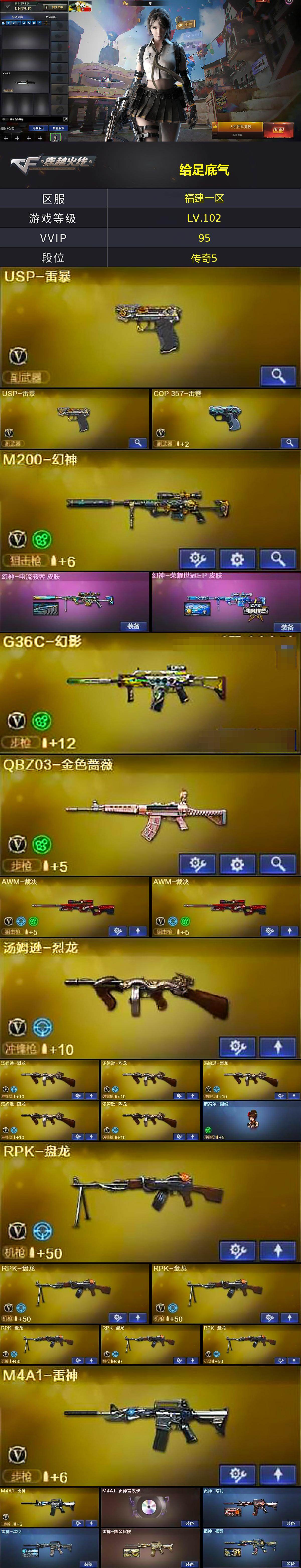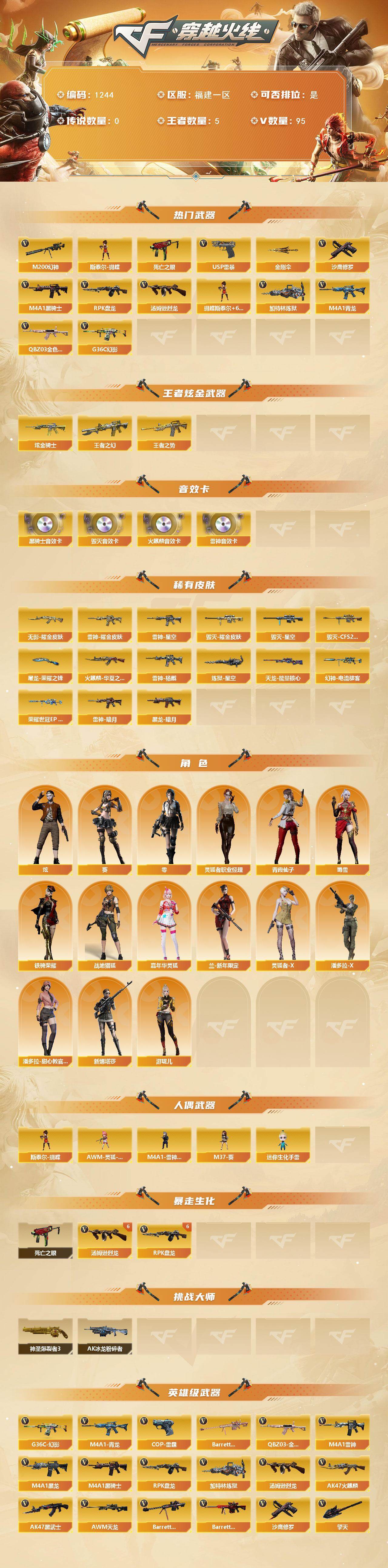 [17053126]福建一区-98V-5王者武器数-1炫金武器数 【热门武器】:G36C-幻影,QBZ03-金色蔷薇,M4A1-青龙,M200-幻神,死亡之眼,M4A1-黑骑士*2,汤姆逊-烈龙*6,RPK-盘龙*6,加特林-炼狱,斯泰尔-蝴蝶,USP-雷暴*2,沙鹰-修罗*6,金刚伞 【王者炫金武器】:王者之幻,王者之势,炫金骑士 【音效卡】:AK47-火麒麟音效卡,M4A1-雷神音效卡,M4A1-黑骑士音效卡,Barrett-毁灭音效卡 【皮肤】:幻神-电流骇客 皮肤,幻神-荣耀世冠EP 皮肤,雷神-暗月,雷神-星空,雷神-耀金皮肤,雷神-杨戬,火麒麟-华夏之心,毁灭耀金皮肤,毁灭-星空,毁灭-CFS2020,黑龙-暗月,无影耀金皮肤,天龙-能量核心,炼狱-星空,屠龙-荣耀之锋 【角色】:零,葵,炫,战地猎狐,嘉年华灵狐,兰-新年限定,灵狐者-X,灵狐者-职业经理,潘多拉-X,潘多拉-甜心教官,青霞仙子,蜀雪,铁骑荣耀,新娜塔莎,游珑儿 【人偶武器】:M4A1-雷神-精英刀锋,斯泰尔-蝴蝶,AWM-灵狐-15周年嘉年华,M37-葵,迷你生化手雷*2 【暴走生化】:死亡之眼 【挑战大师】:神圣爆裂者III,AK47-冰龙粉碎者 【英雄级武器】:AK47-火麒麟,M4A1-黑龙,M4A1-雷神*2,M4A1-黑骑士*2,AK47-黑武士,AK47-黑鲨,M4A1-雷霆,AK47-雷暴,M4A1-青龙,G36C-幻影,黑武士-锦绣游龙,QBZ03-金色蔷薇,王者之心-觉醒版,王者之影-觉醒版,AWM-天龙,Barrett-毁灭,Barrett-极光,AWM-裁决*2,M200-幻神,Barrett-朱雀,Barrett-金色蔷薇,RPK-盘龙*6,加特林-炼狱,汤姆逊-烈龙*6,AA-12-雷霆*2,沙鹰-修罗*6,USP-雷暴*2,COP-雷霆,屠龙*4,龙啸,擎天,麒麟刺*4,斩神刀-雷暴,王者之击-觉醒版,高爆手雷-雷霆*5,高爆手雷-雷暴*5,闪光弹-雷霆*5,闪光弹-雷暴*5,烟雾弹-雷霆*5,烟雾弹-雷暴*5,M4A1-赤狱骑士 【道具】:EP战队炫彩背包,全能枪王背包,炫彩背包,哔哩哔哩名片,救世主-黑桃战神,绿色巨人,灵魂忍者,变异宝贝,迷雾幽灵,夺命之镰,防化服*3,金色流光-枪王排位*2,星辰流光-枪王排位,枪王排位28赛季金色流光,枪王排位29赛季金色流光,EP战