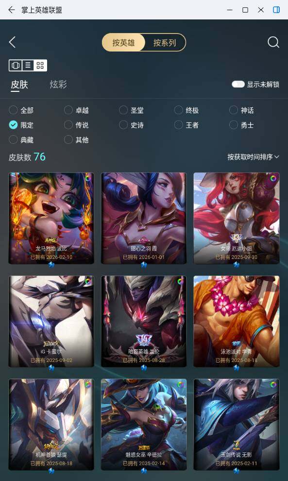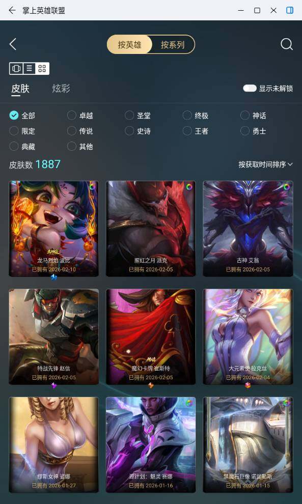 [17054342]未定级段位-172英雄-425皮肤-290炫彩-1终极-16神话-76限定-41传说-60史诗