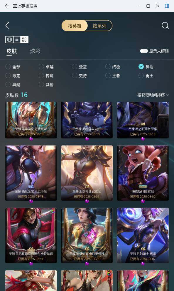 【神话皮肤】:十周年纪念安妮,源代码乐芙兰,殿堂传奇乐芙兰,神凰行者瑞羽圣凰艾尼维亚,海克斯科技安妮,海克斯科技克格莫,至臻至高天凯尔,至臻绝息圣堂厄运小姐,至臻墨之影武者亚索,至臻神凰行者烈羽焰凰霞,至臻月蚀骑士赛娜,至臻玉剑传说武剑仙