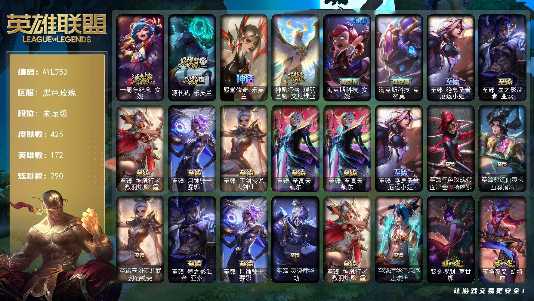 [17054342]未定级段位-172英雄-425皮肤-290炫彩-1终极-16神话-76限定-41传说-60史诗 【神话皮肤】:十周年纪念安妮,源代码乐芙兰,殿堂传奇乐芙兰,神凰行者瑞羽圣凰艾尼维亚,海克斯科技安妮,海克斯科技克格莫,至臻至高天凯尔,至臻绝息圣堂厄运小姐,至臻墨之影武者亚索,至臻神凰行者烈羽焰凰霞,至臻月蚀骑士赛娜,至臻玉剑传说武剑仙 【热门头像】:卡特琳娜的匕首头像,银河魔装机神安妮头像 【至臻皮肤】:至臻至高天凯尔,至臻绝息圣堂厄运小姐,至臻黑色玫瑰假面舞会卡特琳娜,至臻剪纸仙灵卡西奥佩娅,至臻玉剑传说武剑仙锐雯,至臻墨之影武者亚索,至臻月蚀骑士赛娜,至臻灵魂莲华劫,至臻神凰行者烈羽焰凰霞,至臻莲华温泉厄斐琉斯 【臻彩皮肤】:天龙之子卡莎飞龙乘云,无畏骑士瑟庄妮赤子初心,墨之影武者亚索金墨耀影,幻灵白鸽萨勒芬妮梦幻强袭,花仙子拉克丝纹白,青花瓷艾瑞莉娅月色,霸天战士雷恩加尔星啸天火,霸天异形卡兹克掠空魅影,天煞劫恒星游历者,星之守护者金克丝黑洞,西部天使赛娜贝利尔之怠,玉剑传说苍鸾丁香,殿堂传奇乐芙兰登神,春晖神女艾希玉露金风,咖啡甜心格温酒醉樱桃,战斗学院盖伦不死鸟,魔女阿卡丽虚荣,净雪之月莫甘娜冬虹,水晶玫瑰迦娜甜蜜花蕾 【年限皮肤】:紫金罗刹莫甘娜,玉净夜叉凯特琳,张辽文远,虎痴之拳蔚,金猪烈焰瑟庄妮,烈焰美人薇恩,王国机神苍狼瑟提,福牛守护者厄斐琉斯,福牛守护者嘉文四世,龙腾虎跃瑟提,天龙之子易,天龙之子伊泽瑞尔,天龙之子黛安娜,天龙之子卡莎,天龙之子斯莫德,点心宝贝阿木木,龙马烈焰波比 【海克斯皮肤】:海克斯科技安妮,海克斯科技克格莫 【情人节限定】:甜心宝贝安妮,甜心宝贝娑娜,甜心之羽霞,觅心猎手薇恩,觅心之翼奎因,觅心魔灵奥莉安娜 【冰雪限定】:圣诞开心鬼提莫,圣诞糖果棒厄运小姐,圣诞狂欢基兰,胡桃夹子萨科,冬季仙境卡尔玛,夺命美人卡特琳娜,冬季仙境奥莉安娜,雪默丁格,魄罗骑士瑟庄妮,寒冬精灵璐璐,冰雪兽纳尔 【终极皮肤】:大元素使拉克丝 【限定皮肤】:冠军之刃锐雯,冠军之刃锐雯2016,冠军蔷薇乐芙兰,Fnatic嘉文四世,暗杀星努努和威朗普,暗杀星慎,SKTT1贾克斯,SKTT1劫,SKTT1婕拉,SKTT1雷克顿,SKTT1瑞兹,SKTT1奥拉夫,SKTT1辛德拉,SSG塔莉垭,SSG霞,iG卡蜜尔,iG卡莎,FPX墨菲特,EDG佐伊,玉剑传