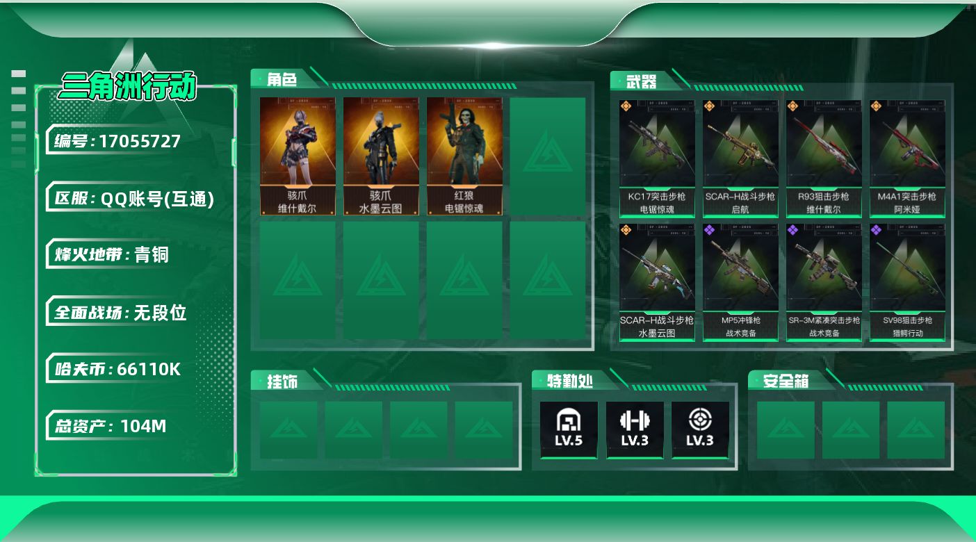 [17055727]【店主推荐捡漏号!可直接换绑】66110k哈伏币-99m流动资产-49烽火等级-青铜-1战场等级-无军衔 【干员外观】:骇爪-水墨云图,骇爪-维什戴尔,红狼-电锯惊魂 【近战皮肤】:近战-黑鹰 【传说外观】:M4A1突击步枪-阿米娅,SCAR-H战斗步枪-水墨云图,SCAR-H战斗步枪-启航,KC17突击步枪-电锯惊魂,R93狙击步枪-维什戴尔 【史诗外观】:MP5冲锋枪-战术竞备,SR-3M紧凑突击步枪-战术竞备,SV-98狙击步枪-猎鳄行动 【稀有外观】:M7战斗步枪-捣蛋鬼,SCAR-H战斗步枪-荣耀列队,腾龙突击步枪-冰天雪地,MP5冲锋枪-哈夫克卫队,P90冲锋枪-黄昏,P90冲锋枪-捣蛋鬼,UZI冲锋枪-前沿科技,UZI冲锋枪-亚特兰蒂斯,野牛冲锋枪-前沿科技,SMG-45-行动开启,M1014霰弹枪-幻影结构,QJB201轻机枪-哈夫克卫队,SKS射手步枪-弄臣 【普通外观】:M4A1突击步枪-粉色涂装,M4A1突击步枪-高雅黑,M4A1突击步枪-海色,QBZ95-1突击步枪-高雅黑,QBZ95-1突击步枪-海浪,K416突击步枪-几何迷彩,K416突击步枪-高雅黑,M16A4突击步枪-高雅黑,AUG突击步枪-浅蓝涂装,M7战斗步枪-红色涂装,SG552突击步枪-海浪,SCAR-H战斗步枪-数码迷彩,G3战斗步枪-高雅黑,PTR-32突击步枪-黄蜂,MP5冲锋枪-海色,MP5冲锋枪-黄蜂,Vector冲锋枪-几何迷彩,UZI冲锋枪-海色,M1014霰弹枪-高雅黑,M250通用机枪-条纹,SVD狙击步枪-高雅黑,SR-25射手步枪-黄蜂,QSZ92G-条纹,沙漠之鹰-高雅黑 【载具外观】:轮式突击炮-荣耀 【军牌】:军牌-装备修理,军牌-享受音乐,军牌-零号大坝,军牌-信誉优秀,军牌-小心鳄鱼 【挂饰】:挂饰-维什戴尔,挂饰-诡影喷火兵,挂饰-崩岩重炮,挂饰-启程