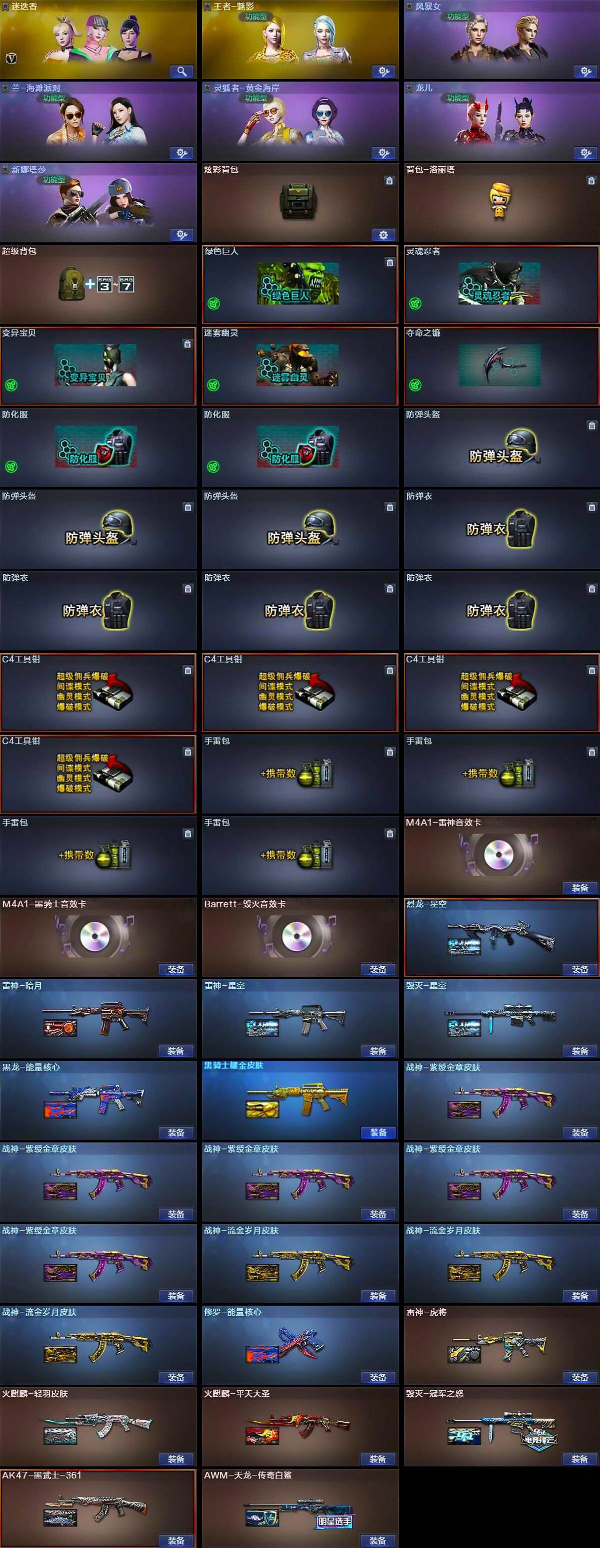 【道具】:炫彩背包,背包-洛丽塔,超级背包,绿色巨人,灵魂忍者,变异宝贝,迷雾幽灵,夺命之镰,防化服*2,防弹头盔*3,防弹衣*4,C4工具钳*4,手雷包*4