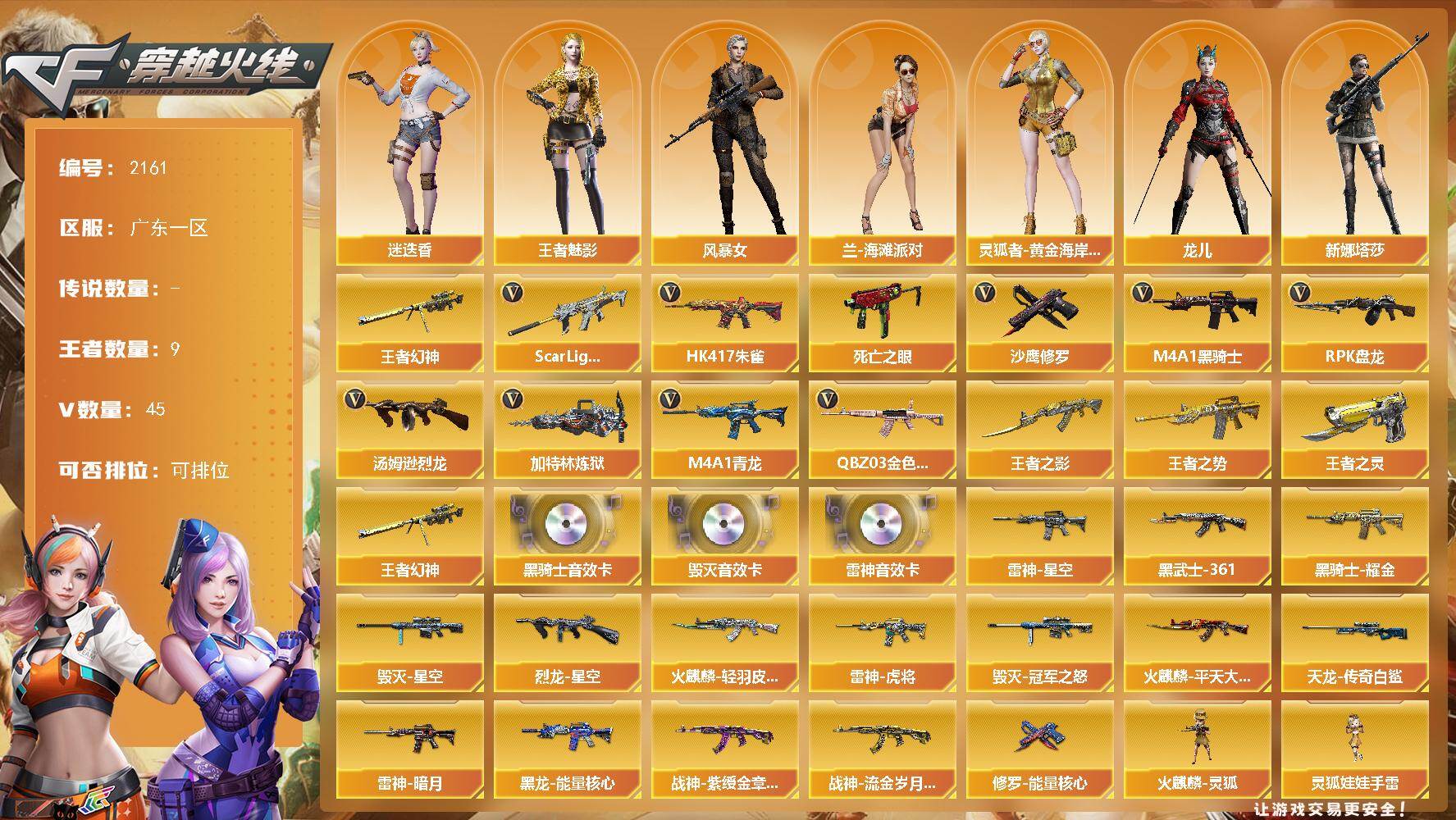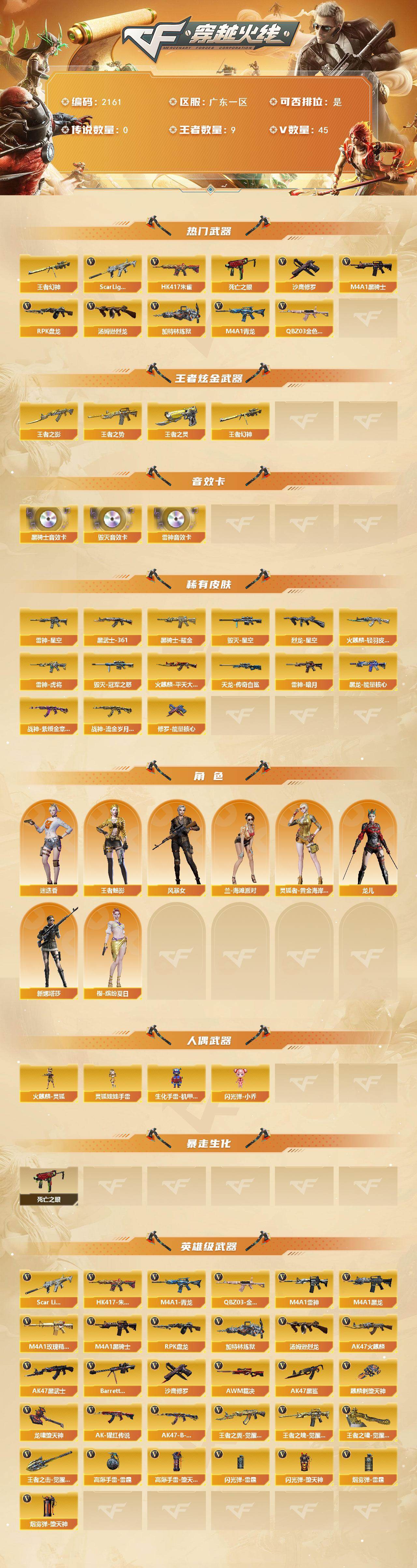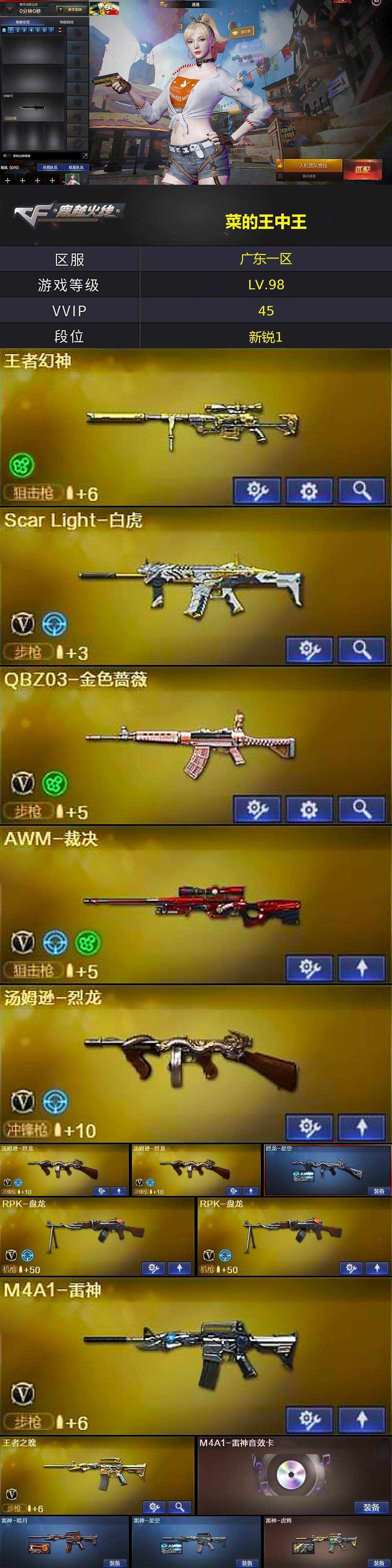 [17055826]广东一区-49V-9王者武器数-0炫金武器数 【热门武器】:王者幻神,QBZ03-金色蔷薇,Scar Light-白虎,HK417-朱雀,M4A1-青龙,死亡之眼,M4A1-黑骑士,汤姆逊-烈龙*3,RPK-盘龙*2,加特林-炼狱*2,沙鹰-修罗*2 【王者炫金武器】:王者之势,王者之影,王者幻神,王者之灵*2 【音效卡】:M4A1-雷神音效卡,M4A1-黑骑士音效卡,Barrett-毁灭音效卡 【皮肤】:烈龙-星空,雷神-暗月,雷神-星空,雷神-虎将,火麒麟-轻羽皮肤,火麒麟-平天大圣,毁灭-星空,毁灭-冠军之怒,黑龙-能量核心,黑骑士耀金皮肤,AK47-黑武士-361,战神-紫绶金章皮肤*5,战神-流金岁月皮肤*3,AWM-天龙-传奇白鲨,修罗-能量核心 【角色】:迷迭香,王者-魅影,风暴女,兰-海滩派对,灵狐者-黄金海岸,龙儿,新娜塔莎,樱-缤纷夏日 【人偶武器】:火麒麟-灵狐,生化手雷-机甲核心,闪光弹-小乔,灵狐娃娃手雷 【暴走生化】:死亡之眼 【英雄级武器】:AK47-火麒麟,M4A1-黑龙*3,M4A1-雷神,M4A1-黑骑士,AK47-黑武士,AK47-黑鲨,M4A1-青龙,HK417-朱雀,Scar Light-白虎,M4A1-玫瑰精灵*3,QBZ03-金色蔷薇,王者之翼-觉醒版,王者之魄-觉醒版,AK-47-猩红传说*2,AK47-B-战神,Barrett-毁灭,AWM-裁决,RPK-盘龙*2,加特林-炼狱*2,汤姆逊-烈龙*3,沙鹰-修罗*2,麒麟刺-堕天神,龙啸-堕天神,王者之啸-觉醒版,王者之击-觉醒版,高爆手雷-雷霆,高爆手雷-堕天神*2,闪光弹-雷霆,闪光弹-堕天神*2,烟雾弹-雷霆,烟雾弹-堕天神*2 【道具】:炫彩背包,背包-洛丽塔,超级背包,绿色巨人,灵魂忍者,变异宝贝,迷雾幽灵,夺命之镰,防化服*2,防弹头盔*3,防弹衣*4,C4工具钳*4,手雷包*4 【特殊枪械】:1白虎,1黑骑士,3烈龙,2盘龙,2炼狱