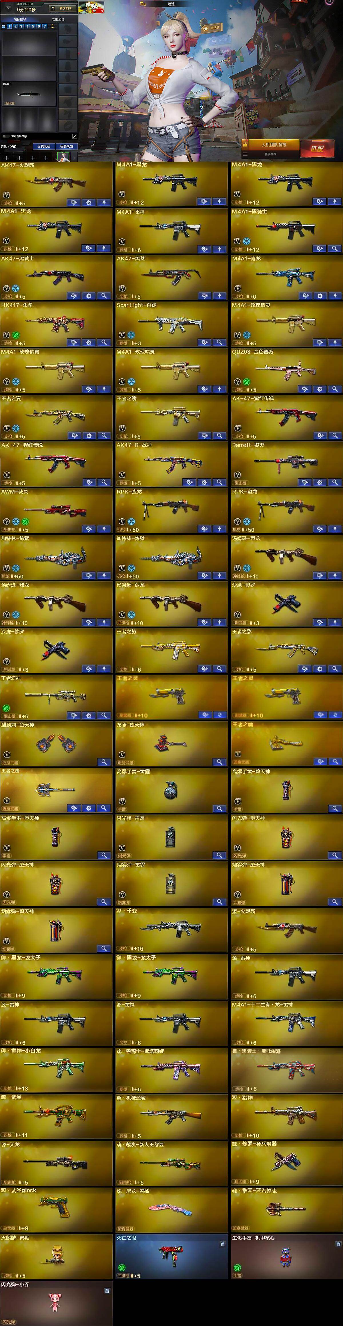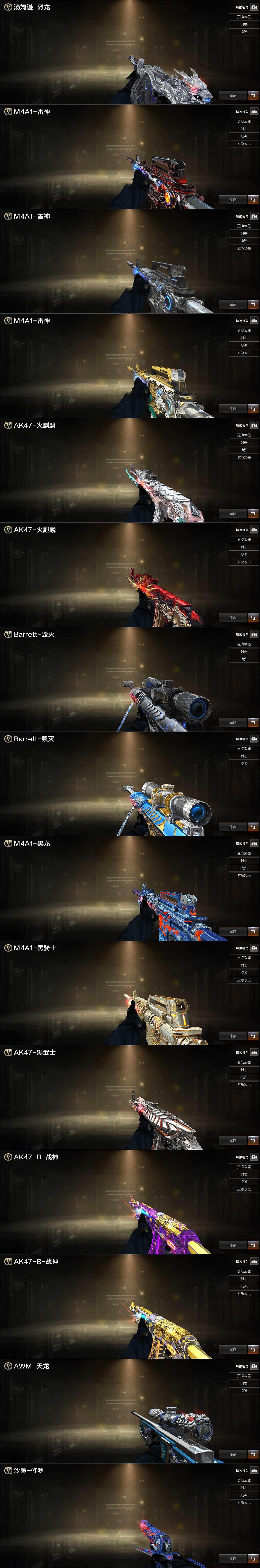 【热门武器】:王者幻神,QBZ03-金色蔷薇,Scar Light-白虎,HK417-朱雀,M4A1-青龙,死亡之眼,M4A1-黑骑士,汤姆逊-烈龙*3,RPK-盘龙*2,加特林-炼狱*2,沙鹰-修罗*2