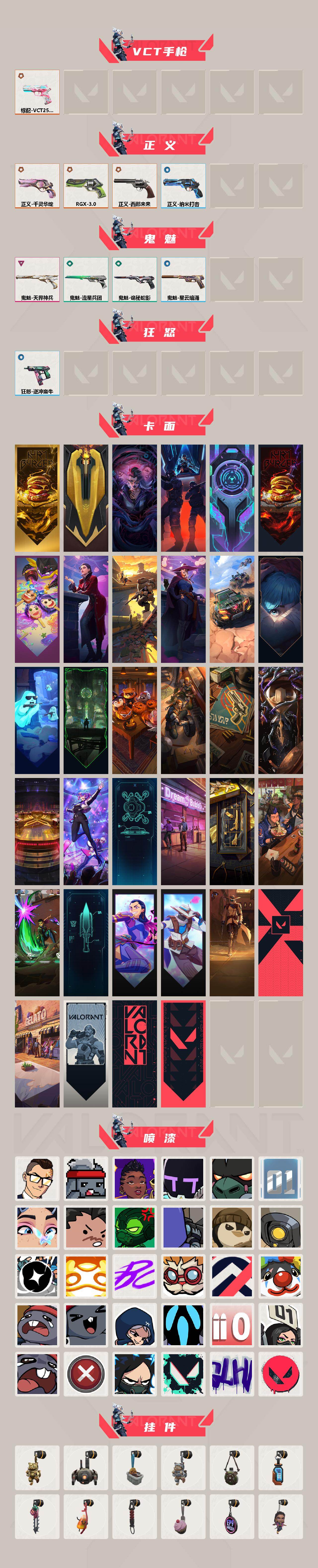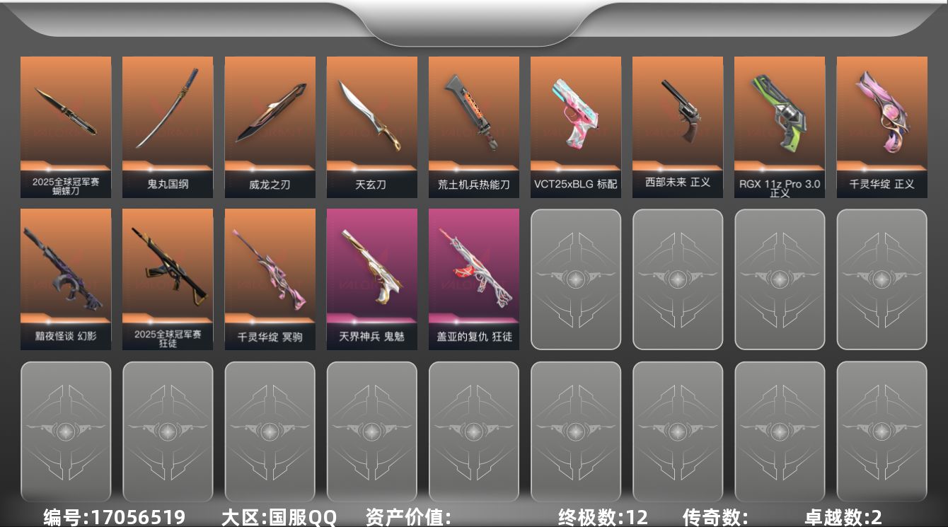 [17056519]【107】【套装】:2025全球冠军赛套装 【英雄】:幻棱,炼狱,维斯,暮蝶,钛狐,壹决,铁臂,捷风,雷兹,幽影,不死鸟,贤者,猎枭,蝰蛇,零,芮娜,奇乐,尚勃勒,霓虹,斯凯,夜露,星礈,K/O,海神,盖可,黑梦,钢锁 【近战武器】:近战武器-2025全球冠军赛 蝴蝶刀,近战武器-威龙之刃,近战武器-鬼丸国纲,近战武器-荒土机兵 热能刀,近战武器-天玄刀 【狂徒】:狂徒-2025全球冠军赛,狂徒-盖亚的复仇,狂徒-荒土机兵 【幻影】:幻影-黯夜怪谈,幻影-纳米打击 【戍卫】:戍卫-逆冲蛮牛 【獠犬】:獠犬-逆冲蛮牛 【冥驹】:冥驹-千灵华绽,冥驹-荒土机兵 【奥丁】:奥丁-纳米打击 【判官】:判官-纳米打击x 【雄鹿】:雄鹿-逆冲蛮牛 【骇灵】:骇灵-荒土机兵 【标配】:标配-荒土机兵 【VCT手枪】:标配-VCT25 x BLG 【正义】:正义-RGX 11z Pro//3.0,正义-千灵华绽,正义-西部未来,正义-纳米打击 【鬼魅】:鬼魅-天界神兵,鬼魅-流星兵团,鬼魅-诡秘蛇影,鬼魅-星云暗涌 【狂怒】:狂怒-逆冲蛮牛 【卡面】:终章:激斗汉堡 卡面,进入射程 卡面,分崩离析 卡面,纳米打击 卡面,抑制技术 卡面,激斗汉堡 卡面,瓦娃脸雪糕 P2 卡面,从黄昏到黎明 卡面,荒土机兵 卡面,银弹猎手 卡面,逆冲蛮牛 卡面,《双城之战》拥抱 卡面,精灵大战 卡面,欢迎来到底城 卡面,南瓜盛典 卡面,修车达人 卡面,正义的化身 卡面,时间到 卡面,最高舞台 卡面,超能偶像 卡面,声感陷阱设计图 卡面,梦幻奶茶 卡面,终章:打造专属狂徒 卡面,趁热吃 卡面,源能反应 卡面,零点嗅探设计图 卡面,无畏契约GO!第一卷:芮娜 卡面,无畏契约GO!第一卷:零 卡面,没有什么能逃过我的眼睛 卡面,代号红色 卡面,冰淇淋店 卡面,新兵报到 卡面,V契约 卡面,无畏契约 卡面 【喷漆】:小小心意 喷漆,战“素”兔 喷漆,宇宙的指引 喷漆,请求重启 喷漆,逆冲蛮牛 喷漆,纳米打击 喷漆,鼻尖上的蝴蝶 喷漆,简笔画黯兽 喷漆,独守蝰腹 喷漆,他们将落荒而逃 喷漆,通缉:战术企鹅 喷漆,荒土机兵 喷漆,别挡我吃球! 喷漆,嗨宝南瓜灯 喷漆,嘭! 喷漆,都算到了 喷漆,控场勿近 喷漆,小丑猫 喷漆,熊抱 喷漆,超级粉丝 喷漆,捷风差距 喷漆,惊声尖叫 喷漆,拼一枪 喷漆,我觉得不行 喷