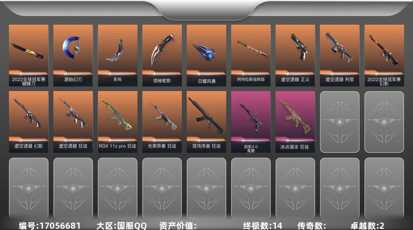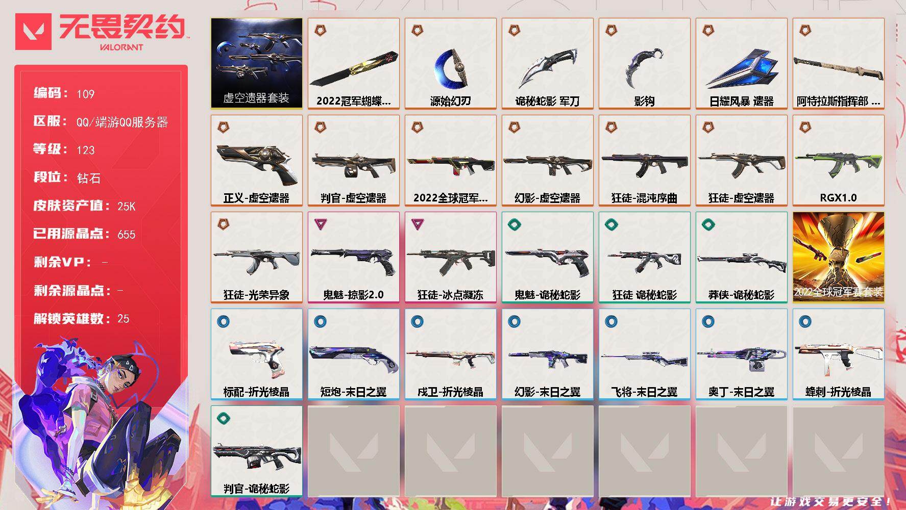 [17056681]【109】【套装】:2022全球冠军赛套装,虚空遗器套装 【英雄】:幻棱,炼狱,维斯,暮蝶,钛狐,壹决,铁臂,捷风,雷兹,幽影,不死鸟,贤者,猎枭,蝰蛇,零,芮娜,奇乐,尚勃勒,霓虹,斯凯,夜露,星礈,盖可,黑梦,钢锁 【近战武器】:近战武器-2022全球冠军赛 蝴蝶刀,近战武器-影钩,近战武器-源始幻刃,近战武器-诡秘蛇影 军刀,近战武器-日耀风暴 遗器,近战武器-阿特拉斯指挥部 甩棍 【狂徒】:狂徒-混沌序曲,狂徒-虚空遗器,狂徒-RGX 11z Pro,狂徒-光荣异象,狂徒-冰点凝冻,狂徒-诡秘蛇影 【幻影】:幻影-2022全球冠军赛,幻影-虚空遗器,幻影-末日之翼 【戍卫】:戍卫-折光棱晶 【飞将】:飞将-末日之翼 【莽侠】:莽侠-诡秘蛇影 【奥丁】:奥丁-末日之翼 【判官】:判官-虚空遗器,判官-诡秘蛇影 【蜂刺】:蜂刺-折光棱晶 【标配】:标配-折光棱晶 【正义】:正义-虚空遗器 【鬼魅】:鬼魅-掠影//2.0,鬼魅-诡秘蛇影 【短炮】:短炮-末日之翼 【卡面】:南瓜盛典 卡面,树懒大作战 卡面,红鳞松叶 卡面,无畏契约GO!第一卷:芮娜 卡面,无畏契约GO!第一卷:零 卡面,无垠星环 卡面,《双城之战》金克丝 卡面,代号红色 卡面,新兵报到 卡面,V契约 卡面,无畏契约 卡面 【喷漆】:皮蛋呼呼 喷漆,买装还是存钱 喷漆,放下武器 喷漆,胜利属于无畏契约 喷漆,GLHF 喷漆,无畏契约 喷漆 【挂饰】:V25第六幕:超凡 挂饰,动力机箱 挂饰,天外飞客 挂饰,无畏契约 纪念币 挂饰