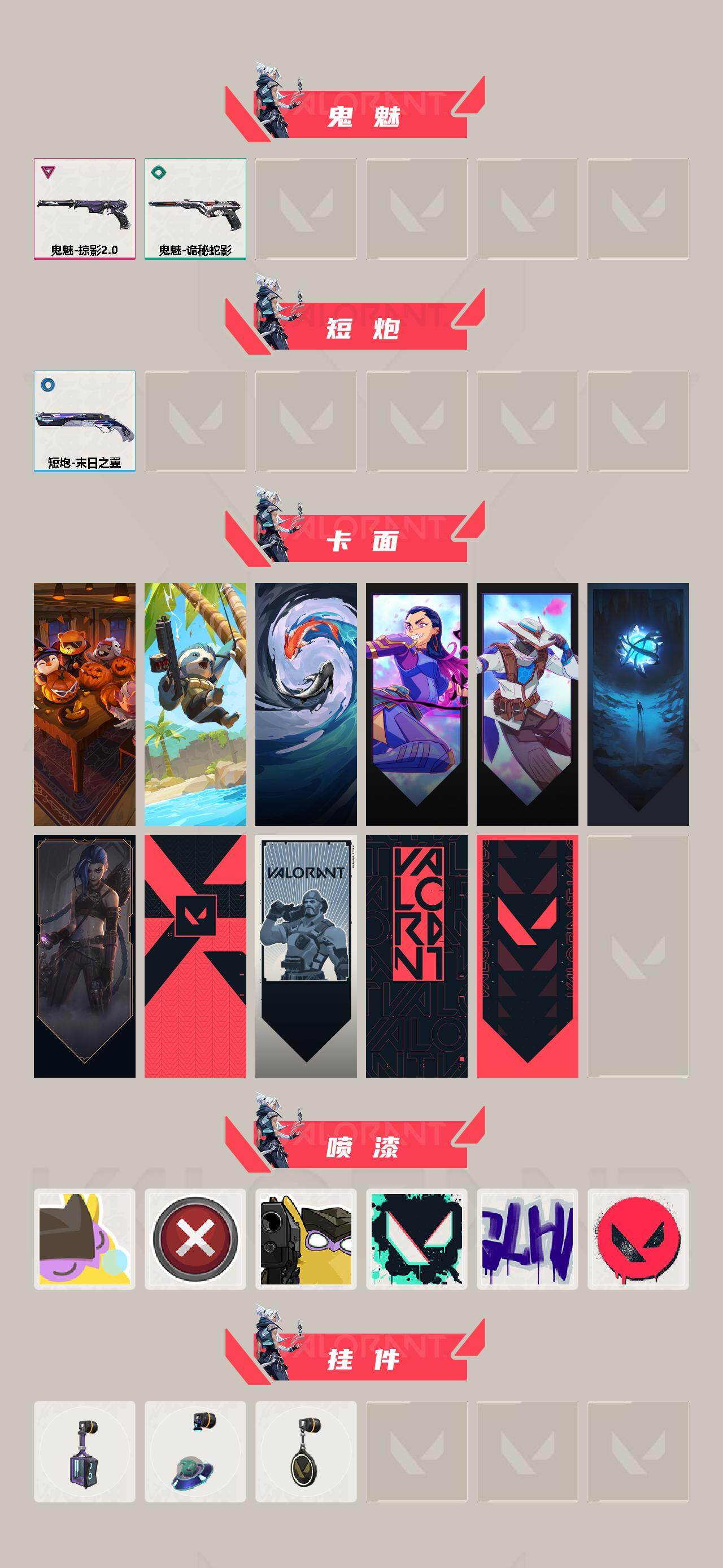 【卡面】:南瓜盛典 卡面,树懒大作战 卡面,红鳞松叶 卡面,无畏契约GO!第一卷:芮娜 卡面,无畏契约GO!第一卷:零 卡面,无垠星环 卡面,《双城之战》金克丝 卡面,代号红色 卡面,新兵报到 卡面,V契约 卡面,无畏契约 卡面