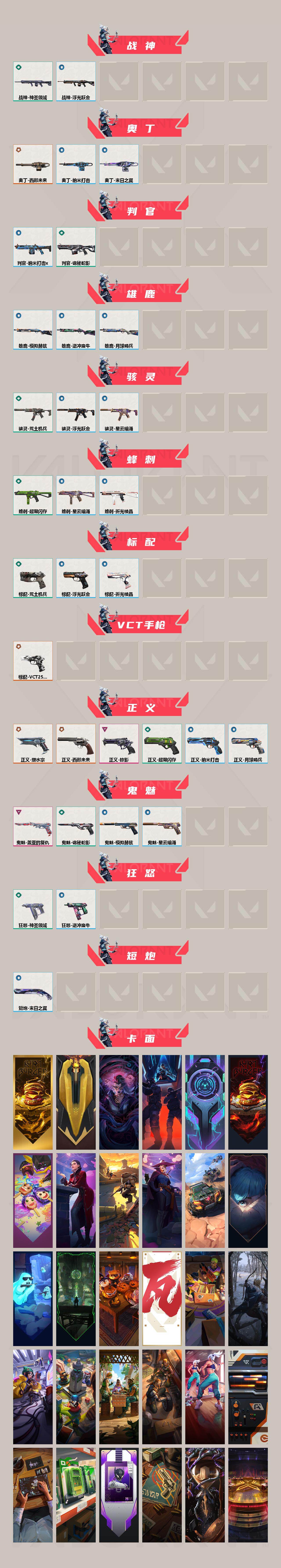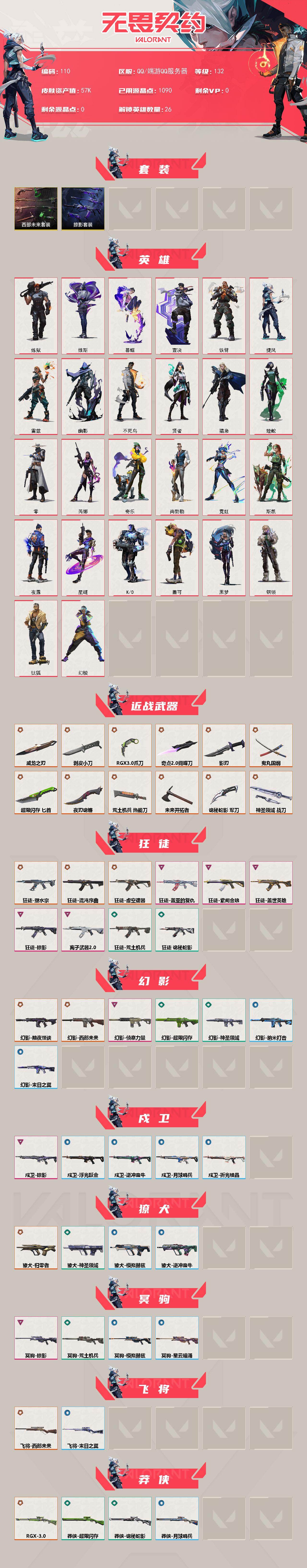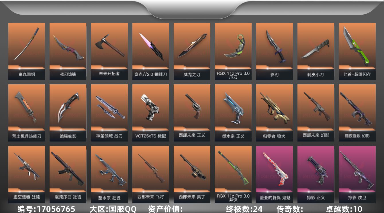 [17056765]【110】【套装】:西部未来套装,掠影套装 【英雄】:幻棱,炼狱,维斯,暮蝶,钛狐,壹决,铁臂,捷风,雷兹,幽影,不死鸟,贤者,猎枭,蝰蛇,零,芮娜,奇乐,尚勃勒,霓虹,斯凯,夜露,星礈,K/O,盖可,黑梦,钢锁 【近战武器】:近战武器-剥皮小刀,近战武器-奇点//2.0 蝴蝶刀,近战武器-RGX 11z Pro//3.0 爪刀,近战武器-威龙之刃,近战武器-鬼丸国纲,近战武器-未来开拓者,近战武器-超限闪存 匕首,近战武器-荒土机兵 热能刀,近战武器-夜刃诡镰,近战武器-影刃,近战武器-诡秘蛇影 军刀,近战武器-神圣领域 战刀 【狂徒】:狂徒-混沌序曲,狂徒-塑水宗,狂徒-虚空遗器,狂徒-掠影,狂徒-盖世英雄,狂徒-盖亚的复仇,狂徒-紫阙金琅,狂徒-离子武器//2.0,狂徒-荒土机兵,狂徒-诡秘蛇影 【幻影】:幻影-黯夜怪谈,幻影-西部未来,幻影-侦察力量,幻影-超限闪存,幻影-神圣领域,幻影-纳米打击,幻影-末日之翼,幻影-西部未来 【戍卫】:戍卫-掠影,戍卫-浮光跃金,戍卫-逆冲蛮牛,戍卫-月球哨兵,戍卫-折光棱晶 【獠犬】:獠犬-归零者,獠犬-神圣领域,獠犬-模拟赫兹,獠犬-逆冲蛮牛 【冥驹】:冥驹-掠影,冥驹-荒土机兵,冥驹-模拟赫兹,冥驹-星云暗涌 【飞将】:飞将-西部未来,飞将-末日之翼 【莽侠】:莽侠-RGX 11z Pro//3.0,莽侠-超限闪存,莽侠-诡秘蛇影,莽侠-月球哨兵 【战神】:战神-神圣领域,战神-浮光跃金 【奥丁】:奥丁-西部未来,奥丁-纳米打击,奥丁-末日之翼 【判官】:判官-诡秘蛇影,判官-纳米打击x 【雄鹿】:雄鹿-模拟赫兹,雄鹿-逆冲蛮牛,雄鹿-月球哨兵 【骇灵】:骇灵-荒土机兵,骇灵-浮光跃金,骇灵-星云暗涌 【蜂刺】:蜂刺-超限闪存,蜂刺-星云暗涌,蜂刺-折光棱晶 【标配】:标配-荒土机兵,标配-浮光跃金,标配-折光棱晶 【VCT手枪】:标配-VCT25 x TS 【正义】:正义-塑水宗,正义-西部未来,正义-掠影,正义-超限闪存,正义-纳米打击,正义-月球哨兵 【鬼魅】:鬼魅-盖亚的复仇,鬼魅-诡秘蛇影,鬼魅-模拟赫兹,鬼魅-星云暗涌 【狂怒】:狂怒-神圣领域,狂怒-逆冲蛮牛 【短炮】:短炮-末日之翼 【卡面】:终章:激斗汉堡 卡面,进入射程 卡面,分崩离析 卡面,纳米打击 卡面,抑制技术 卡面,激斗汉堡 卡面,瓦娃