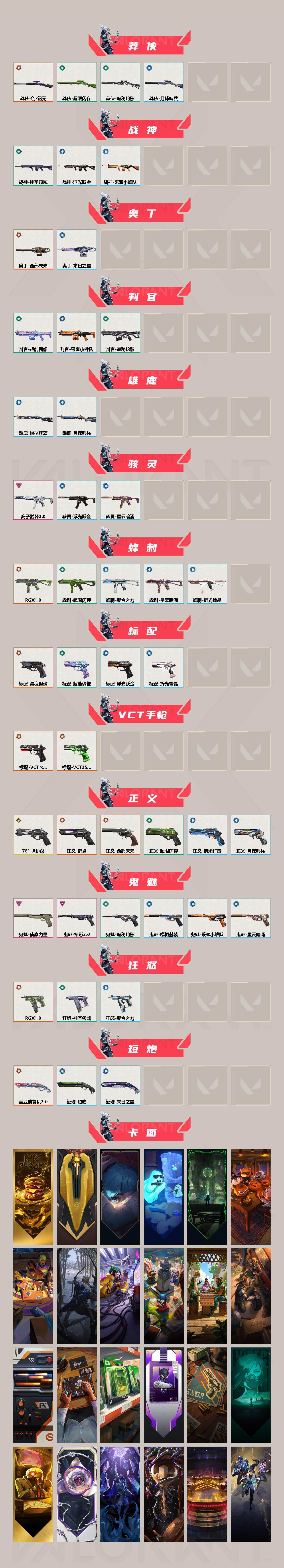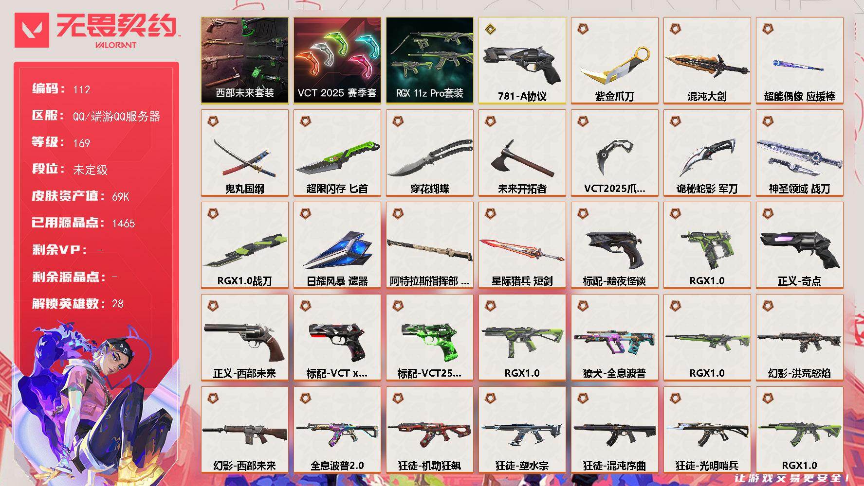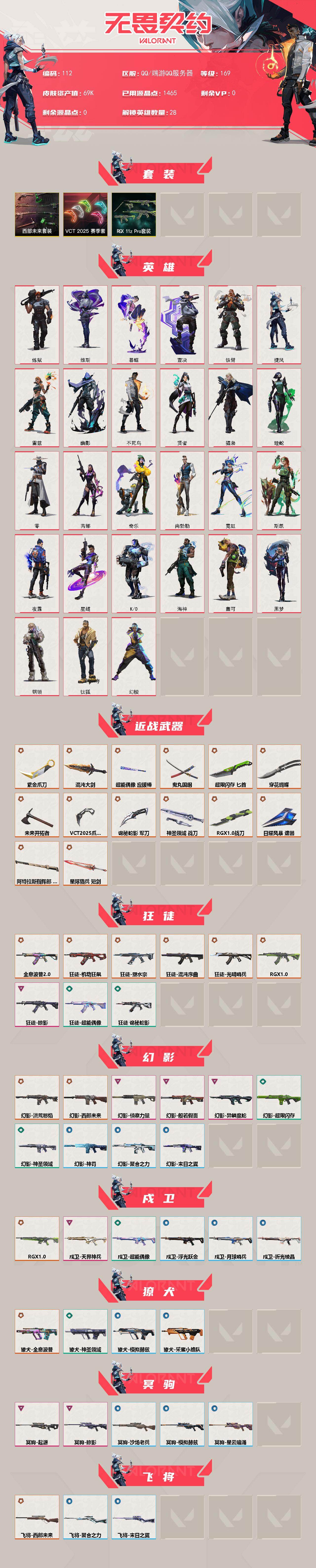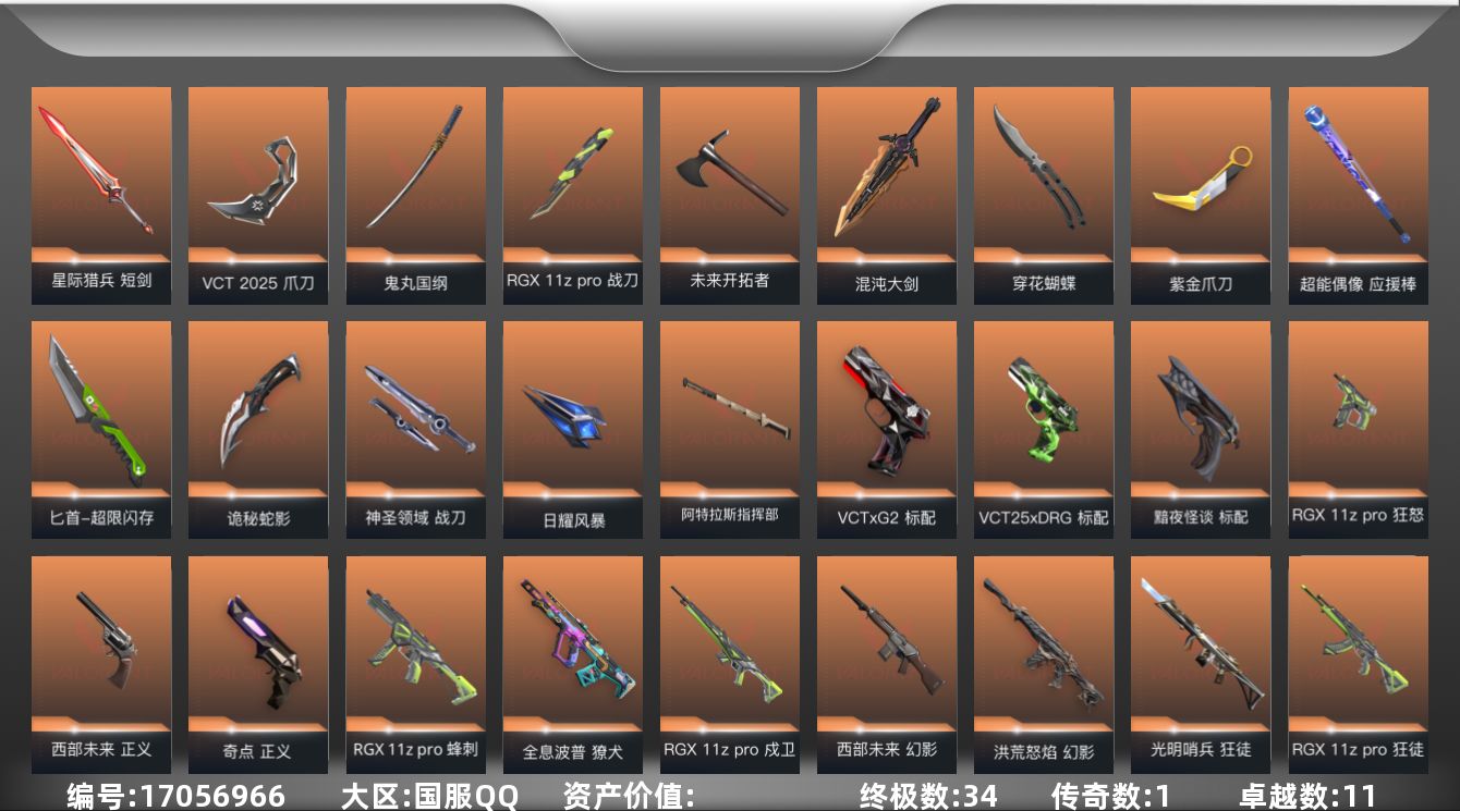 [17056966]【112】【套装】:RGX 11z Pro套装,VCT 2025 赛季套装,西部未来套装 【英雄】:幻棱,炼狱,维斯,暮蝶,钛狐,壹决,铁臂,捷风,雷兹,幽影,不死鸟,贤者,猎枭,蝰蛇,零,芮娜,奇乐,尚勃勒,霓虹,斯凯,夜露,星礈,K/O,海神,盖可,黑梦,钢锁 【近战武器】:近战武器-RGX 11z Pro 战刀,近战武器-穿花蝴蝶,近战武器-VCT 2025 爪刀,近战武器-紫金爪刀,近战武器-鬼丸国纲,近战武器-未来开拓者,近战武器-混沌大剑,近战武器-超能偶像 应援棒,近战武器-超限闪存 匕首,近战武器-诡秘蛇影 军刀,近战武器-神圣领域 战刀,近战武器-日耀风暴 遗器,近战武器-阿特拉斯指挥部 甩棍,近战武器-星际猎兵 短剑 【狂徒】:狂徒-光明哨兵,狂徒-混沌序曲,狂徒-机动狂飙,狂徒-全息波普//2.0,狂徒-塑水宗,狂徒-RGX 11z Pro,狂徒-掠影,狂徒-超能偶像,狂徒-诡秘蛇影 【幻影】:幻影-洪荒怒焰,幻影-西部未来,幻影-般若假面,幻影-侦察力量,幻影-异鳞魔蛇,幻影-超限闪存,幻影-神圣领域,幻影-聚合之力,幻影-神罚,幻影-末日之翼,幻影-西部未来 【戍卫】:戍卫-RGX 11z Pro,戍卫-天界神兵,戍卫-超能偶像,戍卫-浮光跃金,戍卫-月球哨兵,戍卫-折光棱晶 【獠犬】:獠犬-全息波普,獠犬-神圣领域,獠犬-采蜜小蜂队,獠犬-模拟赫兹 【冥驹】:冥驹-掠影,冥驹-起源,冥驹-模拟赫兹,冥驹-沙场老兵,冥驹-星云暗涌 【飞将】:飞将-西部未来,飞将-聚合之力,飞将-末日之翼 【莽侠】:莽侠-创·纪元,莽侠-超限闪存,莽侠-诡秘蛇影,莽侠-月球哨兵 【战神】:战神-神圣领域,战神-采蜜小蜂队,战神-浮光跃金 【奥丁】:奥丁-西部未来,奥丁-末日之翼 【判官】:判官-超能偶像,判官-诡秘蛇影,判官-采蜜小蜂队 【雄鹿】:雄鹿-模拟赫兹,雄鹿-月球哨兵 【骇灵】:骇灵-离子武器//2.0,骇灵-浮光跃金,骇灵-星云暗涌 【蜂刺】:蜂刺-RGX 11z Pro,蜂刺-超限闪存,蜂刺-聚合之力,蜂刺-星云暗涌,蜂刺-折光棱晶 【标配】:标配-黯夜怪谈,标配-超能偶像,标配-浮光跃金,标配-折光棱晶 【VCT手枪】:标配-VCT x G2,标配-VCT25 x DRG 【正义】:正义-781-A协议,正义-奇点,正义-西部未来,正义-超