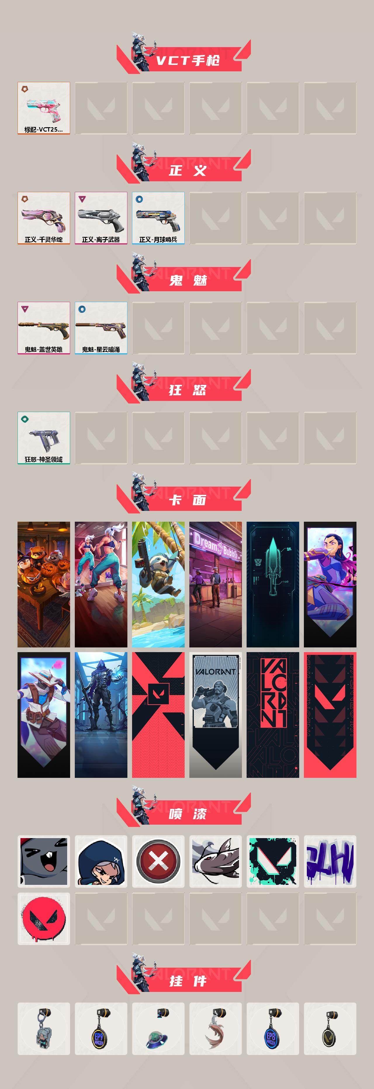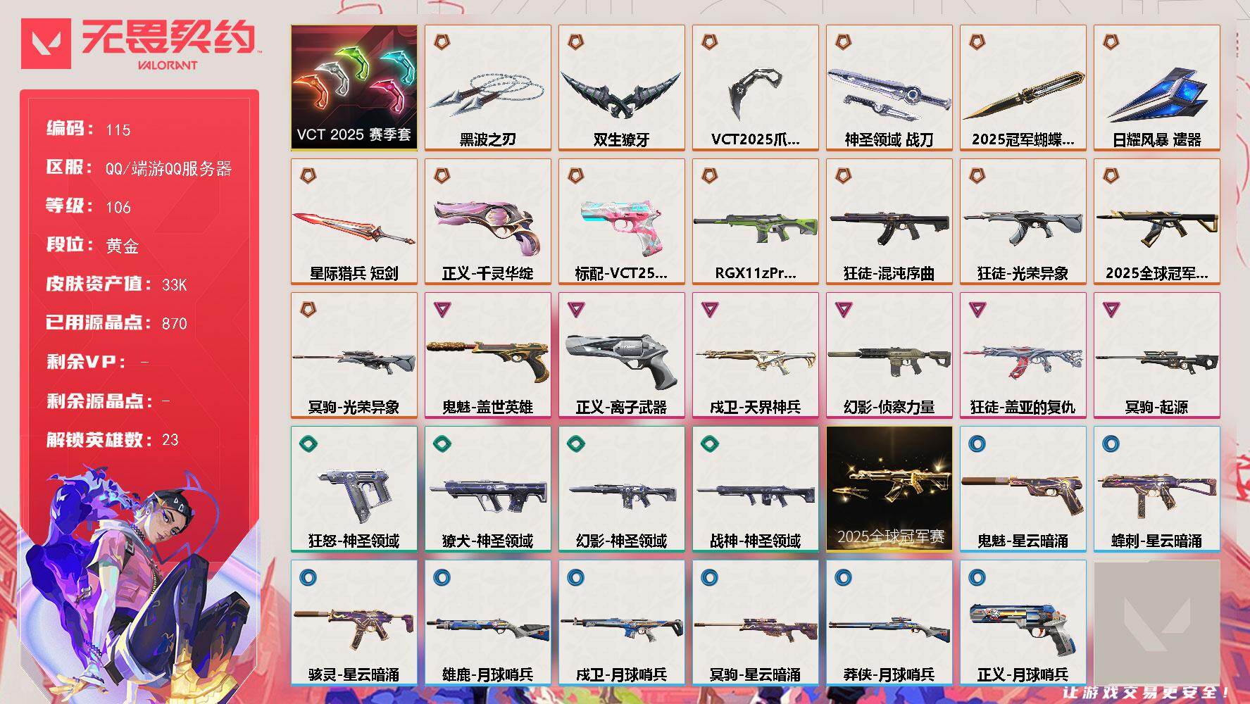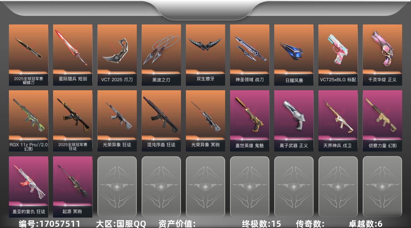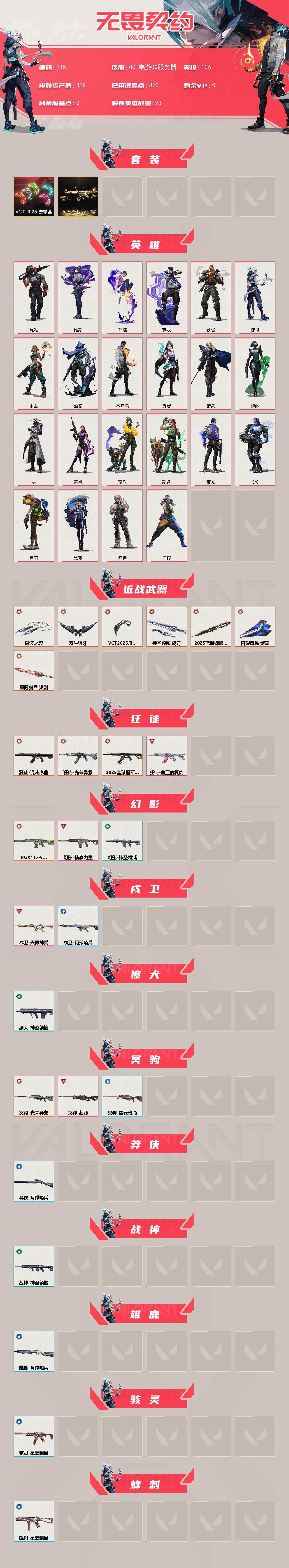 [17057511]【115】【套装】:2025全球冠军赛套装,VCT 2025 赛季套装 【英雄】:幻棱,炼狱,维斯,暮蝶,壹决,铁臂,捷风,雷兹,幽影,不死鸟,贤者,猎枭,蝰蛇,零,芮娜,奇乐,斯凯,夜露,K/O,盖可,黑梦,钢锁 【近战武器】:近战武器-2025全球冠军赛 蝴蝶刀,近战武器-VCT 2025 爪刀,近战武器-黑波之刃,近战武器-双生獠牙,近战武器-神圣领域 战刀,近战武器-日耀风暴 遗器,近战武器-星际猎兵 短剑 【狂徒】:狂徒-2025全球冠军赛,狂徒-混沌序曲,狂徒-光荣异象,狂徒-盖亚的复仇 【幻影】:幻影-RGX 11z Pro//2.0,幻影-侦察力量,幻影-神圣领域 【戍卫】:戍卫-天界神兵,戍卫-月球哨兵 【獠犬】:獠犬-神圣领域 【冥驹】:冥驹-光荣异象,冥驹-起源,冥驹-星云暗涌 【莽侠】:莽侠-月球哨兵 【战神】:战神-神圣领域 【雄鹿】:雄鹿-月球哨兵 【骇灵】:骇灵-星云暗涌 【蜂刺】:蜂刺-星云暗涌 【VCT手枪】:标配-VCT25 x BLG 【正义】:正义-千灵华绽,正义-离子武器,正义-月球哨兵 【鬼魅】:鬼魅-盖世英雄,鬼魅-星云暗涌 【狂怒】:狂怒-神圣领域 【卡面】:南瓜盛典 卡面,热舞环节 卡面,树懒大作战 卡面,梦幻奶茶 卡面,零点嗅探设计图 卡面,无畏契约GO!第一卷:芮娜 卡面,无畏契约GO!第一卷:零 卡面,暗枪 卡面,代号红色 卡面,新兵报到 卡面,V契约 卡面,无畏契约 卡面 【喷漆】:超级粉丝 喷漆,捷风差距 喷漆,买装还是存钱 喷漆,松叶 喷漆,胜利属于无畏契约 喷漆,GLHF 喷漆,无畏契约 喷漆 【挂饰】:V25第六幕:超凡 挂饰,袖珍捷风 挂饰,第九季//第一幕 纪念币 挂饰,天外飞客 挂饰,红鳞松叶 挂饰,第八季//第一幕 纪念币 挂饰,无畏契约 纪念币 挂饰