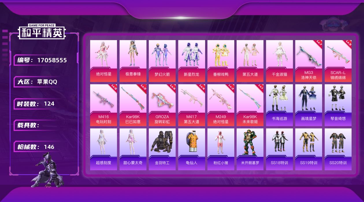 [17058555]苹果 手Q-7粉装-10特效枪-0载具-1粉色飞行器-46131热力值-14王牌印记-124套装-146枪皮 【热门品类】:粉装-梦幻火箭,套装-金羽特工,套装-龟仙人,套装-粉红小猪 【粉色套装】:角色-绝对恒星,粉装-梦幻火箭,粉装-新星烈龙,粉装-垂柳戏鸭,粉装-第五大道,角色-千金淑猫,粉装-极意拳锋 【粉色枪皮等级】:SCAR-L-锦绣绵绵(五级),M416-电玩时刻(五级),GROZA-旋转彩虹(四级),AKS-74U-森灵之息(四级),Kar98K-未来歌姬(一级),Kar98K-巳巳如意(五级),M417-第五大道(四级),M249-绝对恒星(三级),MG3-洛神天依(七级) 【粉色枪皮】:SCAR-L-锦绣绵绵,M416-电玩时刻,GROZA-旋转彩虹,AKS-74U-森灵之息,Kar98K-未来歌姬,Kar98K-巳巳如意,Mk14-福马献瑞,M417-第五大道,M249-绝对恒星,MG3-洛神天依 【粉色飞行器】:绝对恒星飞行器 【粉色降落伞】:绝对恒星降落伞,梦幻火箭降落伞,洛神天依降落伞,第五大道降落伞,忍者神龟降落伞 【稀有套装】:套装-龟仙人,角色-超感刻度,角色-甜心蒙太奇,套装-雪国风尚,角色-米开朗基罗,套装-书海巡游,套装-画境星梦,套装-琴音绮想 【稀有枪皮】:AKM-夜灯,AKM-彩虹符号,AKM-灼热熔岩,AKM-破晓战魂,AKM-霓虹街区,AKM-龙的传人,M16A4-幻世战舞者,M16A4-红色方程式,SCAR-L-夜灯,SCAR-L-炫彩节奏,SCAR-L-玉兔迎春,SCAR-L-红色方程式,SCAR-L-黄金龙骨,M416-糯团青竹,M416-红色方程式,M416-蓝色火焰,GROZA-暮色玫影,AUG-天降萌叽,AUG-耀粉歌者,AUG-绝对恒星,QBZ-彩虹符号,QBZ-洛神天依,M762-天降萌叽,M762-彩虹符号,M762-第五大道,Mk47-洛神天依,G36C-星穹咏叹调,AC-VAL-天降萌叽,AC-VAL-快闪甜心,蜜獾-垂柳戏鸭,蜜獾-天降萌叽,蜜獾-娇憨猪猪,ACE32-画境星梦,UZI-啾咪啾咪,UZI-娇憨猪猪,UZI-炫彩节奏,UZI-红色方程式,UMP45-生命誓言,UMP45-蓝色火焰,Vector-彩虹符号,Vector-生命誓言,汤姆逊-天降萌叽,汤姆逊-炫彩节奏,汤姆逊-环太平