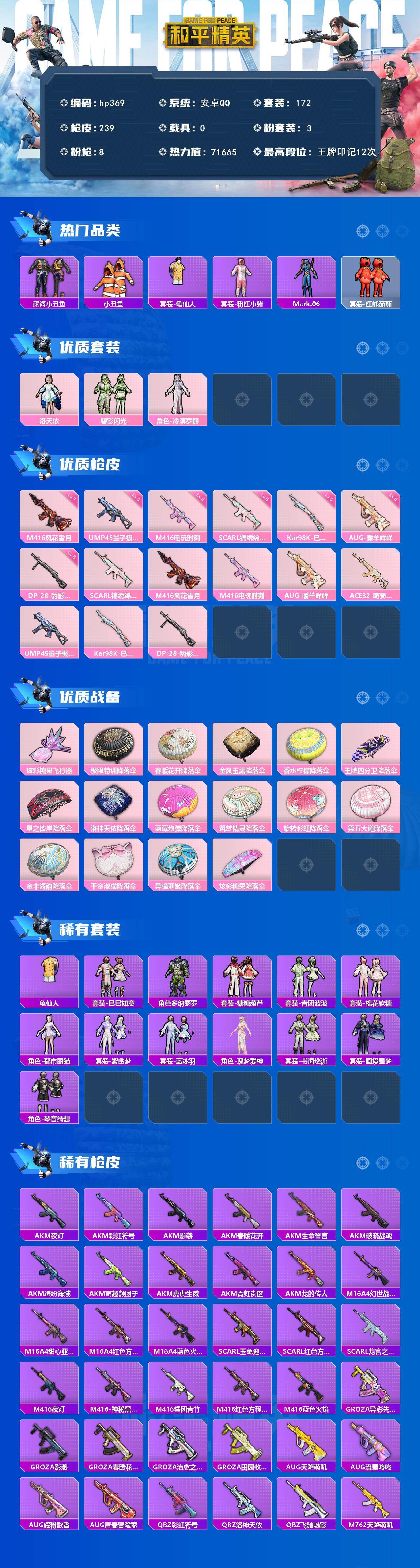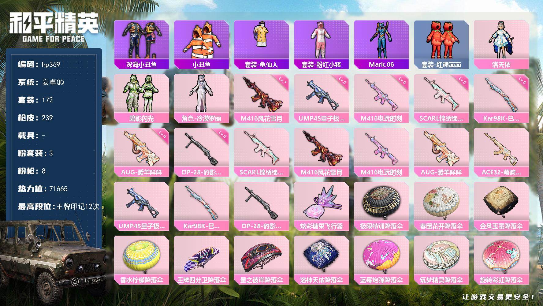 [17058584]安卓 手Q-3粉装-8特效枪-0载具-1粉色飞行器-71665热力值-12王牌印记-172套装-239枪皮 【热门品类】:套装-深海小丑鱼,套装-小丑鱼,套装-龟仙人,套装-粉红小猪,角色-Mark.06,套装-红熊茄茄 【粉色套装】:角色-洛天依,粉装-碧影闪光,角色-冷漠罗丽 【粉色枪皮等级】:SCAR-L-锦绣绵绵(五级),M416-风花雪月(七级),M416-电玩时刻(五级),AUG-暖羊咩咩(五级),UMP45-量子极限(五级),Kar98K-巳巳如意(五级),DP-28-豹影疾电(五级) 【粉色枪皮】:SCAR-L-锦绣绵绵,M416-风花雪月,M416-电玩时刻,AUG-暖羊咩咩,ACE32-萌骑漫游,UMP45-量子极限,Kar98K-巳巳如意,DP-28-豹影疾电 【粉色飞行器】:炫彩糖果飞行器 【粉色降落伞】:极限特训降落伞,春暖花开降落伞,金风玉露降落伞,香水柠檬降落伞,王牌四分卫降落伞,星之彼岸降落伞,洛神天依降落伞,蓝莓炮弹降落伞,筑梦精灵降落伞,旋转彩虹降落伞,第五大道降落伞,金丰海韵降落伞,千金淑猫降落伞,异瞳寒姬降落伞,炫彩糖果降落伞 【稀有套装】:套装-龟仙人,套装-巳巳如意,套装-炫彩糖果,角色-多纳泰罗,套装-糖糖葫芦,套装-青团波波,套装-棉花软糖,角色-都市丽猫,套装-紫幽梦,套装-蓝冰羽,角色-瑰梦爱神,套装-书海巡游,套装-画境星梦,套装-琴音绮想 【稀有枪皮】:AUG-冰晶雪宝,AKM-夜灯,AKM-彩虹符号,AKM-影袭,AKM-春暖花开,AKM-生命誓言,AKM-破晓战魂,AKM-缤纷海域,AKM-萌趣颜团子,AKM-虎虎生威,AKM-霓虹街区,AKM-龙的传人,M16A4-幻世战舞者,M16A4-甜心亚梦,M16A4-红色方程式,M16A4-蓝色火焰,SCAR-L-玉兔迎春,SCAR-L-红色方程式,SCAR-L-龙宫之主,M416-夜灯,M416-神秘黑猫,M416-糯团青竹,M416-红色方程式,M416-蓝色火焰,GROZA-异彩先驱,GROZA-影袭,GROZA-春暖花开,GROZA-治愈之星,GROZA-田园牧歌,AUG-天降萌叽,AUG-流星咚咚,AUG-耀粉歌者,AUG-青春冒险家,QBZ-彩虹符号,QBZ-洛神天依,QBZ-飞驰魅影,M762-天降萌叽,M762-彩虹甜喵,M762-彩虹符号,M