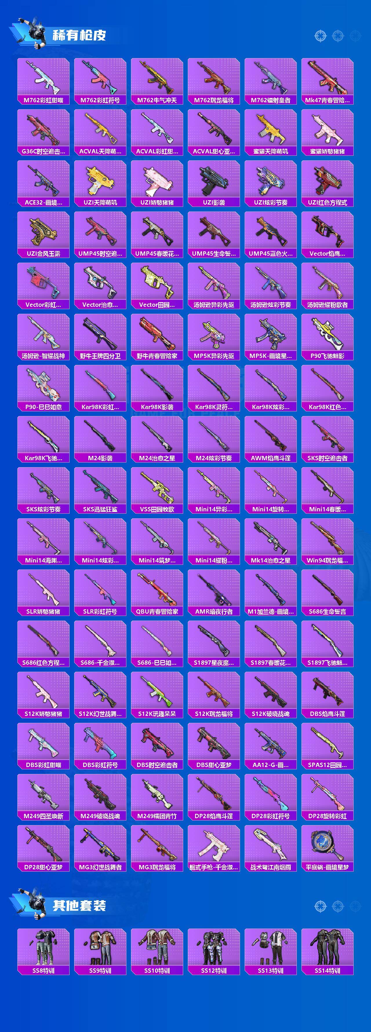 【稀有枪皮】:AUG-冰晶雪宝,AKM-夜灯,AKM-彩虹符号,AKM-影袭,AKM-春暖花开,AKM-生命誓言,AKM-破晓战魂,AKM-缤纷海域,AKM-萌趣颜团子,AKM-虎虎生威,AKM-霓虹街区,AKM-龙的传人,M16A4-幻世战舞者,M16A4-甜心亚梦,M16A4-红色方程式,M16A4-蓝色火焰,SCAR-L-玉兔迎春,SCAR-L-红色方程式,SCAR-L-龙宫之主,M416-夜灯,M416-神秘黑猫,M416-糯团青竹,M416-红色方程式,M416-蓝色火焰,GROZA-异彩先驱,GROZA-影袭,GROZA-春暖花开,GROZA-治愈之星,GROZA-田园牧歌,AUG-天降萌叽,AUG-流星咚咚,AUG-耀粉歌者,AUG-青春冒险家,QBZ-彩虹符号,QBZ-洛神天依,QBZ-飞驰魅影,M762-天降萌叽,M762-彩虹甜喵,M762-彩虹符号,M