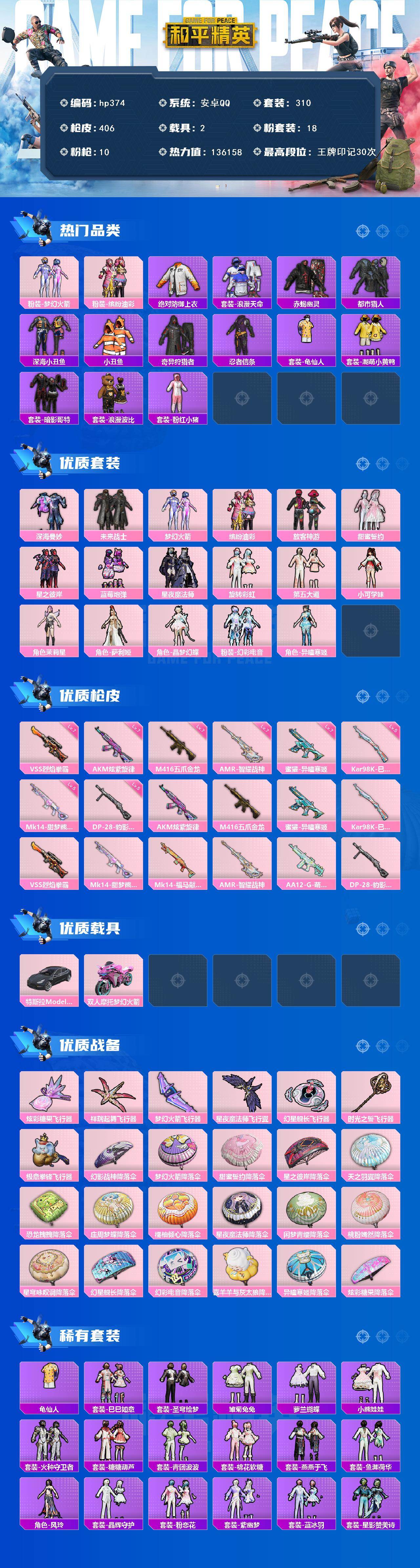 [17058718]安卓 手Q-18粉装-10特效枪-2载具-7粉色飞行器-136158热力值-30王牌印记-310套装-406枪皮 【热门品类】:粉装-梦幻火箭,粉装-缤纷油彩,绝对防御上衣,套装-浪漫天命,套装-赤蝎幽灵,套装-都市猎人,套装-深海小丑鱼,套装-小丑鱼,套装-奇异狩猎者,套装-忍者信条,套装-龟仙人,套装-潮萌小黄鸭,套装-暗影哥特,套装-浪漫波比,套装-粉红小猪 【粉色套装】:粉装-深海曼妙,粉装-未来战士,粉装-梦幻火箭,粉装-缤纷油彩,粉装-放客神游,粉装-甜蜜誓约,粉装-星之彼岸,粉装-蓝莓炮弹,粉装-星夜魔法师,粉装-旋转彩虹,粉装-第五大道,角色-小可学妹,角色-茉莉星,角色-萨利娅,角色-晶梦幻蝶,粉装-幻彩电音,角色-异瞳寒姬 【粉色枪皮等级】:AKM-炫紫旋律(七级),M416-五爪金龙(七级),蜜獾-异瞳寒姬(七级),Kar98K-巳巳如意(五级),VSS-烈焰拳霸(七级),Mk14-甜梦熊击(五级),AMR-智耀战神(七级),DP-28-豹影疾电(五级) 【粉色载具】:特斯拉Model 3(冷光银),双人摩托-梦幻火箭 【粉色枪皮】:AKM-炫紫旋律,M416-五爪金龙,蜜獾-异瞳寒姬,Kar98K-巳巳如意,VSS-烈焰拳霸,Mk14-甜梦熊击,Mk14-福马献瑞,AMR-智耀战神,AA12-G-萌骑幻想,DP-28-豹影疾电 【粉色飞行器】:炫彩糖果飞行器,祥瑞起舞飞行器,梦幻火箭飞行器,星夜魔法师飞行翼,幻星舰长飞行器,时光之誓飞行器,极意拳锋飞行器 【粉色降落伞】:幻影战神降落伞,梦幻火箭降落伞,甜蜜誓约降落伞,星之彼岸降落伞,天之羽翼降落伞,恐龙拽拽降落伞,庄周梦蝶降落伞,橘柚倾心降落伞,星夜魔法师降落伞,闲梦青缨降落伞,桃粉嫣然降落伞,星穹咏叹调降落伞,幻星舰长降落伞,幻彩电音降落伞,喜羊羊与灰太狼降落伞,异瞳寒姬降落伞,炫彩糖果降落伞 【稀有套装】:套装-龟仙人,套装-巳巳如意,套装-圣穹绘梦,套装-炫彩糖果,套装-雏菊兔兔,套装-萝兰蝴蝶,套装-小熊娃娃,套装-火种守卫者,套装-糖糖葫芦,套装-青团波波,套装-棉花软糖,套装-燕燕于飞,套装-鱼渊荷华,角色-风玲,套装-晶辉守护,套装-粉恋花,套装-紫幽梦,套装-蓝冰羽,套装-星影赞美诗,套装-极速光影,套装-彩虹兔,套装-云朵鹅,套装-雪绒豹,角色-绛羽幽主,套装-朱霞炽焰,