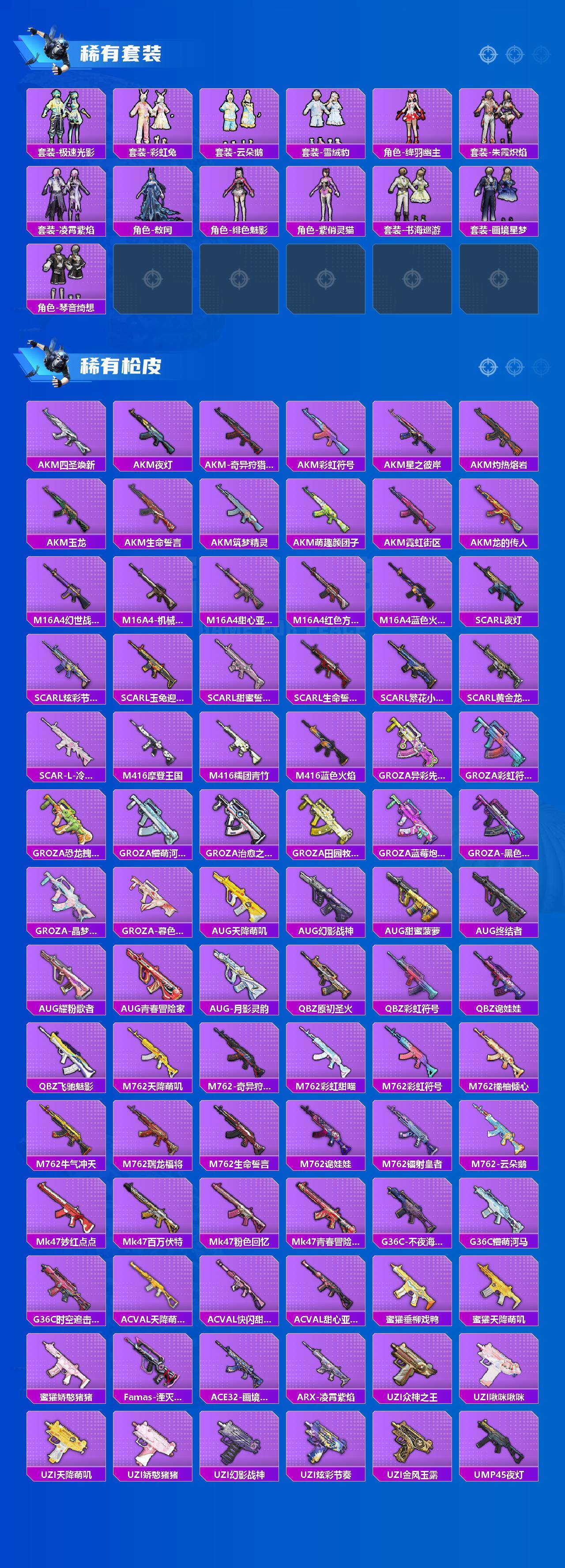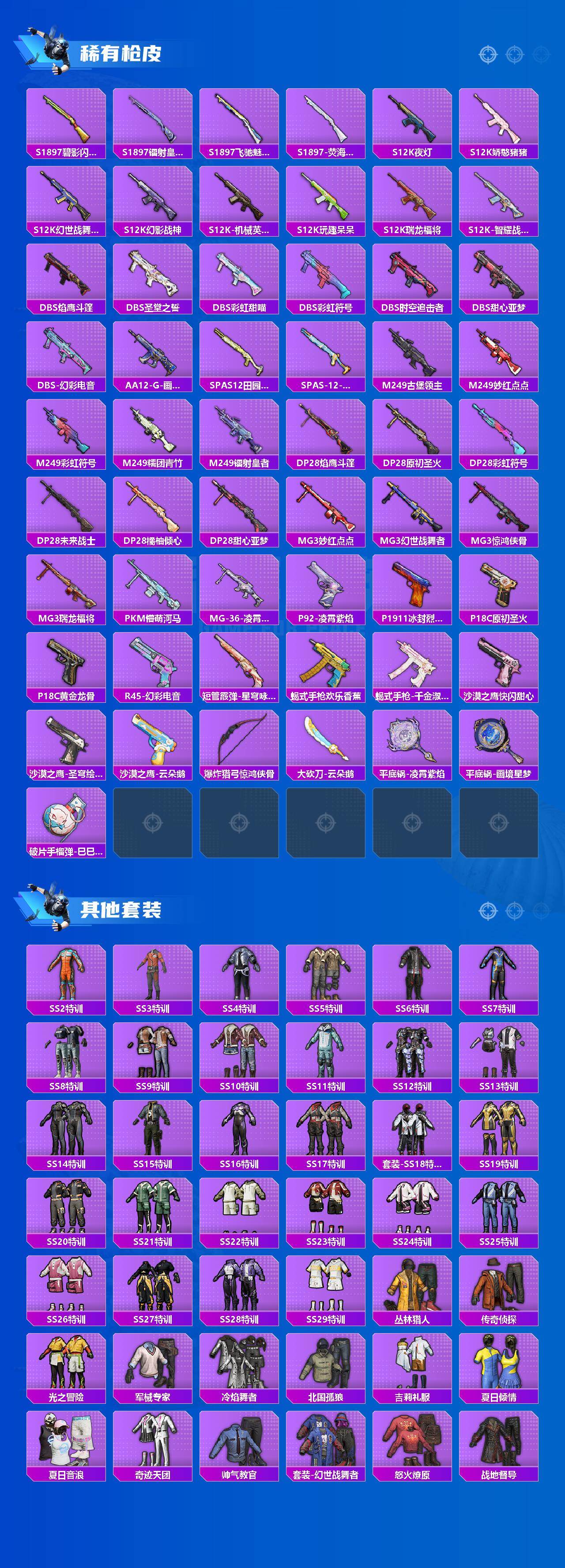 - [16144116]41m总资产-601k哈伏币-60烽火等级-钻石-37战场等级-上等兵 【干员外观】:红狼-蚀金玫瑰,露娜-黑·天际线,蜂医-送葬人·无题密令,深蓝-不破誓约,露娜-金牌射手 【近战皮肤】:近战-北极星,近战-黑鹰 【传说外观】:M4A1突击步枪-蚀金玫瑰,M4A1突击步枪-阿米娅,SG552突击步枪-运动员,AK-12突击步枪-特斯拉线圈,SCAR-H战斗步枪-启航,G3战斗步枪-骑士,CAR-15突击步枪-阿米娅,腾龙突击步枪-捞点薯条,K437突击步枪-北极星,UZI冲锋枪-特斯拉线圈,SR-3M紧凑突击步枪-特斯拉线圈,勇士冲锋枪-能天使-午夜邮差,QCQ171冲锋枪-北极星,725双管霰弹枪-送葬人-无题密令,M250通用机枪-骑士之心,杠杆式步枪-纵横,AWM狙击步枪-捞点薯条,93R-捞点薯条,复合弓-黑·天际线 【史诗外观】:AKM突击步枪-林中猎手,ASh-12战斗步枪-无极限,M16A4突击步枪-竞赛选手,AUG突击步枪-蝮蛇,M7战斗步枪-百步穿杨,SG552突击步枪-深海恐惧,SCAR-H战斗步枪-囚徒,G3战斗步枪-流沙送葬,AS Val突击步枪-百步穿杨,腾龙突击步枪-无垢,K437突击步枪-守护者,MP5冲锋枪-深海恐惧,MP5冲锋枪-战术竞备,MP5冲锋枪-竞技风,P90冲锋枪-莫斯提马,Vector冲锋枪-阿萨拉文明,Vector冲锋枪-百步穿杨,SR-3M紧凑突击步枪-荒野求生,SR-3M紧凑突击步枪-战术竞备,勇士冲锋枪-工业狂潮,MP7冲锋枪-无垢,MP7冲锋枪-守护者,M1014霰弹枪-林中猎手,PKM通用机枪-蝮蛇,PKM通用机枪-荒野求生,M250通用机枪-囚徒,Mini-14射手步枪-守护者,SVD狙击步枪-荒野求生,PSG-1射手步枪-无垢,SV-98狙击步枪-林中猎手,SV-98狙击步枪-囚徒,M700狙击步枪-蝮蛇,M700狙击步枪-百步穿杨,AWM狙击步枪-无极限,AWM狙击步枪-流沙送葬,沙漠之鹰-曙光,复合弓-守护者 【稀有外观】:M4A1突击步枪-战术小队,M4A1突击步枪-零点,M4A1突击步枪-前沿科技,M4A1突击步枪-繁盛,AKM突击步枪-战术演练,AKM突击步枪-肃杀,QBZ95-1突击步枪-精准打击,QBZ95-1突击步枪-公平竞技,ASh-12战斗步枪-星链科技,ASh-12战斗步枪-哈夫