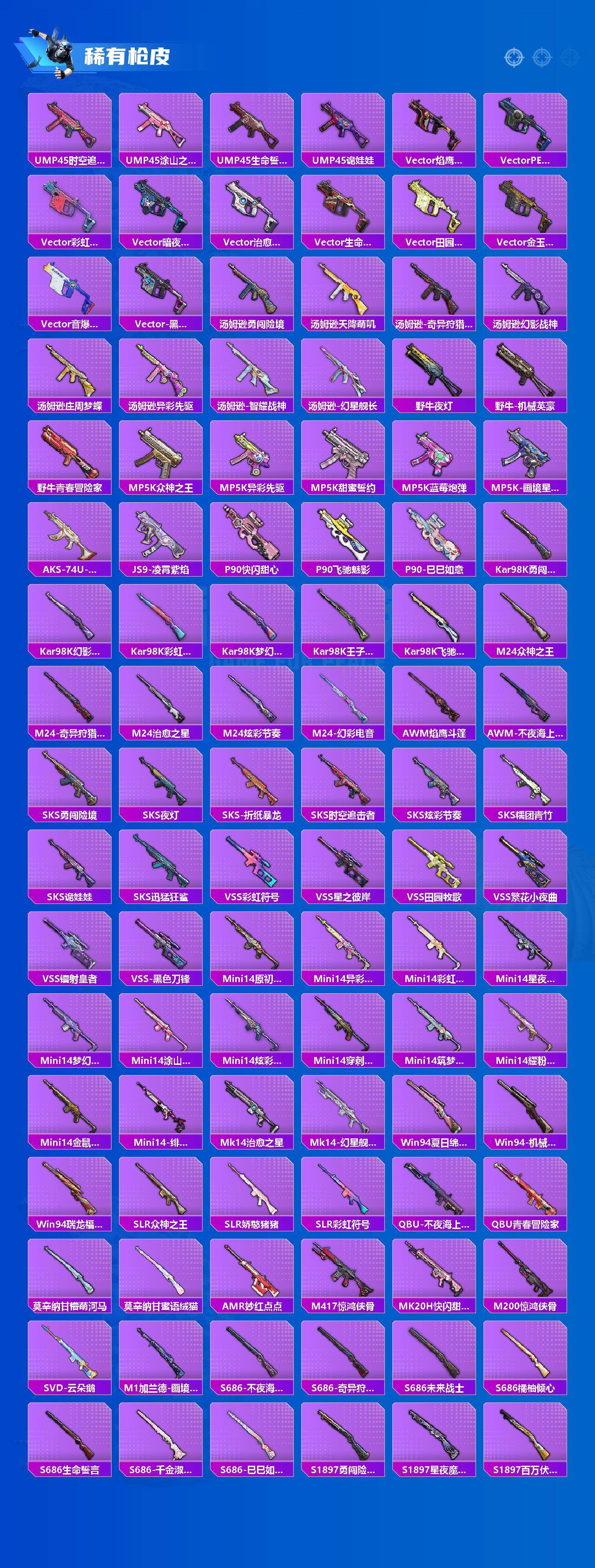 【粉色枪皮】:AKM-炫紫旋律,M416-五爪金龙,蜜獾-异瞳寒姬,Kar98K-巳巳如意,VSS-烈焰拳霸,Mk14-甜梦熊击,Mk14-福马献瑞,AMR-智耀战神,AA12-G-萌骑幻想,DP-28-豹影疾电