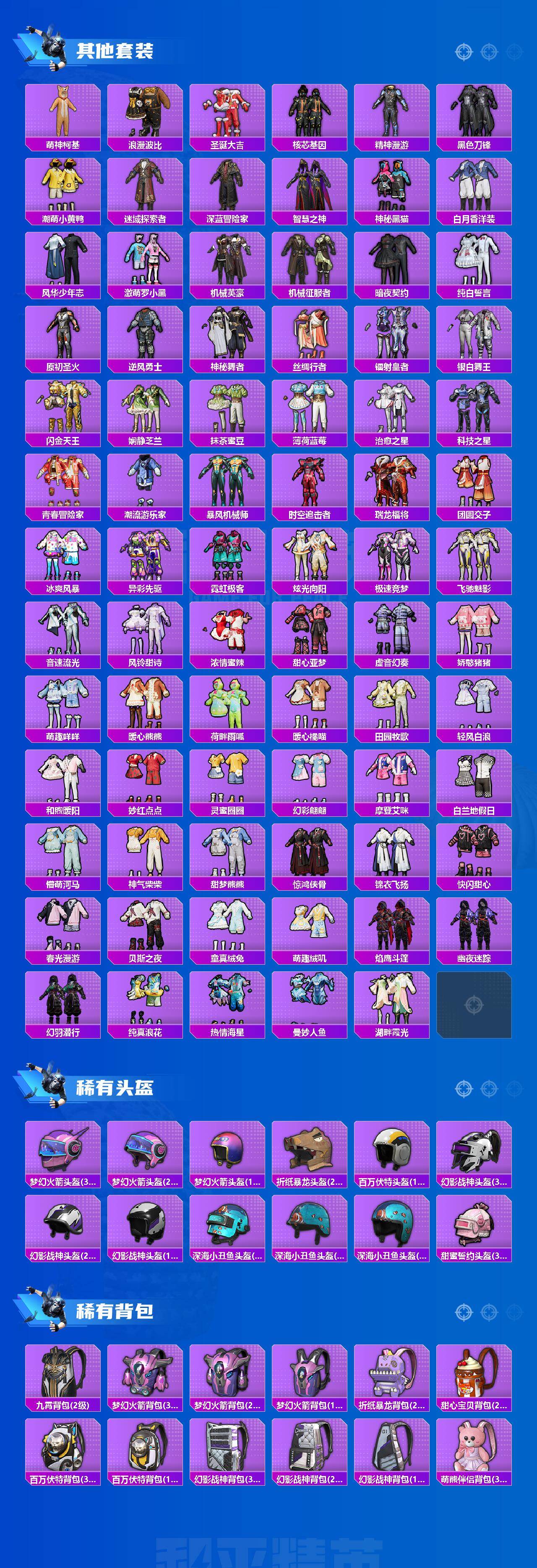 【稀有套装】:套装-龟仙人,套装-巳巳如意,套装-圣穹绘梦,套装-炫彩糖果,套装-雏菊兔兔,套装-萝兰蝴蝶,套装-小熊娃娃,套装-火种守卫者,套装-糖糖葫芦,套装-青团波波,套装-棉花软糖,套装-燕燕于飞,套装-鱼渊荷华,角色-风玲,套装-晶辉守护,套装-粉恋花,套装-紫幽梦,套装-蓝冰羽,套装-星影赞美诗,套装-极速光影,套装-彩虹兔,套装-云朵鹅,套装-雪绒豹,角色-绛羽幽主,套装-朱霞炽焰,