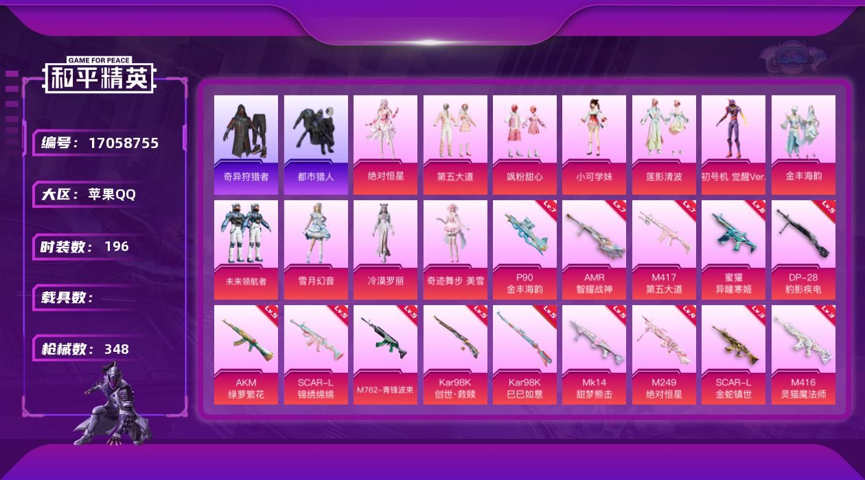 [17058755]苹果 手Q-12粉装-17特效枪-0载具-13粉色飞行器-109384热力值-18王牌印记-196套装-348枪皮 【热门品类】:套装-都市猎人,套装-小丑鱼,套装-奇异狩猎者,套装-龟仙人,角色-8号机,角色-Mark.06 【粉色套装】:角色-绝对恒星,粉装-第五大道,粉装-飒粉甜心,角色-小可学妹,粉装-莲影清波,角色-初号机 觉醒Ver.,粉装-金丰海韵,粉装-未来领航者,粉装-雪月幻音,角色-冷漠罗丽,角色-奇迹舞步 美雪,角色-霁蓝缠春 【粉色枪皮等级】:AKM-绿萝繁花(五级),SCAR-L-锦绣绵绵(五级),SCAR-L-金蛇镇世(三级),M416-灵猫魔法师(三级),M762-青锋波束(五级),蜜獾-异瞳寒姬(六级),UMP45-宇宙意志(三级),P90-金丰海韵(七级),Kar98K-创世·救赎(五级),Kar98K-巳巳如意(五级),Mk14-甜梦熊击(五级),AMR-智耀战神(七级),M417-第五大道(七级),M249-绝对恒星(四级),DP-28-豹影疾电(五级) 【粉色枪皮】:AKM-绿萝繁花,SCAR-L-锦绣绵绵,SCAR-L-金蛇镇世,M416-灵猫魔法师,M762-青锋波束,蜜獾-异瞳寒姬,UMP45-宇宙意志,P90-金丰海韵,Kar98K-创世·救赎,Kar98K-巳巳如意,Mk14-甜梦熊击,Mk14-福马献瑞,AMR-智耀战神,M417-第五大道,AA12-G-萌骑幻想,M249-绝对恒星,DP-28-豹影疾电 【粉色飞行器】:绝对恒星飞行器,炫彩糖果飞行器,甜蜜誓约飞行器,星夜魔法师飞行翼,深渊漩涡飞行器,动力核心飞行器,凤舞九天飞行器,万象金身飞行器,幻星舰长飞行器,终晖之翼飞行器,飞天猪飞行器,暮色之舞飞行器 【粉色降落伞】:绝对恒星降落伞,至尊龙雀降落伞,甜蜜誓约降落伞,星之彼岸降落伞,洛神天依降落伞,蓝莓炮弹降落伞,天之羽翼降落伞,音爆索尼克降落伞,第五大道降落伞,梦幻舞会降落伞,天星战神降落伞,未来歌姬降落伞,闲梦青缨降落伞,圣堂之誓降落伞,镜域双华降落伞,星梦奇缘降落伞,初号机 觉醒Ver.降落伞,魔法神域降落伞,金丰海韵降落伞,忍者神龟降落伞,宇宙意志降落伞,拳皇·狂花道降落伞,未来领航者降落伞,临安公主降落伞,月影灵韵降落伞,金蛇镇世降落伞,彩虹独角兽降落伞,樱桃泡泡降落伞,戏水时光降落伞,雪月幻音降