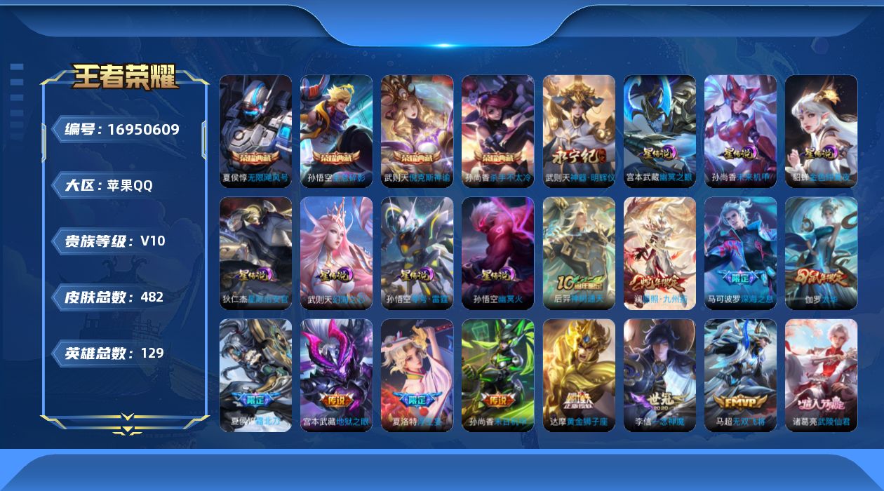 [16950609]苹果Q-V10-最强王者段位-129英雄-482皮肤-4典藏皮肤-1典藏英雄-1无双-6星传-36传说-154史诗