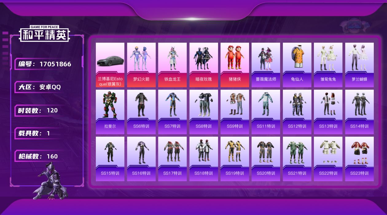 [17051866]安卓 手Q-4粉装-0特效枪-1载具-1粉色飞行器-51343热力值-8王牌印记-120套装-160枪皮【热门品类】:粉装-梦幻火箭,套装-龟仙人【粉色套装】:粉装-梦幻火箭,粉装-铁血龙王,粉装-暗夜玫瑰,玩偶服-猪猪侠【粉色载具】:兰博基尼Estoque(银翼灰)