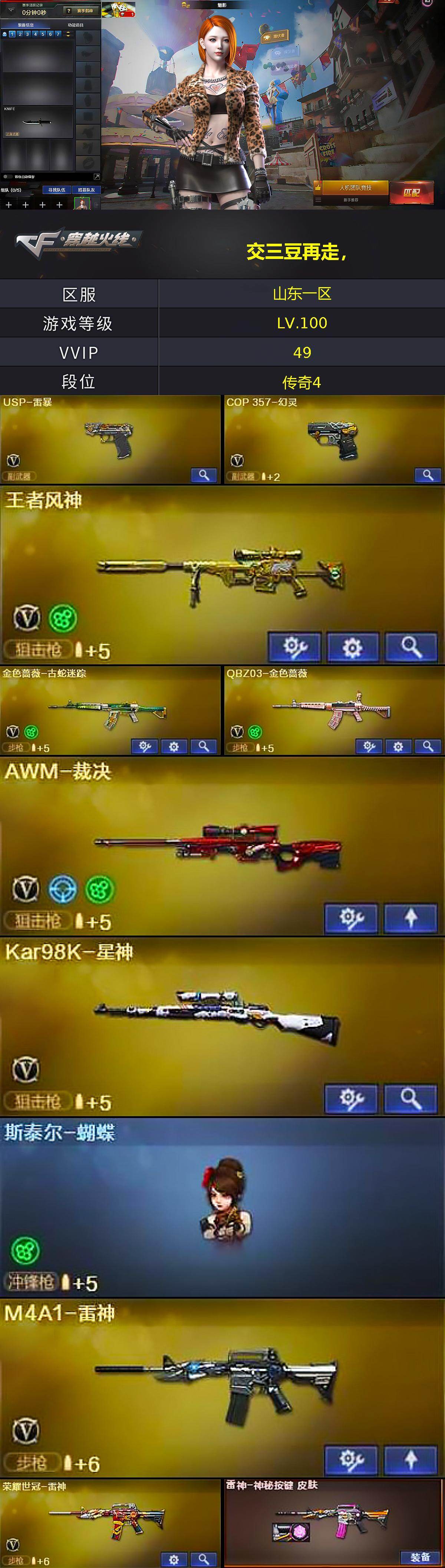 [17002233]山东一区-44V-1王者武器数-0炫金武器数 【热门武器】:QBZ03-金色蔷薇,M14EBR-玄武,M4A1-青龙,金色蔷薇-古蛇迷踪,修罗-古蛇迷踪,荣耀世冠-火麒麟,荣耀世冠-雷神,Kar98K-星神,斯泰尔-蝴蝶,MK5-炽火炎龙,USP-雷暴,COP 357-幻灵,沙鹰-修罗*4 【音效卡】:M14EBR-玄武音效卡 【皮肤】:雷神-神秘按键 皮肤,毁灭-英雄计划 皮肤 【角色】:魅影,战地猎狐,蛇隐宗,奇洋探员,修道士,云海玲珑,暗夜-X,北极狐-X,电竞少女,芳心审判者,飞虎队-X,兰-新年限定,0号玩家,灵狐-花神,灵狐者-X,龙儿,曼陀罗-X,潘多拉-X,潘多拉-甜心教官,潜龙队-X,蛇姬,蜀雪,维纳斯,新娜塔莎,游珑儿 【人偶武器】:MK5-炽火炎龙,斯泰尔-蝴蝶,AWM-灵狐-15周年嘉年华,迷你深渊冰龙,夺魂*2,生化手雷-机甲核心*2,灵狐娃娃手雷 【挑战大师】:神圣爆裂者III,冰龙粉碎者-白马银枪,激光毁灭者III-白马银枪,神圣爆裂者-末日III 【英雄级武器】:M4A1-雷神,M4A1-青龙,M14EBR-玄武,黑武士-锦绣游龙,超新星-热带奇洋,金色蔷薇-古蛇迷踪,QBZ03-金色蔷薇,荣耀世冠-火麒麟,荣耀世冠-雷神,Barrett-毁灭,AWM-裁决,Kar98K-星神,王者风神-觉醒版,沙鹰-修罗*4,USP-雷暴,COP 357-幻灵,修罗-古蛇迷踪,麒麟刺,幻灵之锋,擎天-云海游龙,龙啸-热带奇洋,斩神刀-雷暴,高爆手雷-雷暴*4,高爆手雷-幻灵,手雷-云海游龙,手雷-热带奇洋,高爆手雷-古蛇迷踪,闪光弹-雷暴*4,闪光弹-云龙,闪光弹-玄豹,烟雾弹-雷暴*4,烟雾弹-古蛇迷踪 【道具】:BS战队炫彩背包,CFS限定背包,古蛇迷踪炫彩背包,奇洋探员-海龟背包,热带奇洋炫彩背包,超级背包,救世主-黑桃战神,绿色巨人,灵魂忍者*3,变异宝贝,妖姬,迷雾幽灵*3,生化弹匣*2,夺命之镰,防化服*4,金色流光-枪王排位,星辰流光-枪王排位,枪王排位28赛季金色流光,枪王排位29赛季金色流光,古蛇迷踪打击特效,蛇隐宗表情,热带奇洋表情,云海游龙表情,EP战队名片,EP战队喷图,EP战队击杀图标,防弹头盔*3,防弹衣*3,C4工具钳*3,手雷包*3 【特殊枪械】:蝴蝶斯泰尔+0烈龙,1蝴蝶斯泰尔