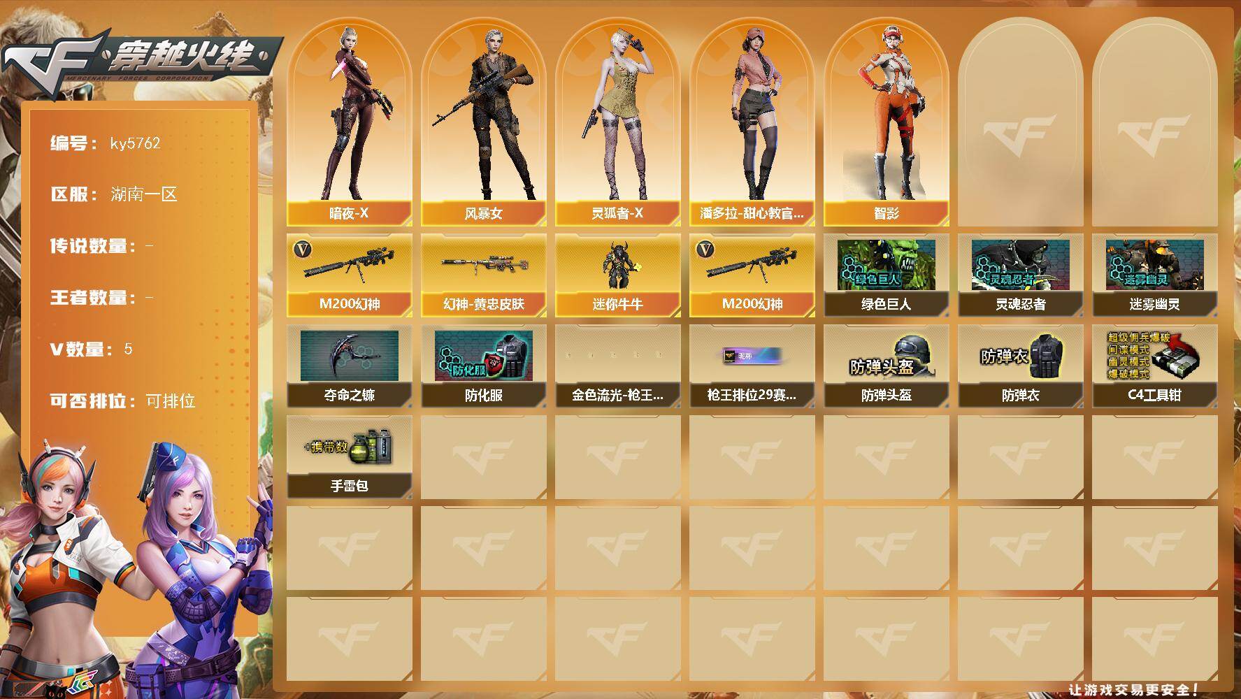 [16846901]湖南一区-5V-0王者武器数-0炫金武器数 【热门武器】:M200-幻神 【皮肤】:M200-幻神-黄忠皮肤 【角色】:暗夜-X,风暴女,灵狐者-X,潘多拉-甜心教官,智影 【人偶武器】:迷你牛牛 【英雄级武器】:M200-幻神 【道具】:绿色巨人,灵魂忍者,迷雾幽灵,夺命之镰,防化服*3,金色流光-枪王排位*2,枪王排位29赛季金色流光,防弹头盔*6,防弹衣*6,C4工具钳*6,手雷包*6 【特殊枪械】: