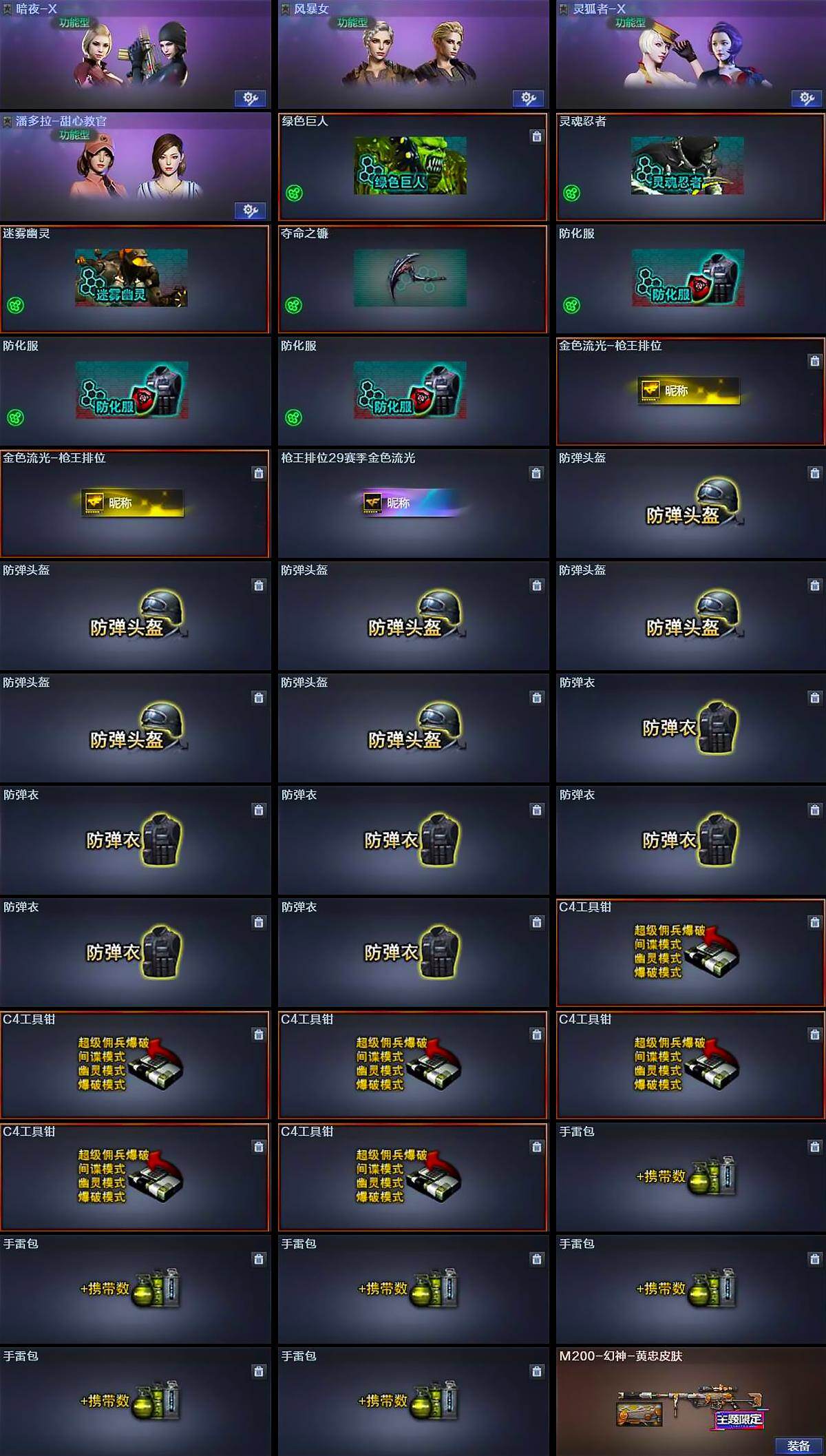 【道具】:绿色巨人,灵魂忍者,迷雾幽灵,夺命之镰,防化服*3,金色流光-枪王排位*2,枪王排位29赛季金色流光,防弹头盔*6,防弹衣*6,C4工具钳*6,手雷包*6
