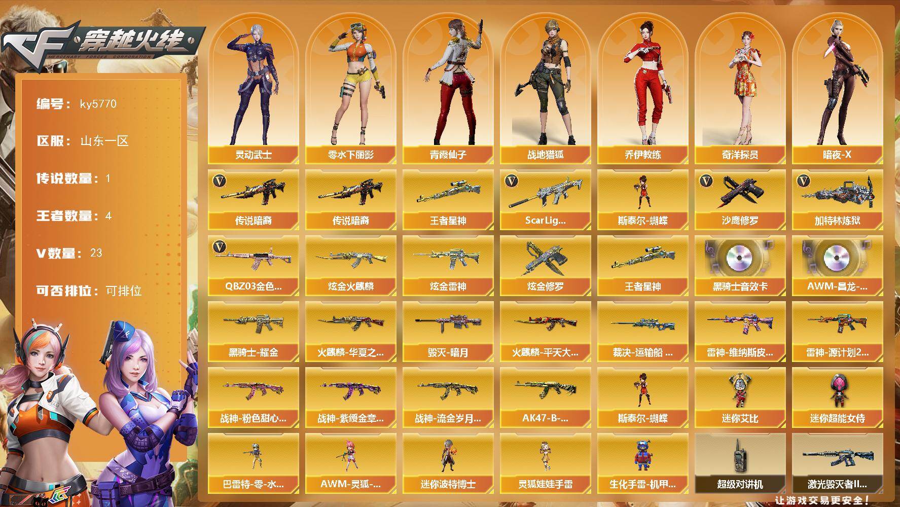 [16946165]山东一区-25V-4王者武器数-3炫金武器数 【传说武器】:传说暗裔 【传说角色】:传说星骇 【热门武器】:传说暗裔,王者星神,QBZ03-金色蔷薇,Scar Light-白虎,加特林-炼狱,斯泰尔-蝴蝶,沙鹰-修罗 【王者炫金武器】:王者星神,炫金火麒麟,炫金雷神,炫金修罗 【音效卡】:M4A1-黑骑士音效卡,AWM-昌龙-怀旧音效卡 【皮肤】:裁决-运输船 皮肤,雷神-维纳斯皮肤,雷神-源计划2.0专属 皮肤,火麒麟-华夏之心,火麒麟-平天大圣,毁灭-暗月,黑骑士耀金皮肤,战神-粉色甜心皮肤,战神-紫绶金章皮肤,战神-流金岁月皮肤,AK47-B-常胜将军-孙权 【角色】:战地猎狐,奇洋探员,乔伊教练,暗夜-X,芳心审判者,风暴女,嘉年华灵狐,荆棘玫瑰,灵动武士,零-水下丽影,灵狐-花神,灵狐者-黄金海岸,龙儿-小淘气,曼陀罗-X,潘多拉-X,潘多拉-甜心教官,青霞仙子,维纳斯,雪莉杨-摸金校尉,智影 【人偶武器】:斯泰尔-蝴蝶,巴雷特-零-水下丽影,AWM-灵狐-15周年嘉年华,迷你波特博士,生化手雷-机甲核心,迷你艾比,迷你超能女侍,灵狐娃娃手雷*2 【暴走生化】:超级对讲机 【挑战大师】:冰龙粉碎者-白马银枪*2,激光毁灭者III-白马银枪 【英雄级武器】:M4A1-雷神*2,Scar Light-白虎,无影-神兵利器,黑武士-锦绣游龙,QBZ03-金色蔷薇,烈火-动感闪耀,Barrett-毁灭,加特林-炼狱,AA-12-雷霆,沙鹰-修罗,天神-动感闪耀,屠龙-动感闪耀,手雷-动感闪耀,闪光弹-幻灵,闪光弹-雷霆王者-觉醒版*2,烟雾弹-幻灵*2,M4A1-赤狱骑士,AWM-昌龙 【道具】:BS战队炫彩背包,CFS限定背包,QQ会员专属背包,云山科技背包,炫彩背包-诺拉,炫彩背包,超级背包,女皇终结者-魔龙之吻,救世主-黑桃战神,绿色巨人,灵魂忍者,变异宝贝,迷雾幽灵,生化弹匣,夺命之镰,防化服*4,金色流光-枪王排位,枪王排位28赛季金色流光,枪王排位29赛季金色流光,电玩兔兔表情,动感闪耀表情,EP战队名片,EP战队喷图,EP战队击杀图标,C4-再燃火线,防弹头盔*4,防弹衣*4,C4工具钳*4,手雷包*4 【特殊枪械】:蝴蝶斯泰尔+0烈龙,1白虎,1炼狱,1蝴蝶斯泰尔