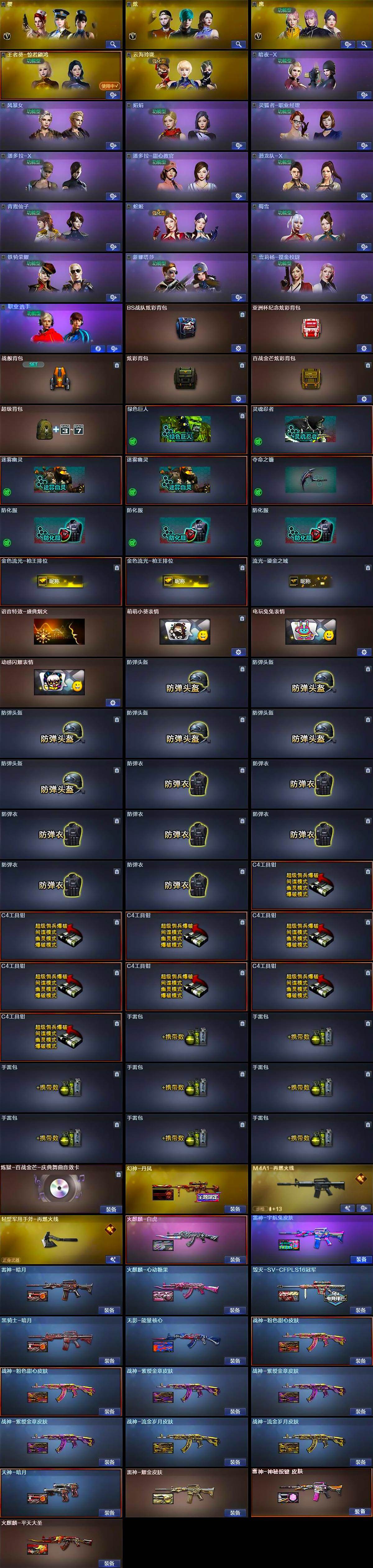 【道具】:BS战队炫彩背包,亚洲杯纪念炫彩背包,战舰背包,炫彩背包,百战金芒炫彩背包,超级背包,绿色巨人,灵魂忍者,迷雾幽灵*2,夺命之镰,防化服*3,金色流光-枪王排位*2,流光-鎏金之域,语音特效-盛典烟火,萌萌小葵表情,电玩兔兔表情,动感闪耀表情,防弹头盔*6,防弹衣*7,C4工具钳*8,手雷包*8