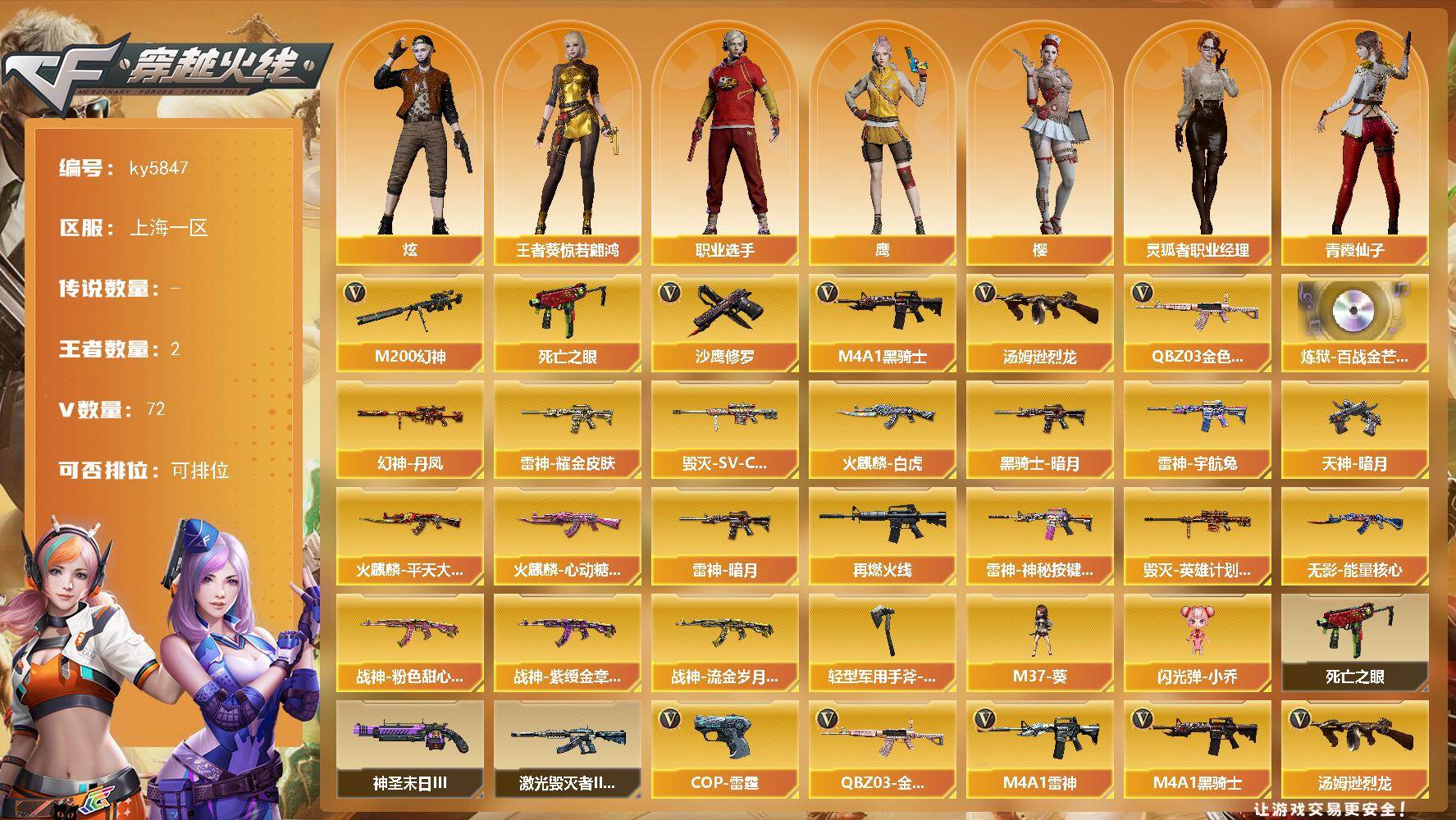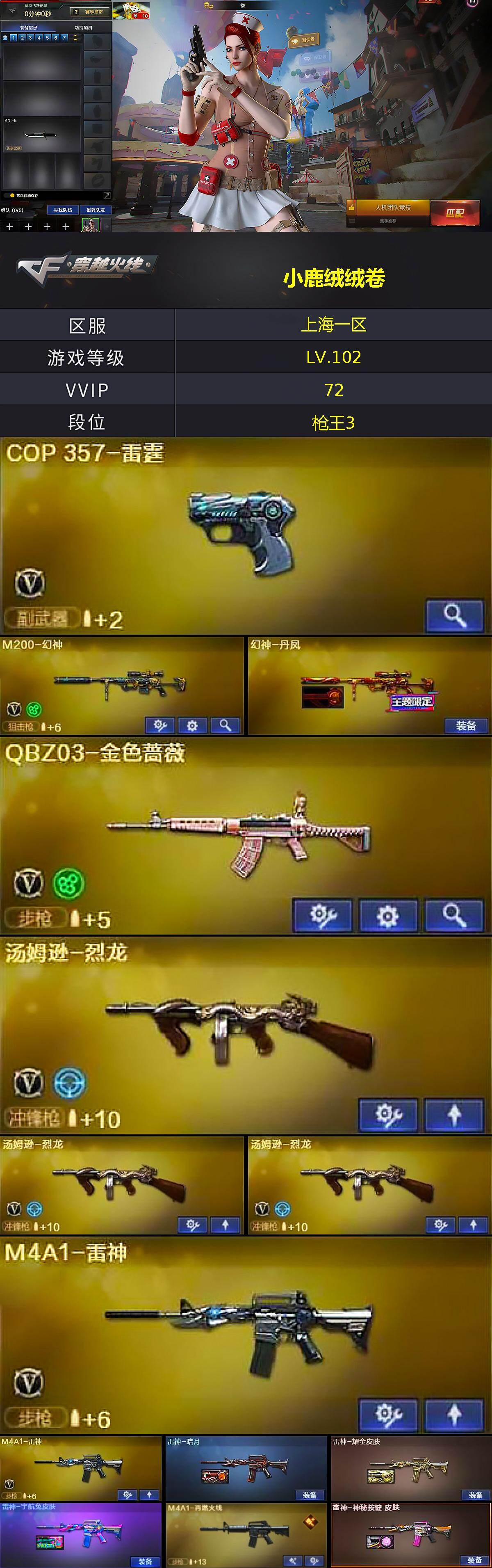 [17016561]上海一区-77V-2王者武器数-0炫金武器数 【热门武器】:QBZ03-金色蔷薇,M200-幻神,死亡之眼,M4A1-黑骑士,汤姆逊-烈龙*3,沙鹰-修罗 【音效卡】:炼狱-百战金芒-庆典舞曲音效卡 【皮肤】:幻神-丹凤,雷神-暗月,雷神-耀金皮肤,雷神-宇航兔皮肤,M4A1-再燃火线,雷神-神秘按键 皮肤,火麒麟-平天大圣,火麒麟-白虎,火麒麟-心动糖果,毁灭-SV-CFPLS16冠军,毁灭-英雄计划 皮肤,黑骑士-暗月,无影-能量核心,战神-粉色甜心皮肤*2,战神-紫绶金章皮肤*3,战神-流金岁月皮肤*2,天神-暗月,轻型军用手斧-再燃火线 【角色】:樱,炫,鹰,王者葵-惊若翩鸿,云海玲珑,暗夜-X,风暴女,娟娟,灵狐者-职业经理,潘多拉-X,潘多拉-甜心教官,潜龙队-X,邱刚敖,青霞仙子,蛇姬,蜀雪,铁骑荣耀,兔囡囡,新娜塔莎,雪莉杨-摸金校尉,樱-缤纷夏日,职业选手 【人偶武器】:M37-葵,闪光弹-小乔 【暴走生化】:死亡之眼 【挑战大师】:激光毁灭者III-白马银枪,神圣爆裂者-末日III 【英雄级武器】:AK47-火麒麟*2,M4A1-雷神*2,M4A1-黑骑士,AK47-无影,M4A1-雷霆,QBZ03-金色蔷薇,AK-47-猩红传说*8,AK47-B-战神,Barrett-毁灭,Barrett-极光*2,M200-幻神,炼狱-百战金芒,汤姆逊-烈龙*3,沙鹰-修罗,沙鹰-天神,COP-雷霆,屠龙,龙啸*2,麒麟刺-堕天神*2,麒麟刺-百战金芒,王者之啸-觉醒版*2,高爆手雷-雷霆*7,高爆手雷-堕天神,闪光弹-雷霆*7,闪光弹-堕天神,烟雾弹-雷霆*7,烟雾弹-堕天神 【道具】:BS战队炫彩背包,亚洲杯纪念炫彩背包,战舰背包,炫彩背包,百战金芒炫彩背包,超级背包,绿色巨人,灵魂忍者,迷雾幽灵*2,夺命之镰,防化服*3,金色流光-枪王排位*2,流光-鎏金之域,语音特效-盛典烟火,萌萌小葵表情,电玩兔兔表情,动感闪耀表情,防弹头盔*6,防弹衣*7,C4工具钳*8,手雷包*8 【特殊枪械】:1黑骑士,3烈龙