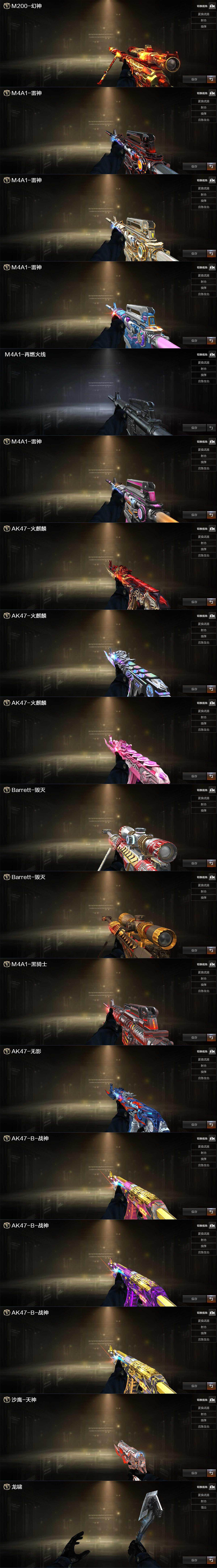 【皮肤】:幻神-丹凤,雷神-暗月,雷神-耀金皮肤,雷神-宇航兔皮肤,M4A1-再燃火线,雷神-神秘按键 皮肤,火麒麟-平天大圣,火麒麟-白虎,火麒麟-心动糖果,毁灭-SV-CFPLS16冠军,毁灭-英雄计划 皮肤,黑骑士-暗月,无影-能量核心,战神-粉色甜心皮肤*2,战神-紫绶金章皮肤*3,战神-流金岁月皮肤*2,天神-暗月,轻型军用手斧-再燃火线
