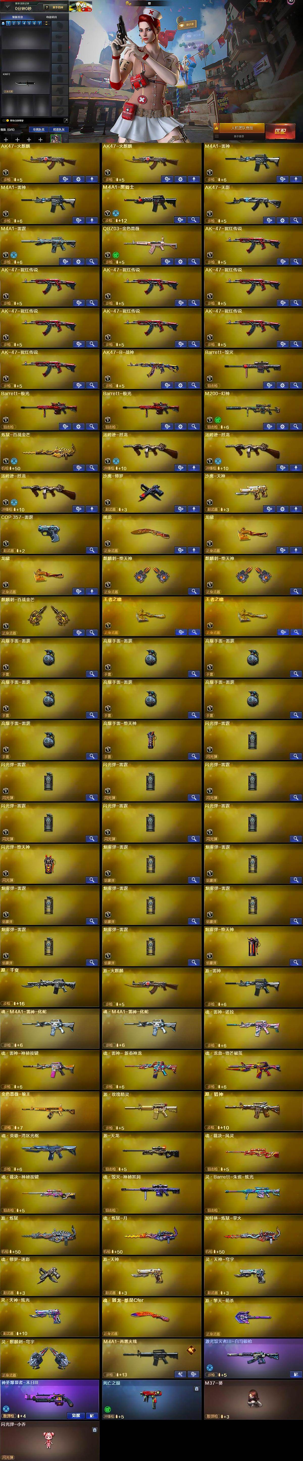 【英雄级武器】:AK47-火麒麟*2,M4A1-雷神*2,M4A1-黑骑士,AK47-无影,M4A1-雷霆,QBZ03-金色蔷薇,AK-47-猩红传说*8,AK47-B-战神,Barrett-毁灭,Barrett-极光*2,M200-幻神,炼狱-百战金芒,汤姆逊-烈龙*3,沙鹰-修罗,沙鹰-天神,COP-雷霆,屠龙,龙啸*2,麒麟刺-堕天神*2,麒麟刺-百战金芒,王者之啸-觉醒版*2,高爆手雷-雷霆*7,高爆手雷-堕天神,闪光弹-雷霆*7,闪光弹-堕天神,烟雾弹-雷霆*7,烟雾弹-堕天神