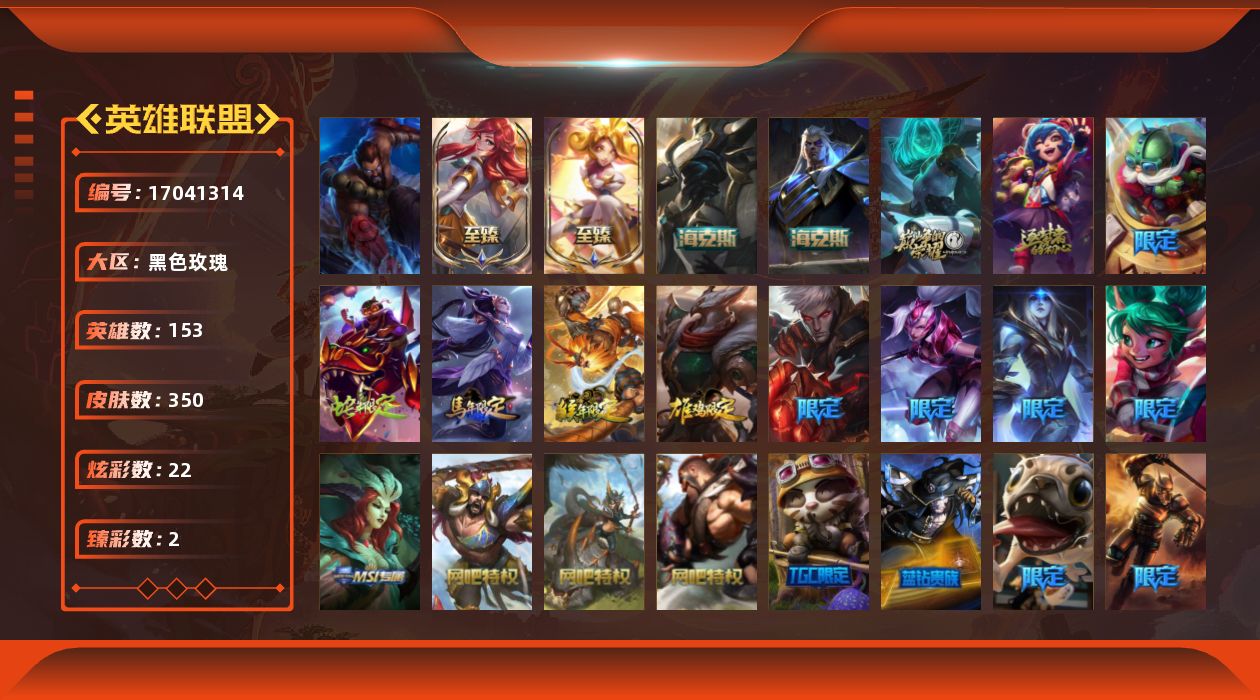 [17041314]【特价出售/店主推荐】 未定级段位-153英雄-350皮肤-22炫彩-1终极-7神话-55限定-28传说-93史诗 【神话皮肤】:十周年纪念安妮,源代码乐芙兰,神凰行者瑞羽圣凰艾尼维亚,海克斯科技斯维因,零之枪骑赫卡里姆,至臻星之守护者妮蔻,至臻战斗学院拉克丝 【至臻皮肤】:至臻战斗学院拉克丝,至臻星之守护者妮蔻 【臻彩皮肤】:征服者韦鲁斯炫金,战斗学院卡特琳娜盛典礼服 【年限皮肤】:神龙之翼库奇,广寒仙子嫦娥,美猴王孙悟空,司马懿仲达 【海克斯皮肤】:海克斯科技斯维因,零之枪骑赫卡里姆 【情人节限定】:觅心女王艾希,觅心魔灵奥莉安娜 【冰雪限定】:幸福女神乐芙兰,圣诞开心鬼提莫,圣诞精灵崔丝塔娜,圣诞狂欢努努和威朗普,圣诞狂欢基兰,阿木木“主人不要我了”,胡桃夹子萨科,平安夜女神娑娜,邪恶圣诞老人维迦,雪默丁格,圣诞玩偶波比,圣诞老人古拉加斯,圣诞驯鹿克格莫,雪球也能爆炸吉格斯,冰雪节辛吉德 【终极皮肤】:灵魂守卫乌迪尔 【限定皮肤】:舞会公主安妮,冠军之矛卡莉丝塔,冠军之隐劫,Fnatic迦娜,暗杀星蒙多,暗杀星努努和威朗普,SKTT1贾克斯,SKTT1李青,SKTT1薇恩,SSW辛吉德,SSW图奇,SSG霞,安妮梦游仙境,胜利女神奥莉安娜,南瓜头费德提克,鬼影重重魔腾,鬼影森森茂凯,无头骑士赫卡里姆,蓝色忧郁崔斯特,密林猎手提莫,外星装甲库奇,野兽猎人德莱文,野兽猎人瑟庄妮,野兽猎人泰达米尔,波比的巧克力工坊,永恒之森乐芙兰,勇者奈德丽,都铎王朝图奇,御星魔矢艾希,钢铁之翼艾尼维亚,征服者韦鲁斯,防暴士兵辛吉德,警用试作体K9内瑟斯,克格汪 【传说皮肤】:铁哥们儿奥拉夫,战地机甲厄加特,血石领主弗拉基米尔,大天使长米迦勒凯尔,恶魔男爵瑞兹,约德尔国队长提莫,合金巨兽努努和威朗普,女皇艾希,源计划联合艾希,鬼魂新娘莫甘娜,战地巨兽科加斯,双重冰晶艾尼维亚,冰霜之刃艾瑞莉娅,红色男爵库奇,最终BOSS维迦,陆地王者4WD布里茨,冰川巨兽墨菲特,第三类接触黑默丁格,炼狱魔犬内瑟斯,屠龙勇士潘森,黯黑魔龙希瓦娜,符文战熊沃利贝尔,苍穹之光韦鲁斯,宇航员诺提勒斯,女校长菲奥娜,灌篮高手德莱厄斯,蔷薇绅士杰斯,星之守护者金克丝 【史诗皮肤】:安伯斯与提妮,皇家火枪手崔斯特,特战先锋赵信,翼骑统领赵信,圣光审判凯尔,铁血剑豪易,地狱火阿利斯塔,战争机器赛恩,战场公主希维尔