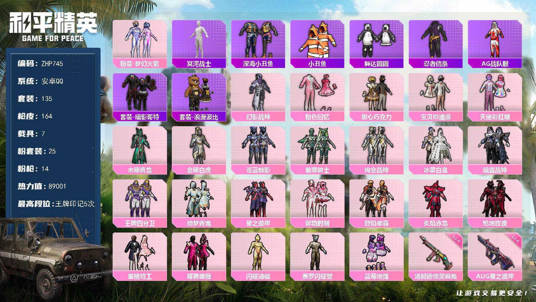 - PX_2095416- 苹果手Q-4王牌印记-2粉装-3特效枪-2载具-36291热力值-81套装-114枪皮-2卓越印记-2传奇印记 【2粉装】,雪国幻梦,星穹咏叹调 【3特效枪】M416-心之恋语-6级 AMR-智耀战神-5级 Vector-绯穹魔姬-4级 【5稀有紫装】,暗影哥特,雪山精英,浪漫波比,龟仙人,暗夜魅影, 【2稀有载具】,宝马M4(圣保罗黄),兰博基尼Aventador SV