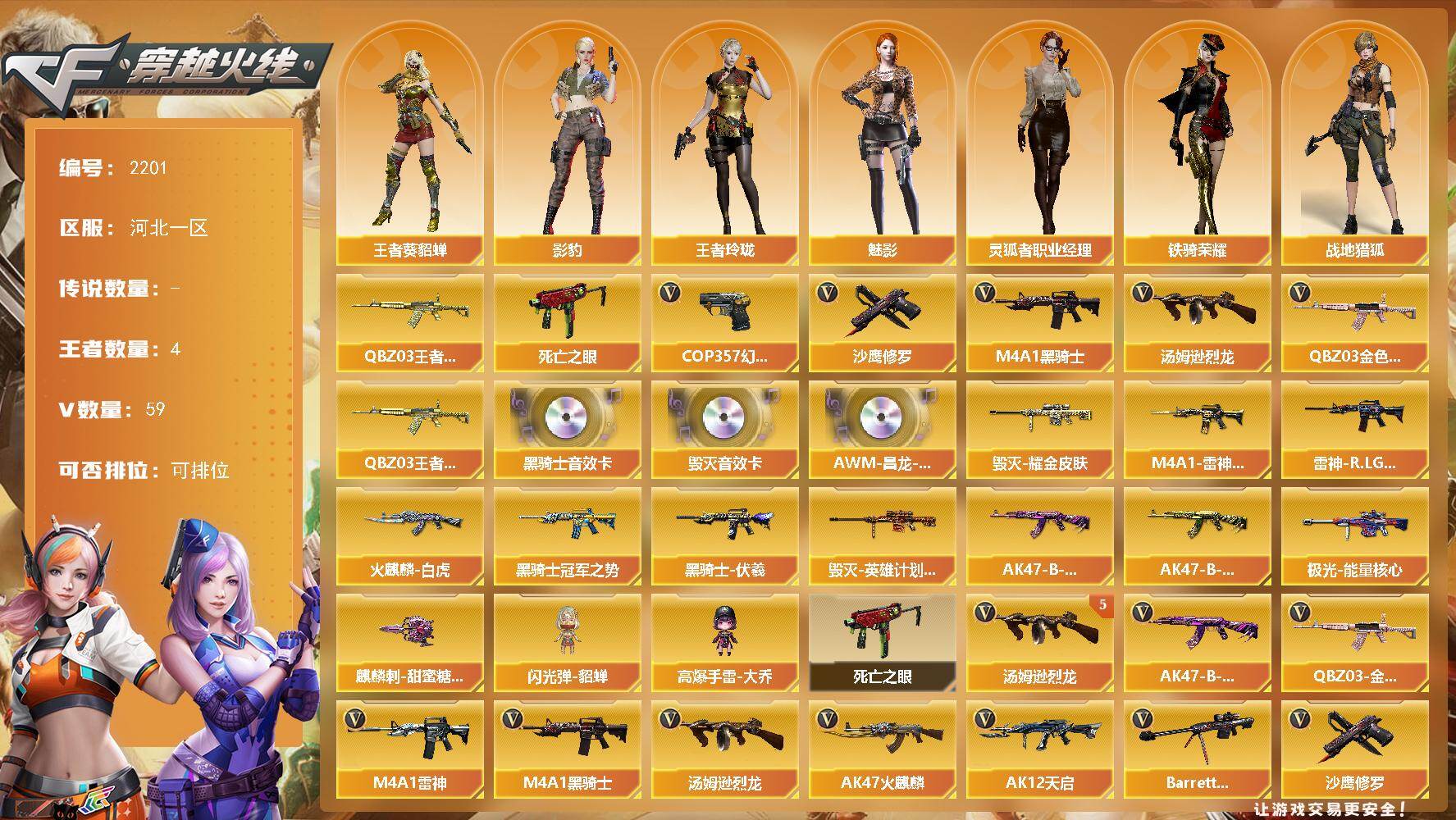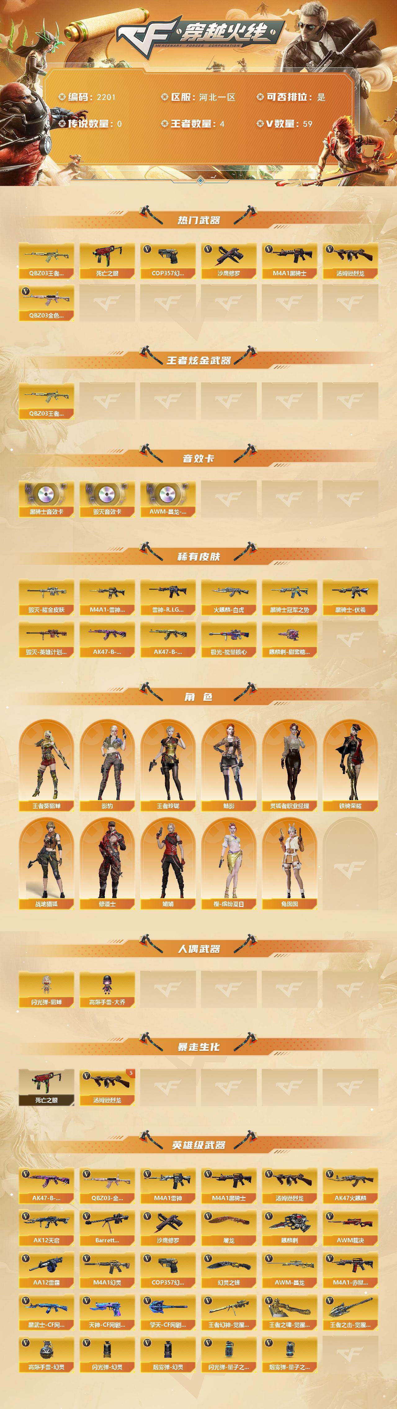 [17065114]河北一区-64V-4王者武器数-0炫金武器数 【热门武器】:QBZ03-金色蔷薇,QBZ-03-王者蔷薇,死亡之眼,M4A1-黑骑士,汤姆逊-烈龙*5,COP 357-幻灵*2,沙鹰-修罗*4 【王者炫金武器】:QBZ-03-王者蔷薇 【音效卡】:M4A1-黑骑士音效卡,Barrett-毁灭音效卡,AWM-昌龙-怀旧音效卡 【皮肤】:M4A1-雷神-CFS 2019,雷神-R.LGD-CFPLS18冠军,火麒麟-白虎,毁灭耀金皮肤,毁灭-英雄计划 皮肤,黑骑士-冠军之势,黑骑士-伏羲,AK47-B-常胜将军-曹操,AK47-B-常胜将军-孙权*2,极光-能量核心,麒麟刺-甜蜜糖果 皮肤 【角色】:魅影,影豹,战地猎狐,王者-葵-貂蝉,王者玲珑,修道士,娟娟,灵狐者-职业经理,铁骑荣耀,兔囡囡,樱-缤纷夏日 【人偶武器】:闪光弹-貂蝉,高爆手雷-大乔 【暴走生化】:死亡之眼 【英雄级武器】:AK47-火麒麟,M4A1-雷神,M4A1-黑骑士,AK12-天启,M4A1-幻灵,QBZ03-金色蔷薇,AK47-B-常胜将军,黑武士-CF网剧冠军,Barrett-毁灭,AWM-裁决,王者幻神-觉醒版,汤姆逊-烈龙*5,AA-12-雷霆,沙鹰-修罗*4,COP 357-幻灵*2,天神-CF网剧冠军,屠龙,麒麟刺,幻灵之锋,擎天-CF网剧冠军,王者之啸-觉醒版,王者之击-觉醒版,高爆手雷-幻灵*7,闪光弹-幻灵*6,闪光弹-量子之心,烟雾弹-幻灵*5,烟雾弹-量子之心,M4A1-赤狱骑士,AWM-昌龙 【道具】:BS战队炫彩背包,Q9战队炫彩背包,亚洲杯纪念炫彩背包,炫彩背包,超级背包,女皇终结者-魔龙之吻,救世主-黑桃战神,绿色巨人,灵魂忍者,变异宝贝,迷雾幽灵,夺命之镰,防化服*3,枪王排位29赛季金色流光,防弹头盔*3,防弹衣*3,C4工具钳*3,手雷包*3 【特殊枪械】:1黑骑士,5烈龙