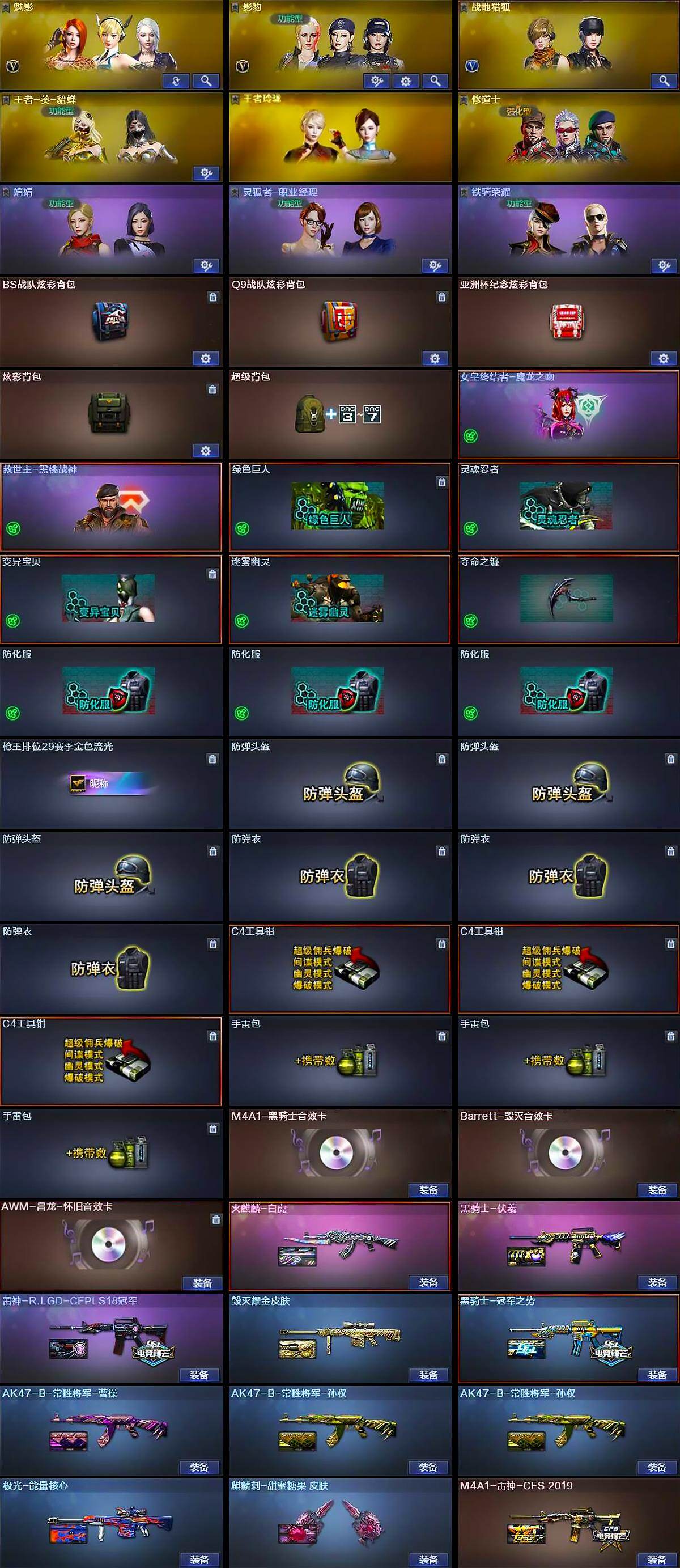 【道具】:BS战队炫彩背包,Q9战队炫彩背包,亚洲杯纪念炫彩背包,炫彩背包,超级背包,女皇终结者-魔龙之吻,救世主-黑桃战神,绿色巨人,灵魂忍者,变异宝贝,迷雾幽灵,夺命之镰,防化服*3,枪王排位29赛季金色流光,防弹头盔*3,防弹衣*3,C4工具钳*3,手雷包*3