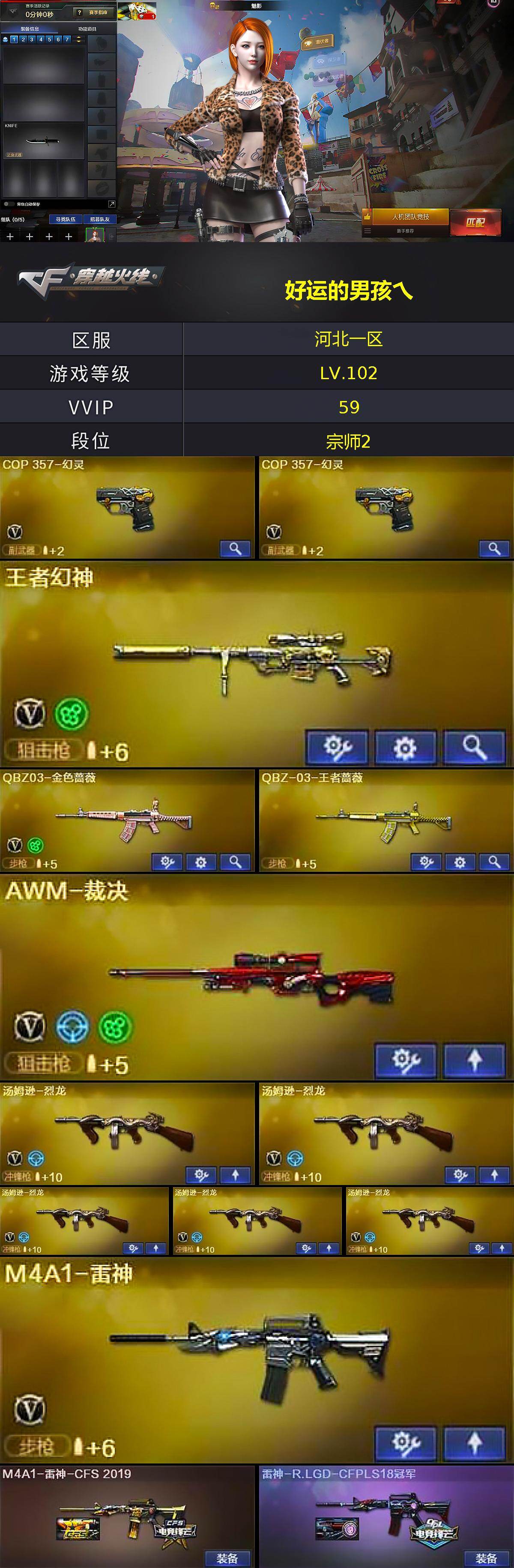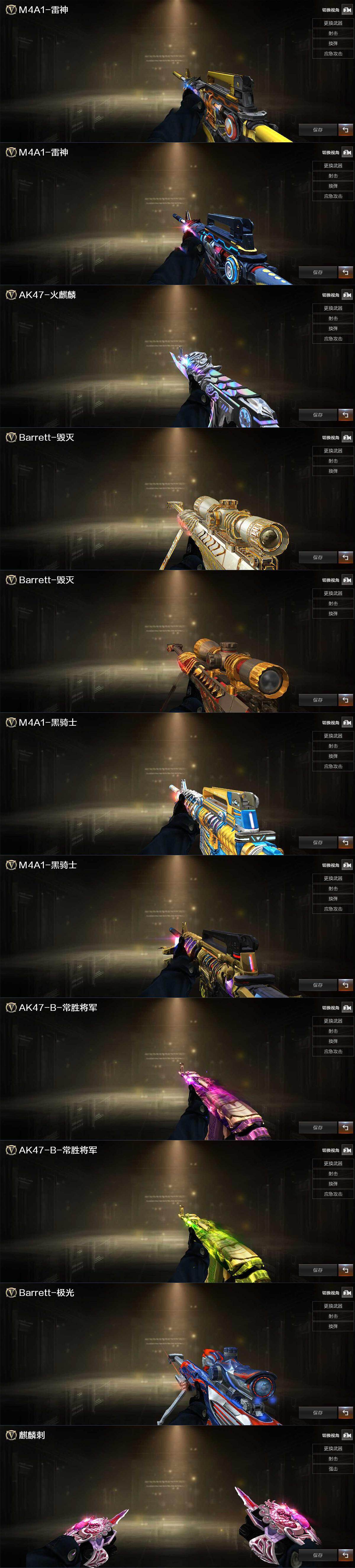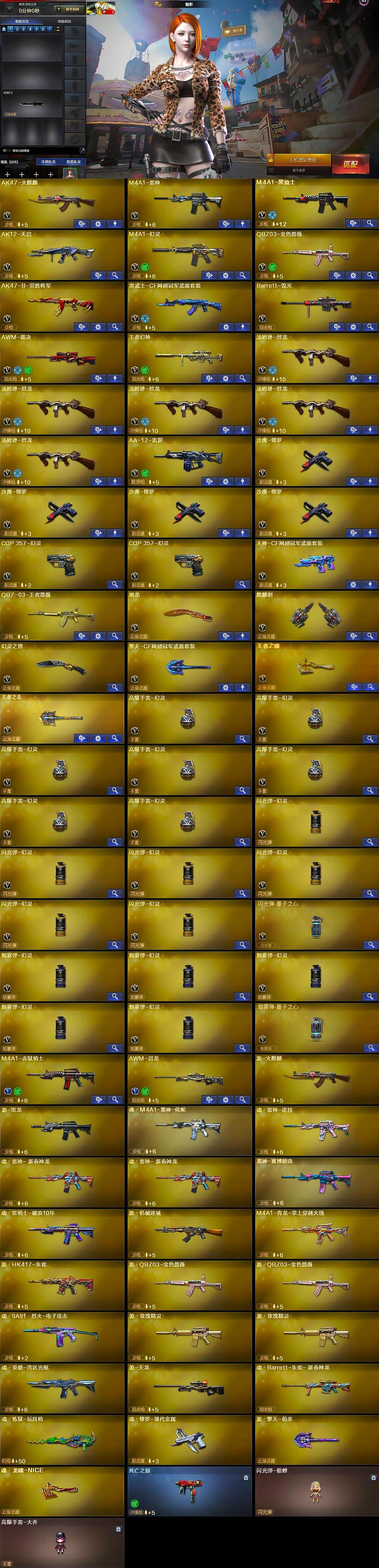 【英雄级武器】:AK47-火麒麟,M4A1-雷神,M4A1-黑骑士,AK12-天启,M4A1-幻灵,QBZ03-金色蔷薇,AK47-B-常胜将军,黑武士-CF网剧冠军,Barrett-毁灭,AWM-裁决,王者幻神-觉醒版,汤姆逊-烈龙*5,AA-12-雷霆,沙鹰-修罗*4,COP 357-幻灵*2,天神-CF网剧冠军,屠龙,麒麟刺,幻灵之锋,擎天-CF网剧冠军,王者之啸-觉醒版,王者之击-觉醒版,高爆手雷-幻灵*7,闪光弹-幻灵*6,闪光弹-量子之心,烟雾弹-幻灵*5,烟雾弹-量子之心,M4A1-赤狱骑士,AWM-昌龙