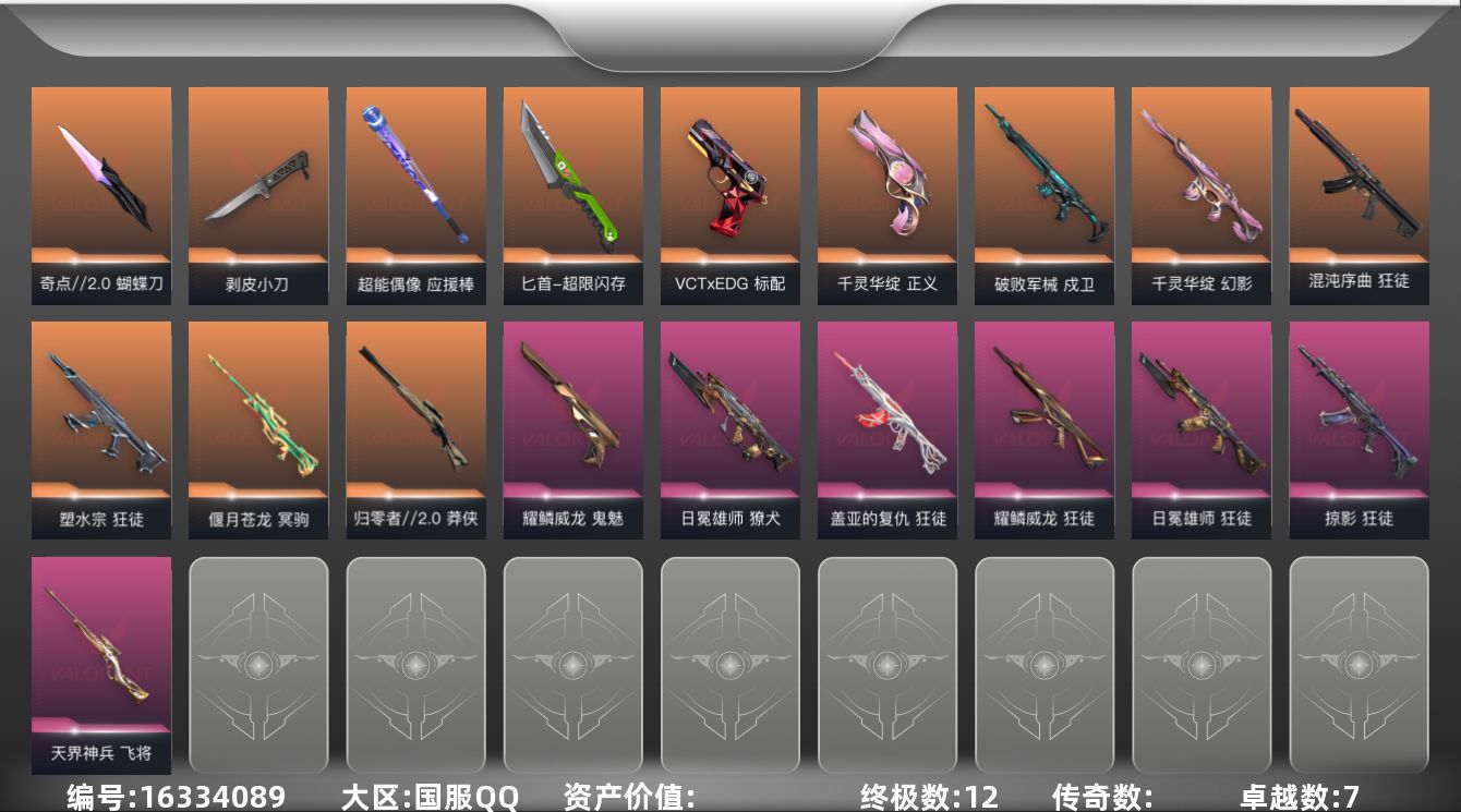 [16334089]【套装】:VCTxEDG 队伍套装 【英雄】:幻棱,炼狱,维斯,暮蝶,钛狐,壹决,铁臂,捷风,雷兹,幽影,不死鸟,贤者,猎枭,蝰蛇,零,芮娜,奇乐,尚勃勒,霓虹,斯凯,夜露,星礈,K/O,海神,盖可,黑梦,钢锁 【近战武器】:近战武器-剥皮小刀,近战武器-奇点//2.0 蝴蝶刀,近战武器-超能偶像 应援棒,近战武器-超限闪存 匕首 【狂徒】:狂徒-混沌序曲,狂徒-塑水宗,狂徒-掠影,狂徒-盖亚的复仇,狂徒-日冕雄师,狂徒-耀鳞威龙,狂徒-超能偶像,狂徒-流星兵团 【幻影】:幻影-千灵华绽,幻影-超限闪存,幻影-神圣领域,幻影-聚合之力 【戍卫】:戍卫-破败军械,戍卫-超能偶像,戍卫-浮光跃金,戍卫-战术熊与伙伴们,戍卫-月球哨兵 【獠犬】:獠犬-日冕雄师,獠犬-神圣领域,獠犬-采蜜小蜂队,獠犬-模拟赫兹 【冥驹】:冥驹-偃月苍龙,冥驹-模拟赫兹,冥驹-星云暗涌 【飞将】:飞将-天界神兵,飞将-聚合之力,飞将-战术熊与伙伴们 【莽侠】:莽侠-归零者//2.0,莽侠-超限闪存,莽侠-纤云弄巧,莽侠-月球哨兵 【战神】:战神-神圣领域,战神-采蜜小蜂队,战神-浮光跃金 【奥丁】:奥丁-流星兵团 【判官】:判官-超能偶像,判官-采蜜小蜂队 【雄鹿】:雄鹿-模拟赫兹,雄鹿-月球哨兵 【骇灵】:骇灵-流星兵团,骇灵-浮光跃金,骇灵-星云暗涌 【蜂刺】:蜂刺-超限闪存,蜂刺-聚合之力,蜂刺-纤云弄巧,蜂刺-星云暗涌 【标配】:标配-超能偶像,标配-浮光跃金,标配-战术熊与伙伴们 【VCT手枪】:标配-VCT x EDG 【正义】:正义-千灵华绽,正义-超限闪存,正义-纳米打击,正义-纤云弄巧,正义-月球哨兵 【鬼魅】:鬼魅-耀鳞威龙,鬼魅-采蜜小蜂队,鬼魅-灵魂消声者,鬼魅-模拟赫兹 【狂怒】:狂怒-神圣领域,狂怒-聚合之力,狂怒-战术熊与伙伴们 【短炮】:短炮-纤云弄巧 【卡面】:终章:激斗汉堡 卡面,进入射程 卡面,《双城之战》拥抱 卡面,精灵大战 卡面,欢迎来到底城 卡面,南瓜盛典 卡面,VCT CN首冠 卡面,唱片的故事 卡面,钢弓与箭弦 卡面,排除故障 卡面,战术桌游 卡面,悠享食光 卡面,修车达人 卡面,热舞环节 卡面,模拟赫兹 卡面,浮光跃金 卡面,超限闪存 卡面,维斯工牌 卡面,正义的化身 卡面,终章:生意人麦宝 卡面,铁之华 卡面,失而复得 卡面,时间到 卡面