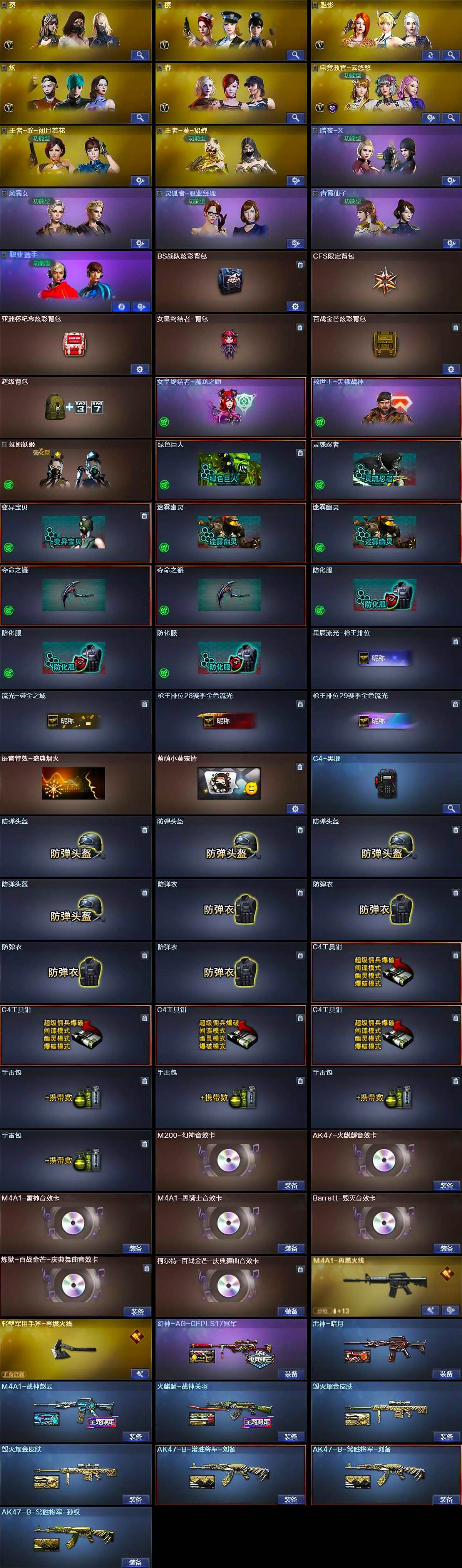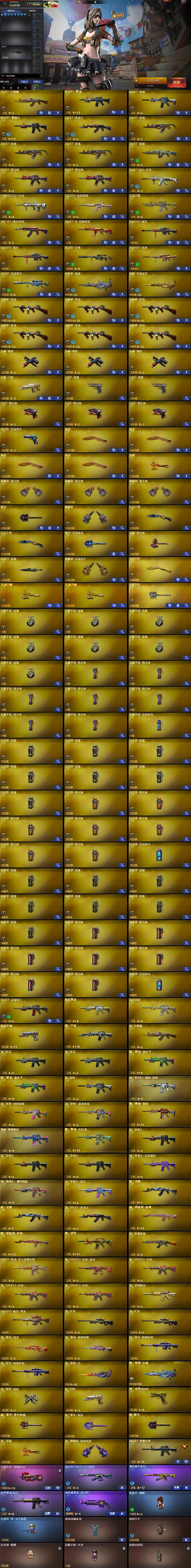 【英雄级武器】:AK47-火麒麟,M4A1-黑龙,M4A1-雷神,M4A1-黑骑士,AK47-黑武士,AK47-黑鲨*3,AK47-雷暴,M4A1-堕天神*2,Scar Light-白虎,FAMAS G2-天戎,QBZ03-金色蔷薇,王者之戮-觉醒版,AK-47-猩红传说,AK47-B-常胜将军,Barrett-毁灭*2,M200-幻神,Barrett-朱雀,M200-竞技荣光,加特林-炼狱,炼狱-百战金芒,汤姆逊-烈龙*6,沙鹰-修罗*3,沙鹰-天神,USP-雷暴*2,COP-堕天神*3,柯尔特-竞技荣光,屠龙*4,龙啸,麒麟刺-堕天神*3,擎天,麒麟刺,幻灵之锋*2,擎天-竞技荣光,龙啸-堕天神,斩神刀-雷暴,麒麟刺-百战金芒,王者之锋-觉醒版,王者之啸-觉醒版*2,王者之击-觉醒版,高爆手雷-雷暴*7,高爆手雷-堕天神*7,高爆手雷-竞技荣光,闪光弹-雷暴*7,闪光弹-堕天神*7,闪光弹-竞技荣光,烟雾弹-雷暴*7,烟雾弹-