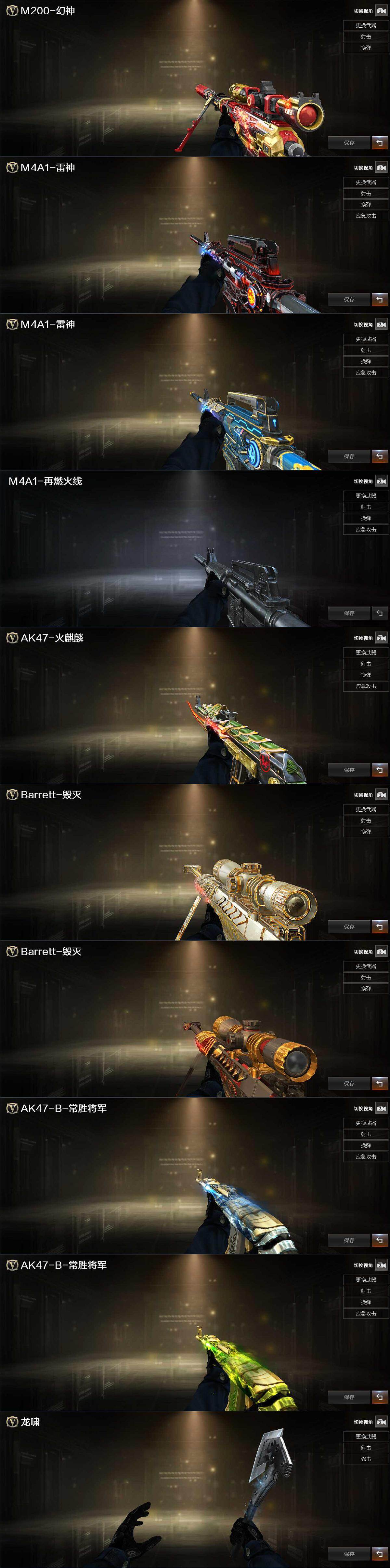 【音效卡】:M200-幻神音效卡,AK47-火麒麟音效卡,M4A1-雷神音效卡,M4A1-黑骑士音效卡,Barrett-毁灭音效卡,炼狱-百战金芒-庆典舞曲音效卡,柯尔特-百战金芒-庆典舞曲音效卡
