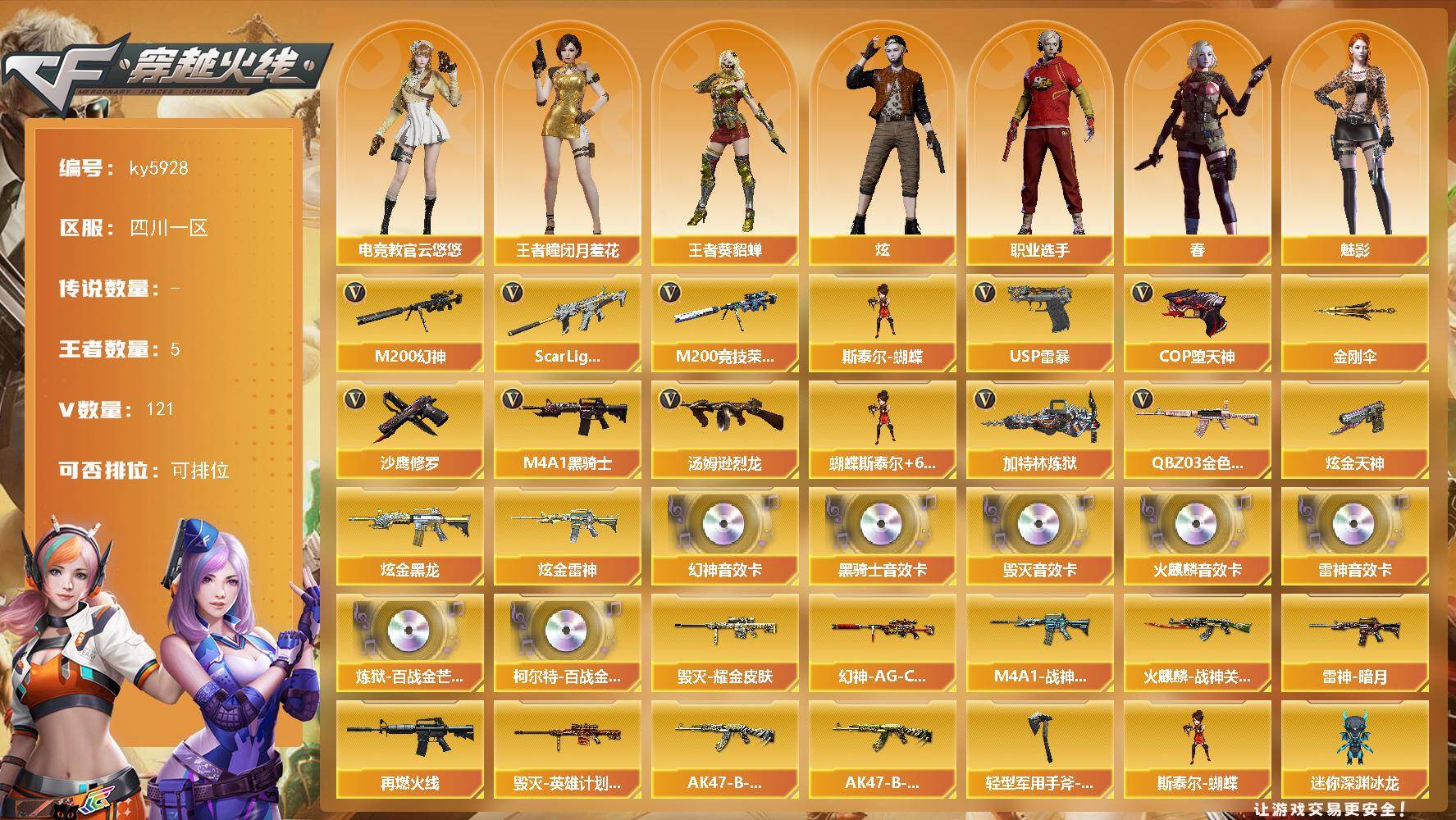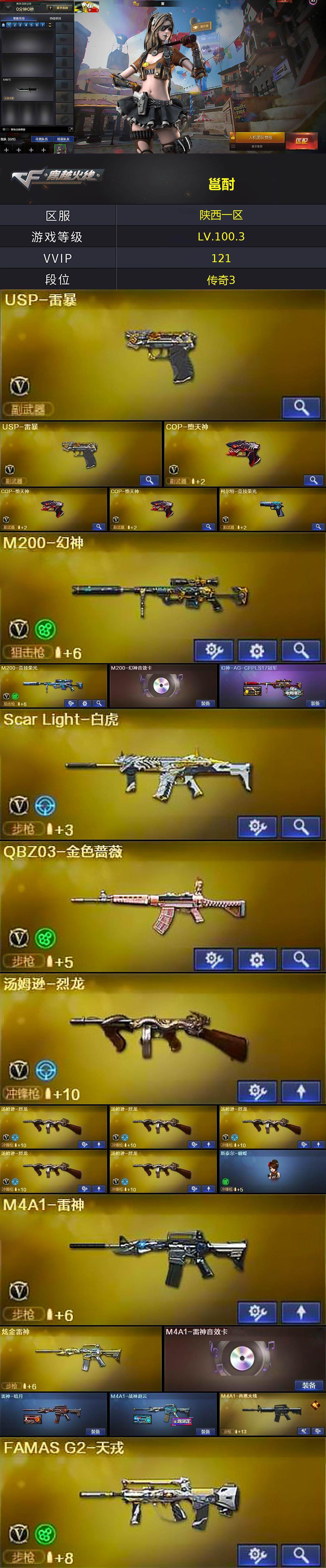 [17070941]陕西一区-128V-5王者武器数-3炫金武器数 【热门武器】:QBZ03-金色蔷薇,Scar Light-白虎,M200-幻神,M200-竞技荣光,M4A1-黑骑士,汤姆逊-烈龙*6,加特林-炼狱,斯泰尔-蝴蝶,USP-雷暴*2,COP-堕天神*3,沙鹰-修罗*3,金刚伞 【王者炫金武器】:炫金黑龙,炫金雷神,炫金天神 【音效卡】:M200-幻神音效卡,AK47-火麒麟音效卡,M4A1-雷神音效卡,M4A1-黑骑士音效卡,Barrett-毁灭音效卡,炼狱-百战金芒-庆典舞曲音效卡,柯尔特-百战金芒-庆典舞曲音效卡 【皮肤】:幻神-AG-CFPLS17冠军,雷神-暗月,M4A1-战神赵云,M4A1-再燃火线,火麒麟-战神关羽,毁灭耀金皮肤*2,毁灭-英雄计划 皮肤,AK47-B-常胜将军-刘备*2,AK47-B-常胜将军-孙权,轻型军用手斧-再燃火线 【角色】:葵,樱,魅影,炫,春,电竞教官-云悠悠,王者-瞳-闭月羞花,王者-葵-貂蝉,暗夜-X,风暴女,灵狐者-职业经理,青霞仙子,职业选手 【人偶武器】:斯泰尔-蝴蝶,巴雷特-零-水下丽影,迷你深渊冰龙,迷你牛牛,闪光弹-貂蝉,高爆手雷-大乔 【暴走生化】:超级对讲机 【挑战大师】:火狱乱世-超越Max,激光毁灭者III-白马银枪,激光毁灭者III,机甲撕裂者III,神圣爆裂者-末日III 【英雄级武器】:AK47-火麒麟,M4A1-黑龙,M4A1-雷神,M4A1-黑骑士,AK47-黑武士,AK47-黑鲨*3,AK47-雷暴,M4A1-堕天神*2,Scar Light-白虎,FAMAS G2-天戎,QBZ03-金色蔷薇,王者之戮-觉醒版,AK-47-猩红传说,AK47-B-常胜将军,Barrett-毁灭*2,M200-幻神,Barrett-朱雀,M200-竞技荣光,加特林-炼狱,炼狱-百战金芒,汤姆逊-烈龙*6,沙鹰-修罗*3,沙鹰-天神,USP-雷暴*2,COP-堕天神*3,柯尔特-竞技荣光,屠龙*4,龙啸,麒麟刺-堕天神*3,擎天,麒麟刺,幻灵之锋*2,擎天-竞技荣光,龙啸-堕天神,斩神刀-雷暴,麒麟刺-百战金芒,王者之锋-觉醒版,王者之啸-觉醒版*2,王者之击-觉醒版,高爆手雷-雷暴*7,高爆手雷-堕天神*7,高爆手雷-竞技荣光,闪光弹-雷暴*7,闪光弹-堕天神*7,闪光弹-竞技荣光,烟雾弹-雷暴*7,烟雾弹-