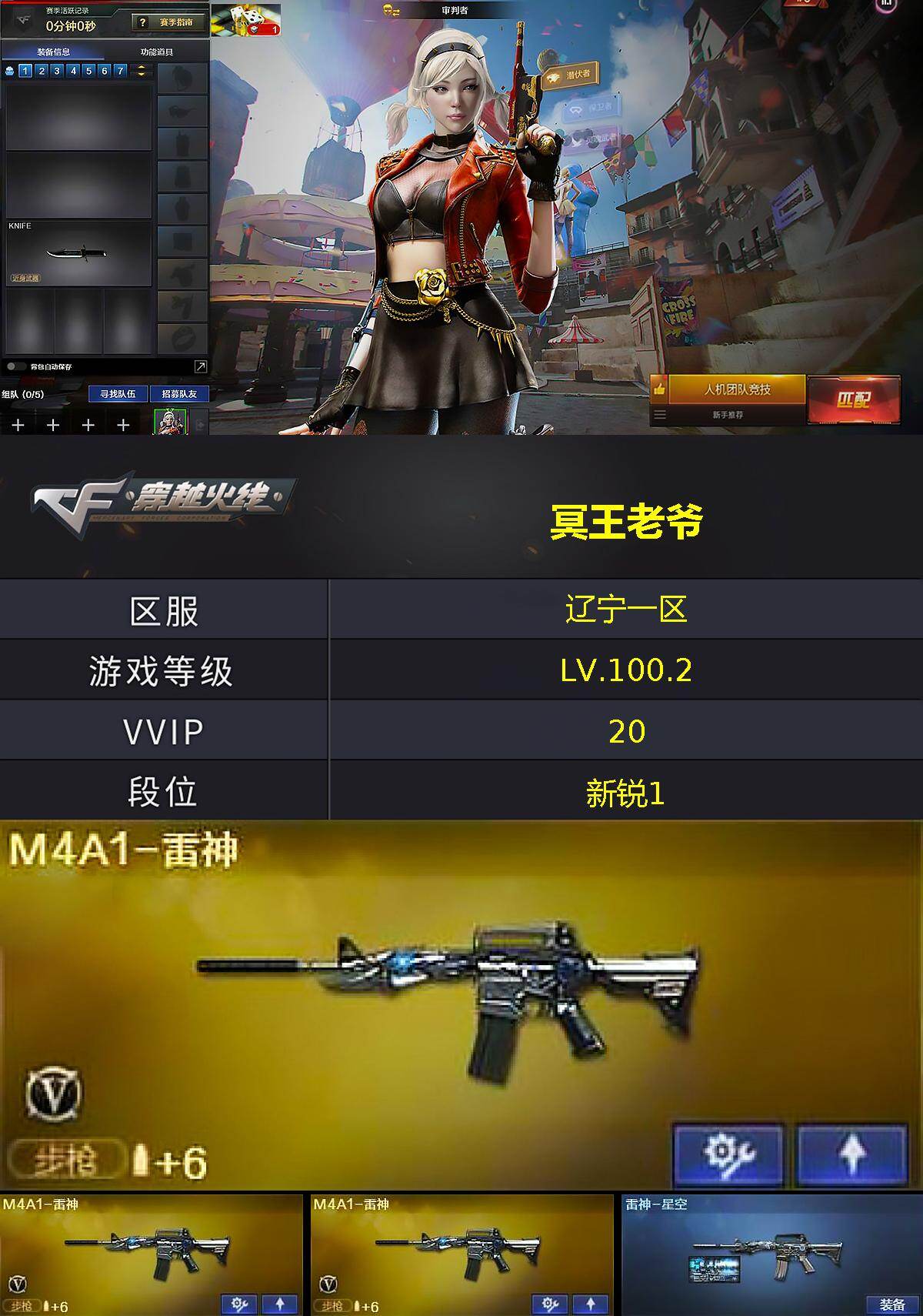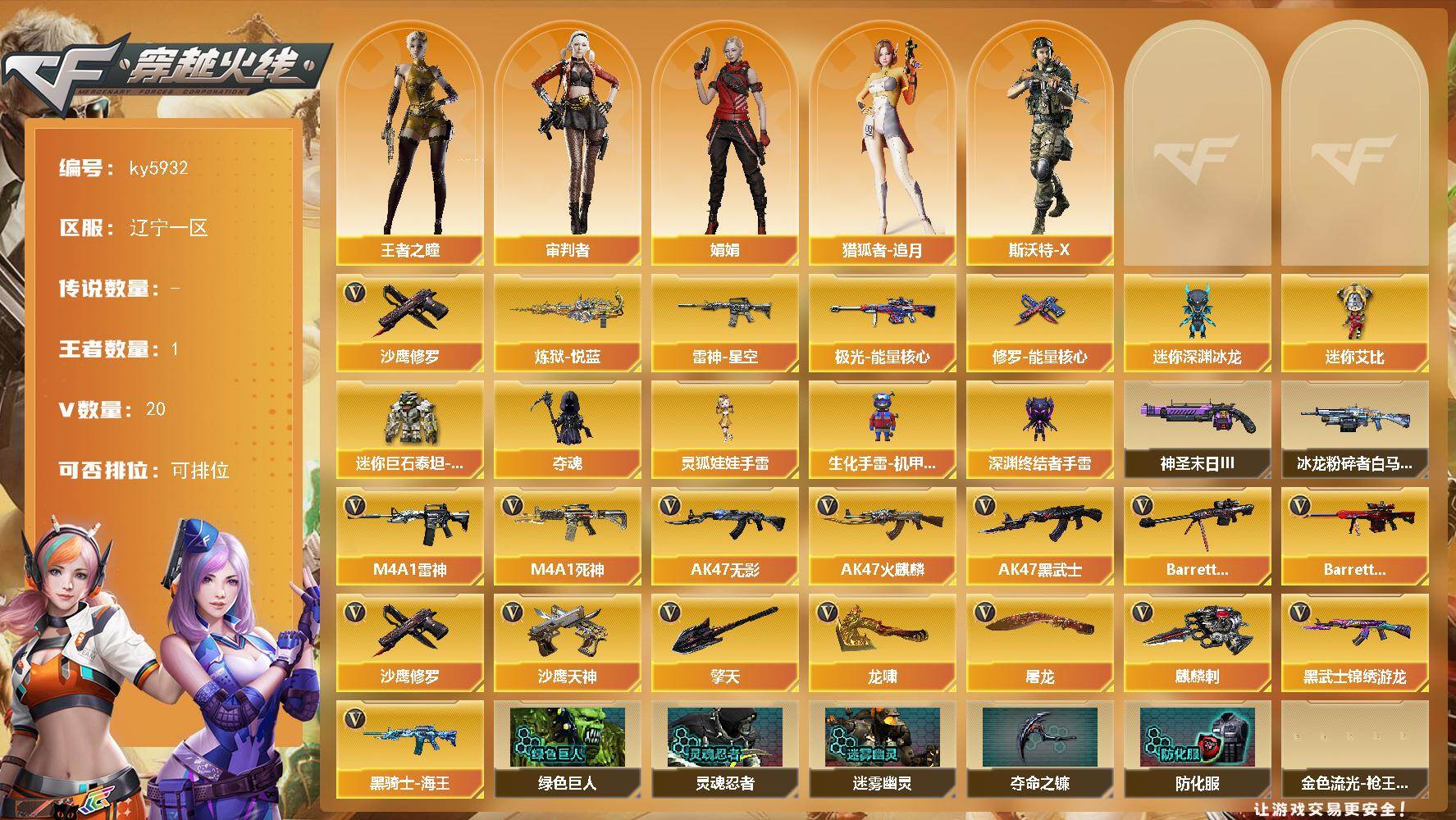[17071595]辽宁一区-20V-1王者武器数-0炫金武器数 【热门武器】:沙鹰-修罗*2 【王者炫金武器】:炼狱-悦蓝 【皮肤】:雷神-星空,极光-能量核心,修罗-能量核心 【角色】:审判者,王者之瞳,娟娟,猎狐者-追月,斯沃特-X 【人偶武器】:迷你深渊冰龙,夺魂,生化手雷-机甲核心,深渊终结者手雷,迷你艾比,迷你巨石泰坦-魔花研究所,灵狐娃娃手雷 【挑战大师】:冰龙粉碎者-白马银枪,神圣爆裂者-末日III 【英雄级武器】:AK47-火麒麟,M4A1-雷神*3,AK47-无影,M4A1-死神,AK47-黑武士,黑武士-锦绣游龙,黑骑士-海王,Barrett-毁灭,Barrett-极光,沙鹰-修罗*2,沙鹰-天神*2,屠龙,龙啸,擎天,麒麟刺 【道具】:绿色巨人,灵魂忍者,迷雾幽灵,夺命之镰,防化服*2,金色流光-枪王排位,星辰流光-枪王排位,枪王排位28赛季金色流光,防弹头盔*3,防弹衣*4,C4工具钳*2,手雷包*2 【特殊枪械】:
