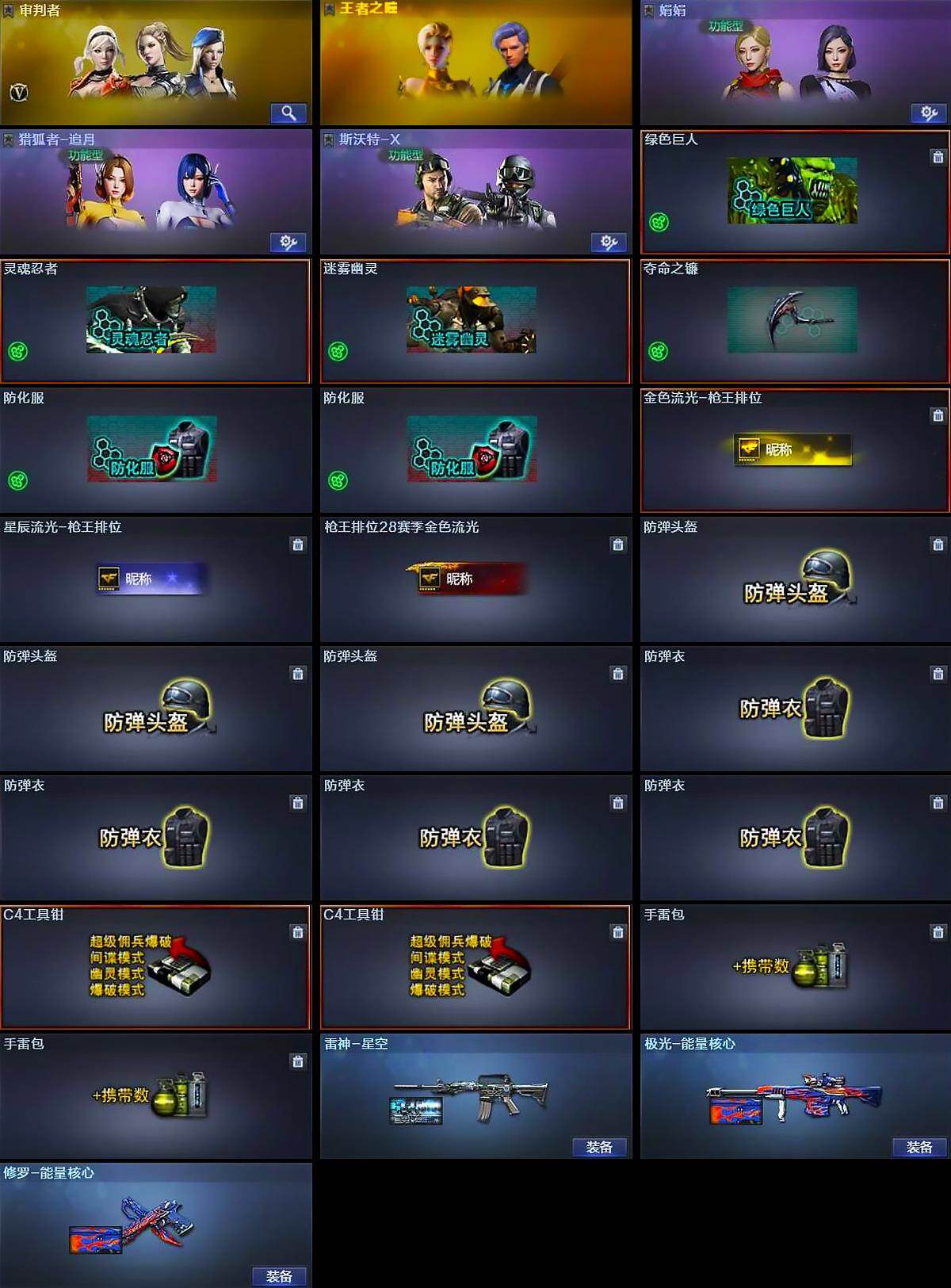 【道具】:绿色巨人,灵魂忍者,迷雾幽灵,夺命之镰,防化服*2,金色流光-枪王排位,星辰流光-枪王排位,枪王排位28赛季金色流光,防弹头盔*3,防弹衣*4,C4工具钳*2,手雷包*2
