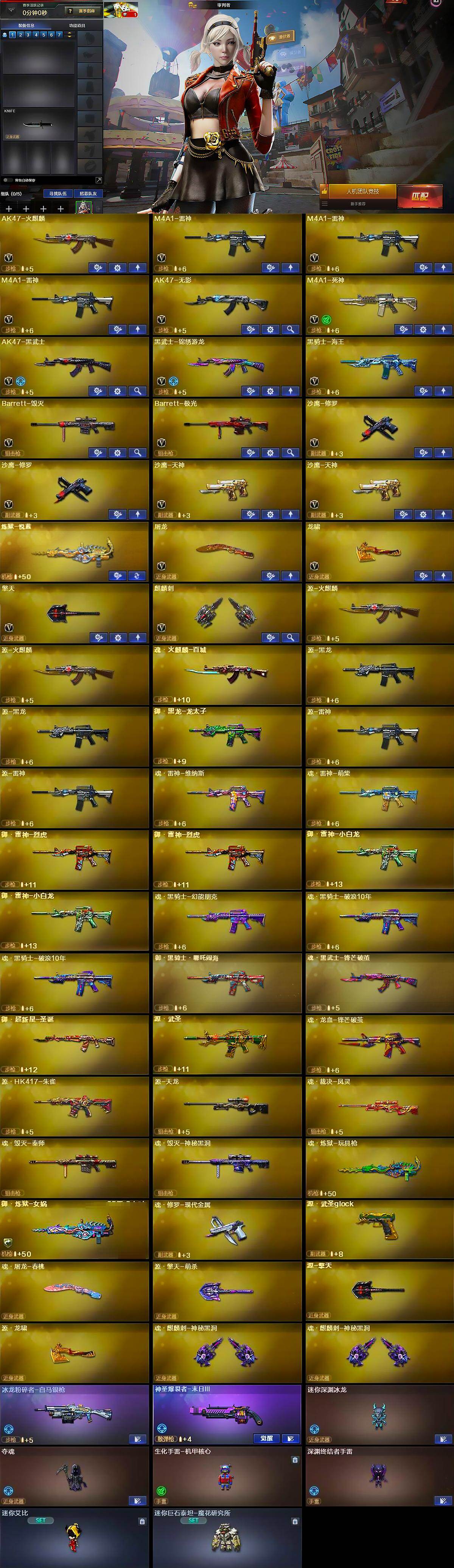 【英雄级武器】:AK47-火麒麟,M4A1-雷神*3,AK47-无影,M4A1-死神,AK47-黑武士,黑武士-锦绣游龙,黑骑士-海王,Barrett-毁灭,Barrett-极光,沙鹰-修罗*2,沙鹰-天神*2,屠龙,龙啸,擎天,麒麟刺