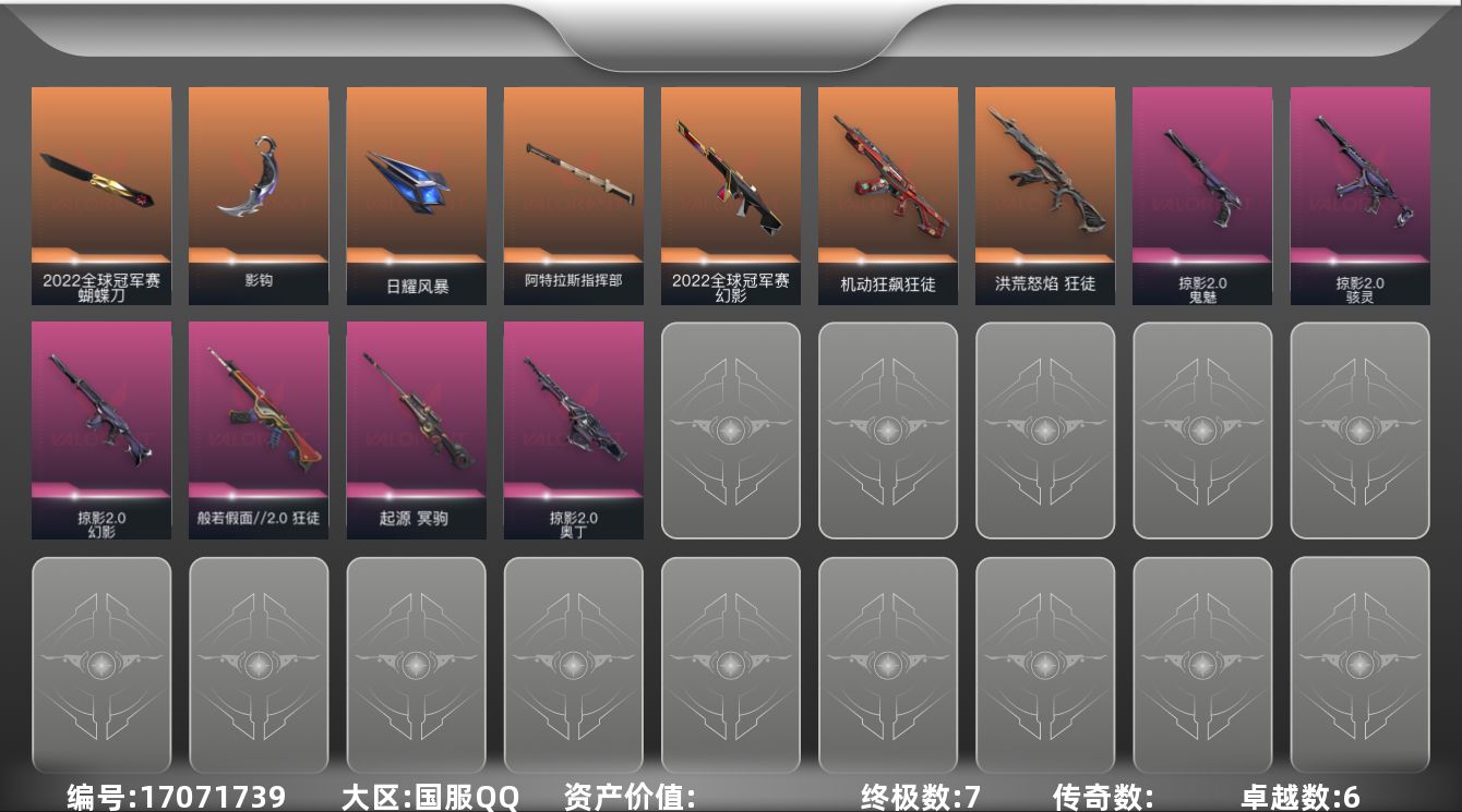[17071739]【套装】:2022全球冠军赛套装,掠影//2.0套装 【英雄】:炼狱,暮蝶,壹决,铁臂,捷风,雷兹,幽影,不死鸟,贤者,猎枭,零,芮娜,奇乐,尚勃勒,夜露,K/O,黑梦 【近战 武器】:近战武器-2022全球冠军赛 蝴蝶刀,近战武器-影钩,近战武器-日耀风暴 遗器,近战武器-阿特拉斯指挥部 甩棍 【狂徒】:狂徒-洪荒怒焰,狂徒-机动狂飙,狂徒-般若假面//2.0,狂徒-超越极限 【幻影】:幻影-2022全球冠军赛,幻影-掠影//2.0 【冥驹】:冥驹-起源 【奥丁】:奥丁-掠影//2.0 【骇灵】:骇灵-掠影//2.0 【鬼魅】:鬼魅-掠影//2.0 【卡面】:树懒大作战 卡面,Clutch 卡面,无垠星环 卡面,《双城之战》金克丝 卡面,钢锁vs盖可 卡面,代号红色 卡面,新兵报到 卡面,V契约 卡面,无畏契约 卡面 【喷漆】:霓光四射 喷漆,关门放狗 喷漆,胜利属于无畏契约 喷漆,GLHF 喷漆,无畏契约 喷漆 【挂饰】:无畏契约GO!第一卷 零 挂饰,无畏契约 纪念币 挂饰