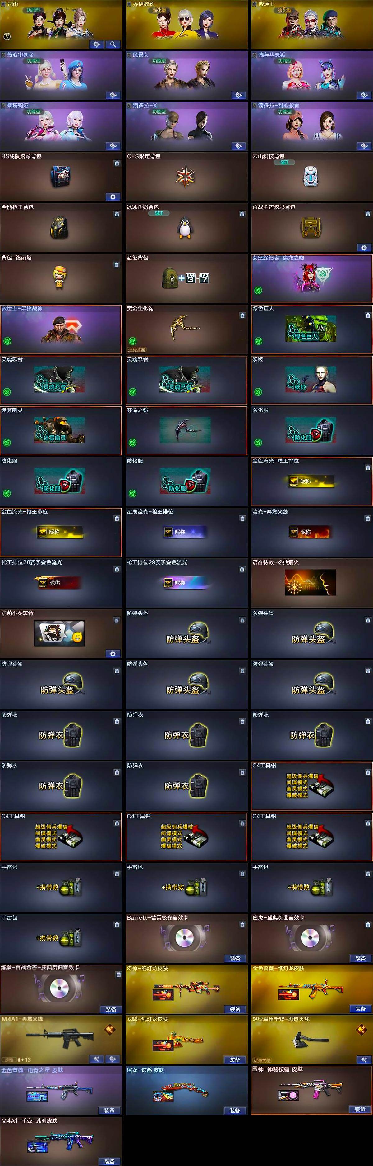 【道具】:BS战队炫彩背包,CFS限定背包,云山科技背包,全能枪王背包,冰冰企鹅背包,百战金芒炫彩背包,背包-洛丽塔,超级背包,女皇终结者-魔龙之吻,救世主-黑桃战神,黄金生化钩,绿色巨人,灵魂忍者*2,妖姬,迷雾幽灵,夺命之镰,防化服*3,金色流光-枪王排位*2,星辰流光-枪王排位,流光-再燃火线,枪王排位28赛季金色流光,枪王排位29赛季金色流光,语音特效-盛典烟火,萌萌小葵表情,防弹头盔*5,防弹衣*5,C4工具钳*4,手雷包*4