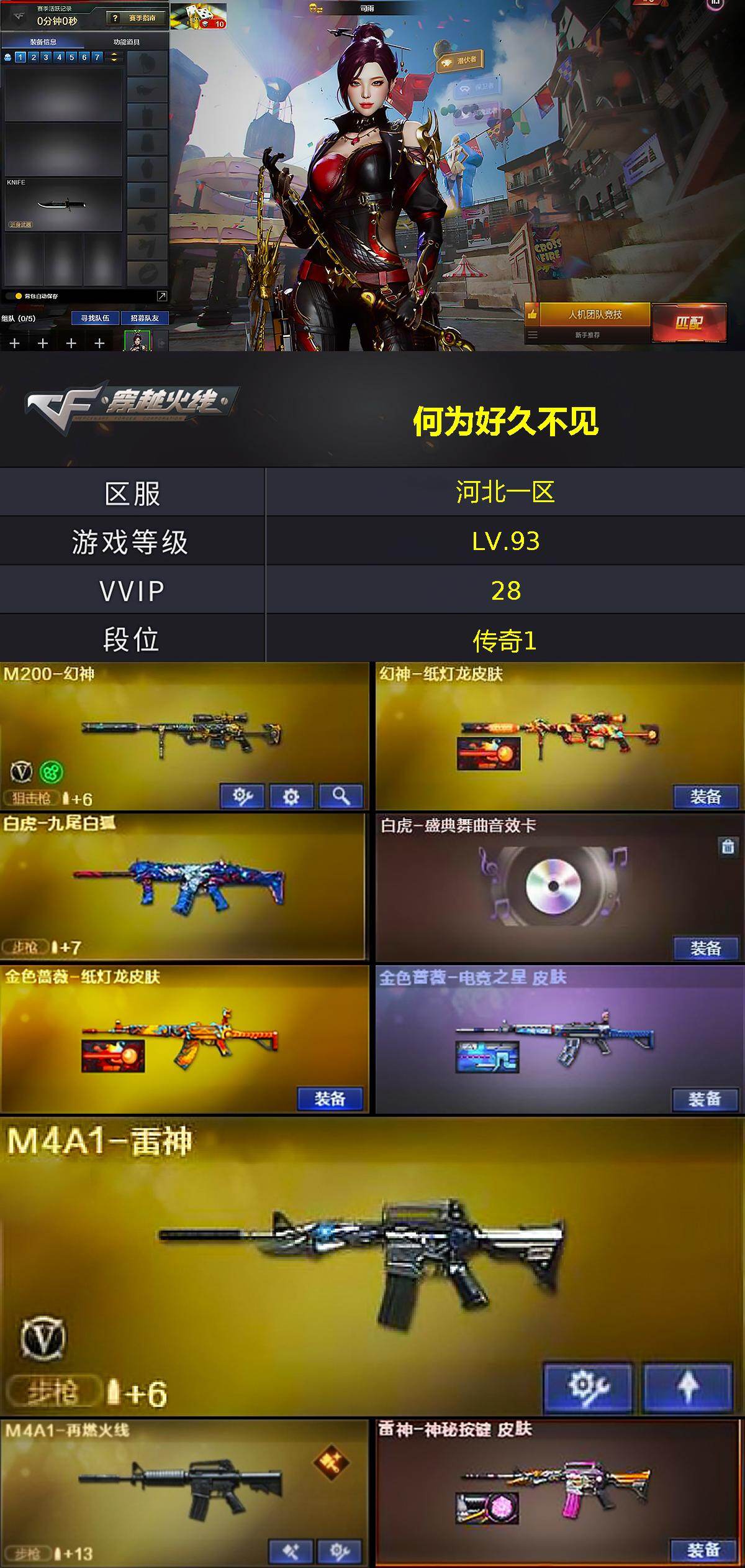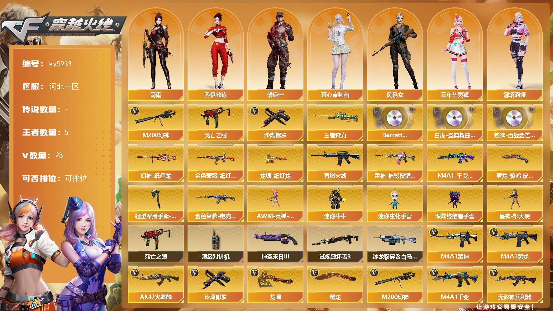 [17071781]河北一区-35V-5王者武器数-0炫金武器数 【热门武器】:M200-幻神,死亡之眼,沙鹰-修罗*2 【王者炫金武器】:王者森力 【音效卡】:Barrett-碧霄极光音效卡,白虎-盛典舞曲音效卡,炼狱-百战金芒-庆典舞曲音效卡 【皮肤】:幻神-纸灯龙皮肤,金色蔷薇-纸灯龙皮肤,金色蔷薇-电竞之星 皮肤,M4A1-再燃火线,雷神-神秘按键 皮肤,M4A1-千变-孔明皮肤,屠龙-惊鸿 皮肤,龙啸-纸灯龙皮肤,轻型军用手斧-再燃火线 【角色】:司雨,乔伊教练,修道士,芳心审判者,风暴女,嘉年华灵狐,疾风,娜塔莉娅,潘多拉-X,潘多拉-甜心教官,兔囡囡 【人偶武器】:星神-炽天使,AWM-灵狐-15周年嘉年华*2,迷你牛牛,迷你生化手雷,深渊终结者手雷 【暴走生化】:死亡之眼,超级对讲机 【挑战大师】:冰龙粉碎者-白马银枪*2,试炼破坏者III,神圣爆裂者-末日III 【英雄级武器】:M4A1-千变,AK47-火麒麟,M4A1-黑龙,M4A1-雷神,无影-神兵利器,黑武士-锦绣游龙,QBZ03-独角-V,M200-幻神,炼狱-百战金芒,沙鹰-修罗*2,屠龙,龙啸*3,麒麟刺-百战金芒,闪光弹-雷霆王者-觉醒版*2,烟雾弹-雷霆王者-觉醒版,M4A1-赤狱骑士,M4A1-苍鸣雷神,Barrett-碧霄极光*2 【道具】:BS战队炫彩背包,CFS限定背包,云山科技背包,全能枪王背包,冰冰企鹅背包,百战金芒炫彩背包,背包-洛丽塔,超级背包,女皇终结者-魔龙之吻,救世主-黑桃战神,黄金生化钩,绿色巨人,灵魂忍者*2,妖姬,迷雾幽灵,夺命之镰,防化服*3,金色流光-枪王排位*2,星辰流光-枪王排位,流光-再燃火线,枪王排位28赛季金色流光,枪王排位29赛季金色流光,语音特效-盛典烟火,萌萌小葵表情,防弹头盔*5,防弹衣*5,C4工具钳*4,手雷包*4 【特殊枪械】: