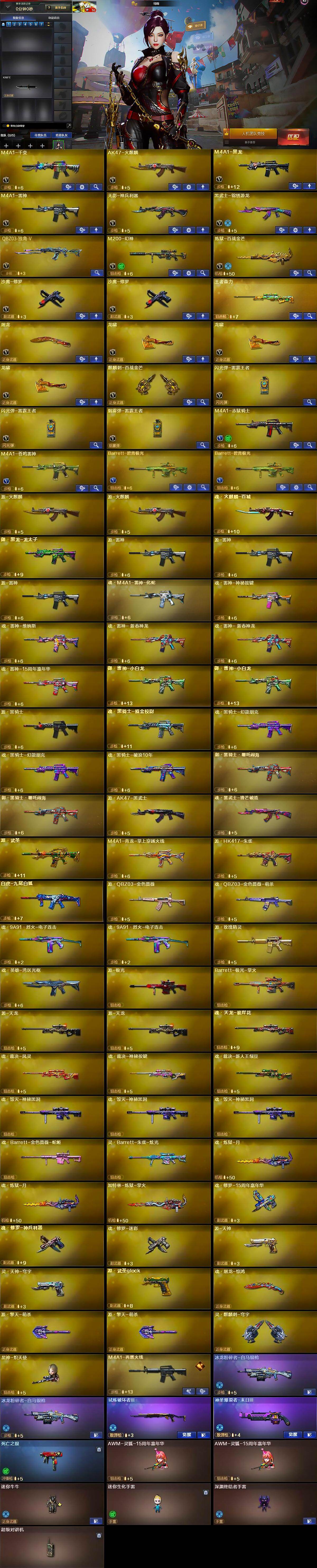 【英雄级武器】:M4A1-千变,AK47-火麒麟,M4A1-黑龙,M4A1-雷神,无影-神兵利器,黑武士-锦绣游龙,QBZ03-独角-V,M200-幻神,炼狱-百战金芒,沙鹰-修罗*2,屠龙,龙啸*3,麒麟刺-百战金芒,闪光弹-雷霆王者-觉醒版*2,烟雾弹-雷霆王者-觉醒版,M4A1-赤狱骑士,M4A1-苍鸣雷神,Barrett-碧霄极光*2