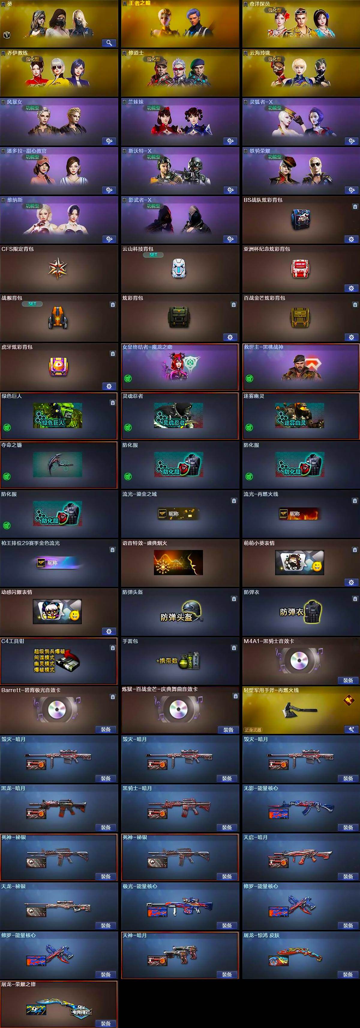 【道具】:BS战队炫彩背包,CFS限定背包,云山科技背包,亚洲杯纪念炫彩背包,战舰背包,炫彩背包,百战金芒炫彩背包,虎牙炫彩背包,女皇终结者-魔龙之吻,救世主-黑桃战神,绿色巨人,灵魂忍者,迷雾幽灵,夺命之镰,防化服*3,流光-鎏金之域,流光-再燃火线,枪王排位29赛季金色流光,语音特效-盛典烟火,萌萌小葵表情,动感闪耀表情,防弹头盔,防弹衣,C4工具钳,手雷包